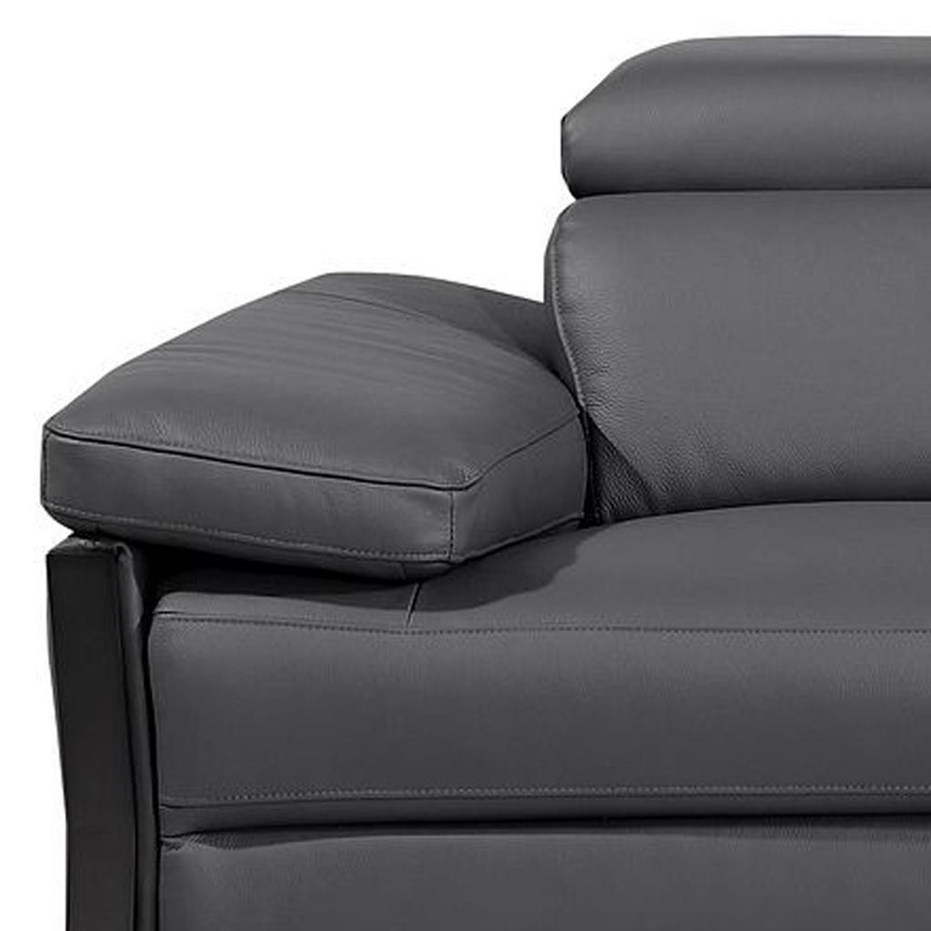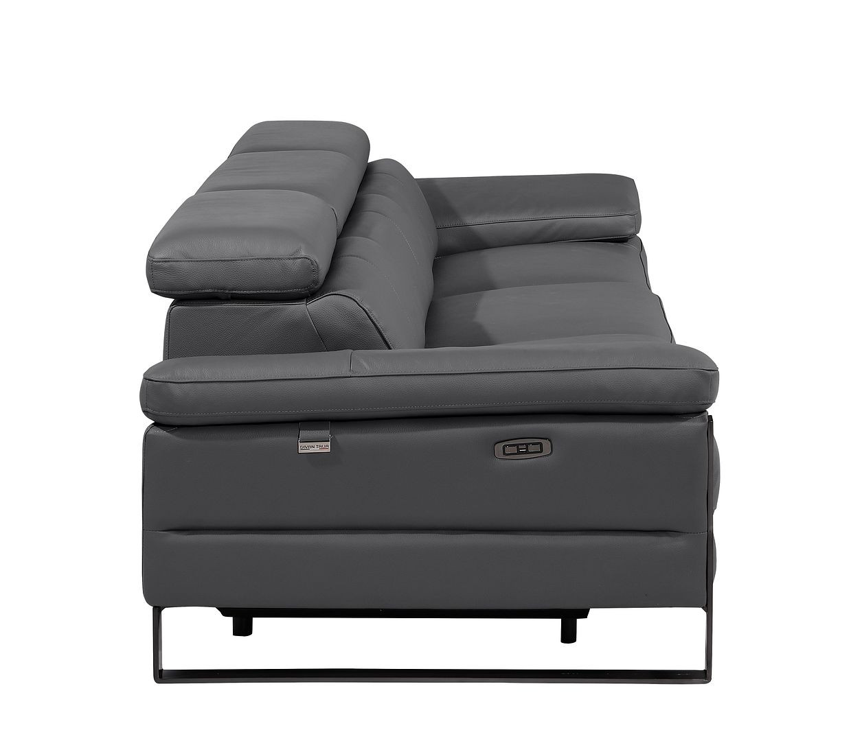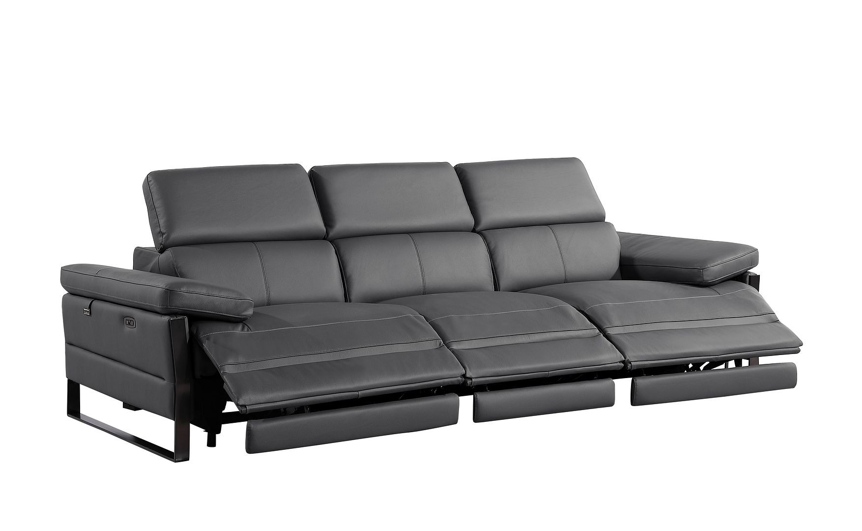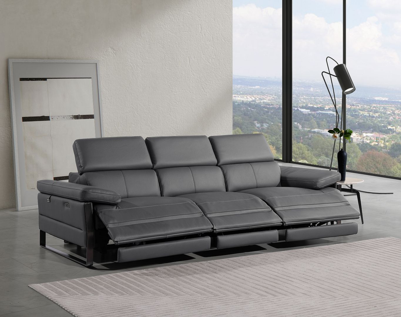 Superior construction from fabulously soft and high grade leather gives this 103-inch dark gray top grain leather reclining metal usb sofa a leg up on the competition. The premium leather used makes your lounging luxuriously comfortable and adds an elegant appeal to your space. Solid colors give you lots of decorative options and are easy to work into your decor scheme. Pocket spring construction gives this piece strong support and makes it comfortable to sit even for long periods of time. Rolled arms offer a comfy place to rest. Black stainless steel legs effortlessly elevate the room and add a touch of contemporary design. A great showpiece for your room, this sofa is a must have. 31.00-inch h x 104.00-inch w x 43.00-inch d.