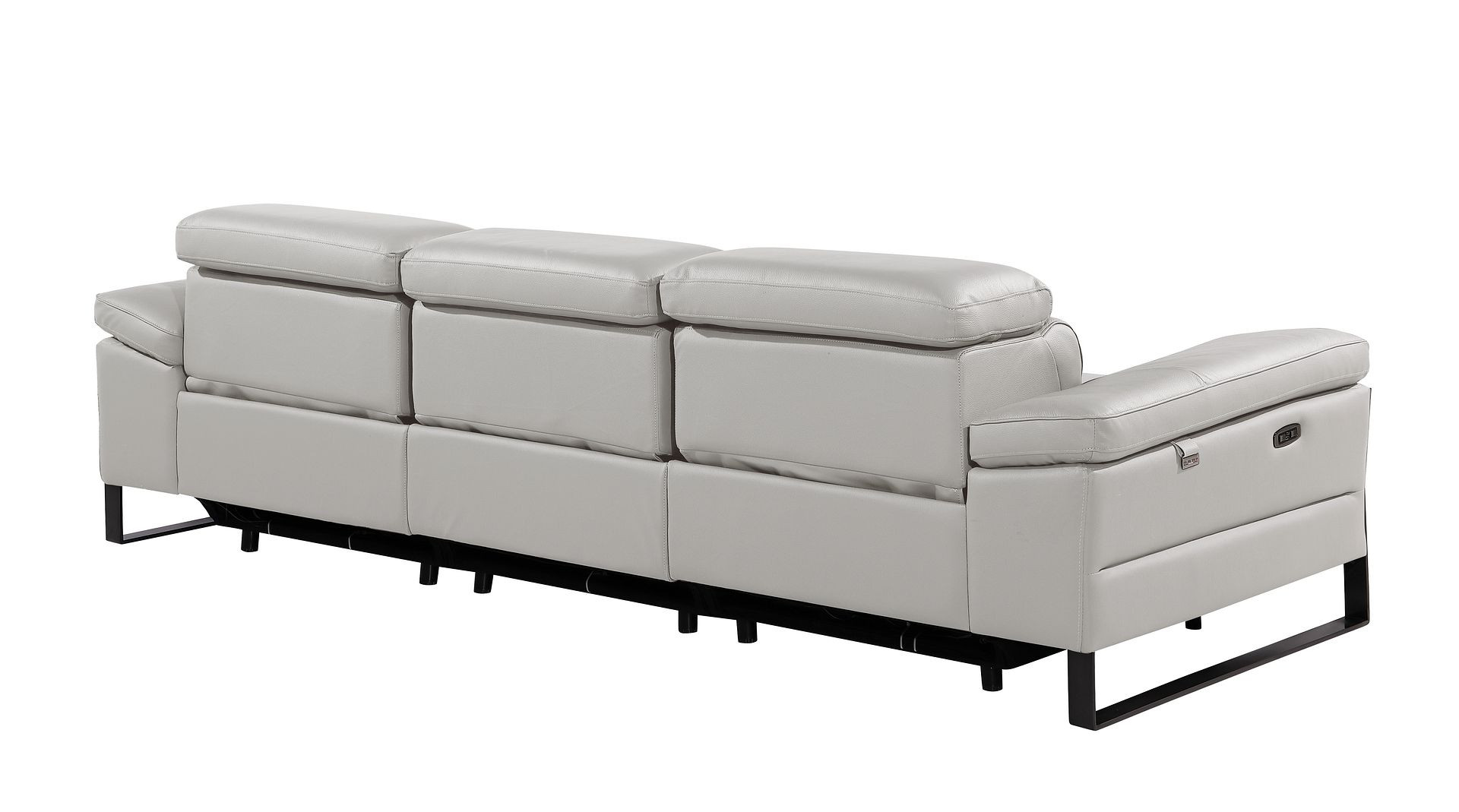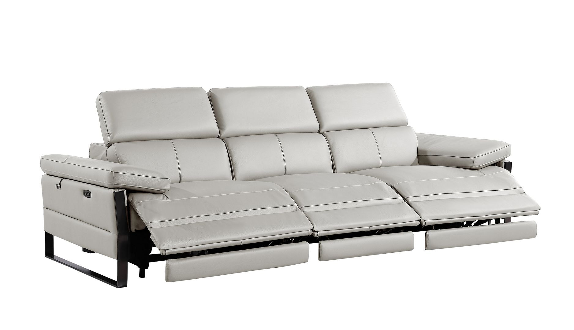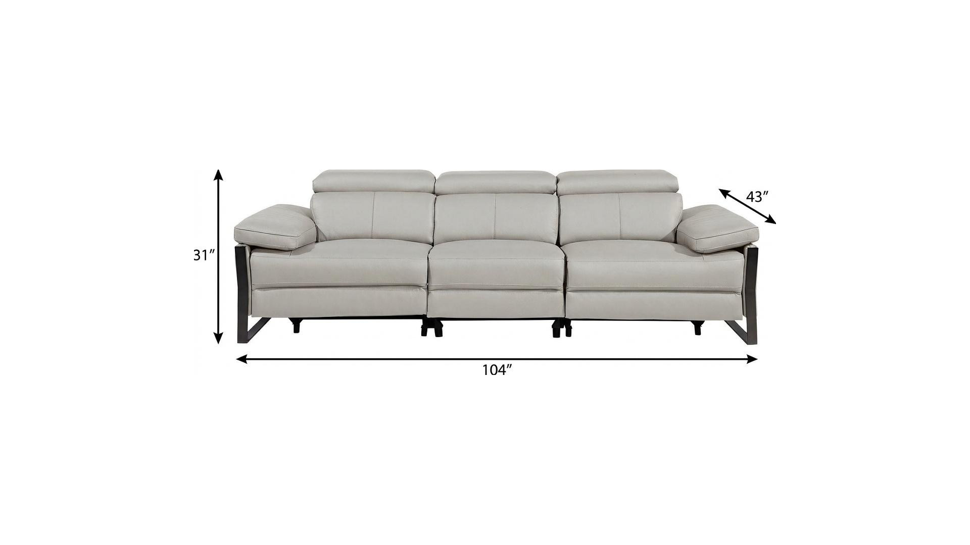 Superior construction from fabulously soft and high grade leather gives this 103-inch light gray top grain leather reclining metal usb sofa a leg up on the competition. The premium leather used makes your lounging luxuriously comfortable and adds an elegant appeal to your space. Solid colors give you lots of decorative options and are easy to work into your decor scheme. Pocket spring construction gives this piece strong support and makes it comfortable to sit even for long periods of time. Rolled arms offer a comfy place to rest. Black stainless steel legs effortlessly elevate the room and add a touch of contemporary design. A great showpiece for your room, this sofa is a must have. 31.00-inch h x 104.00-inch w x 43.00-inch d.