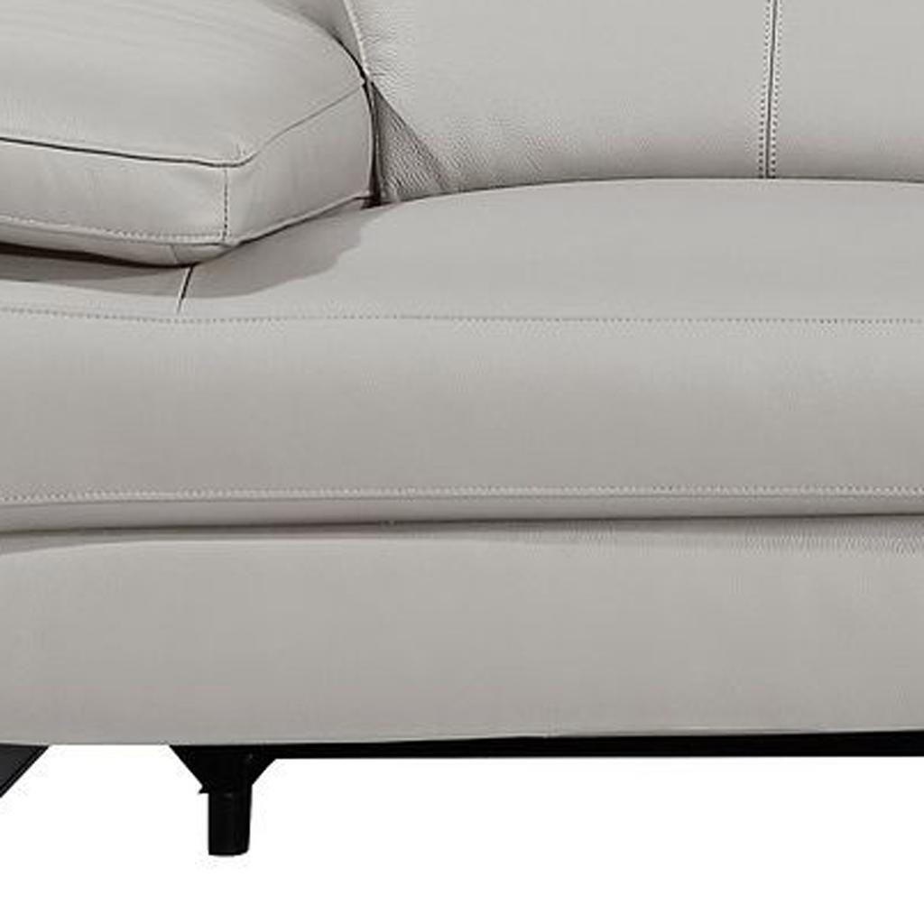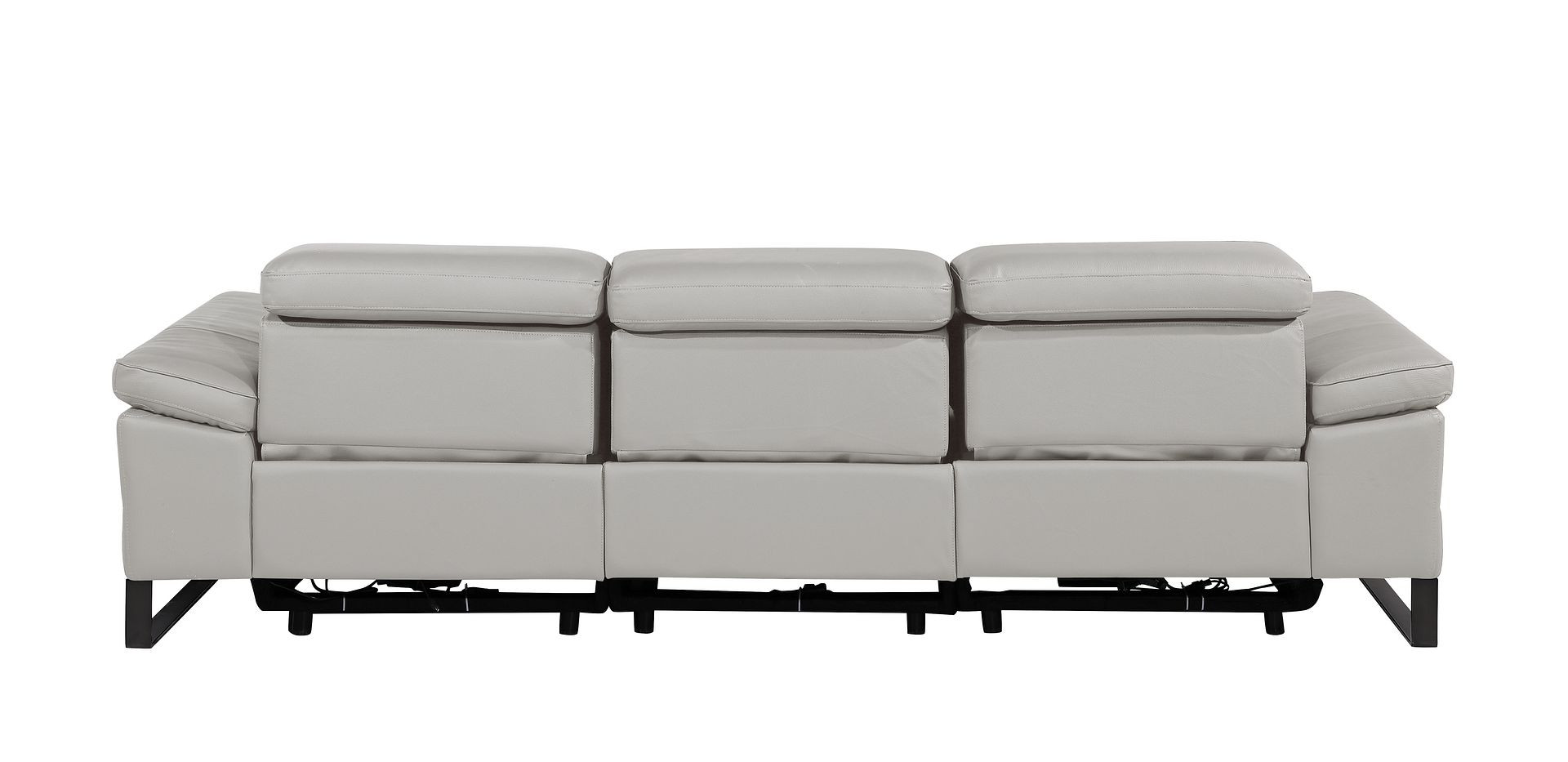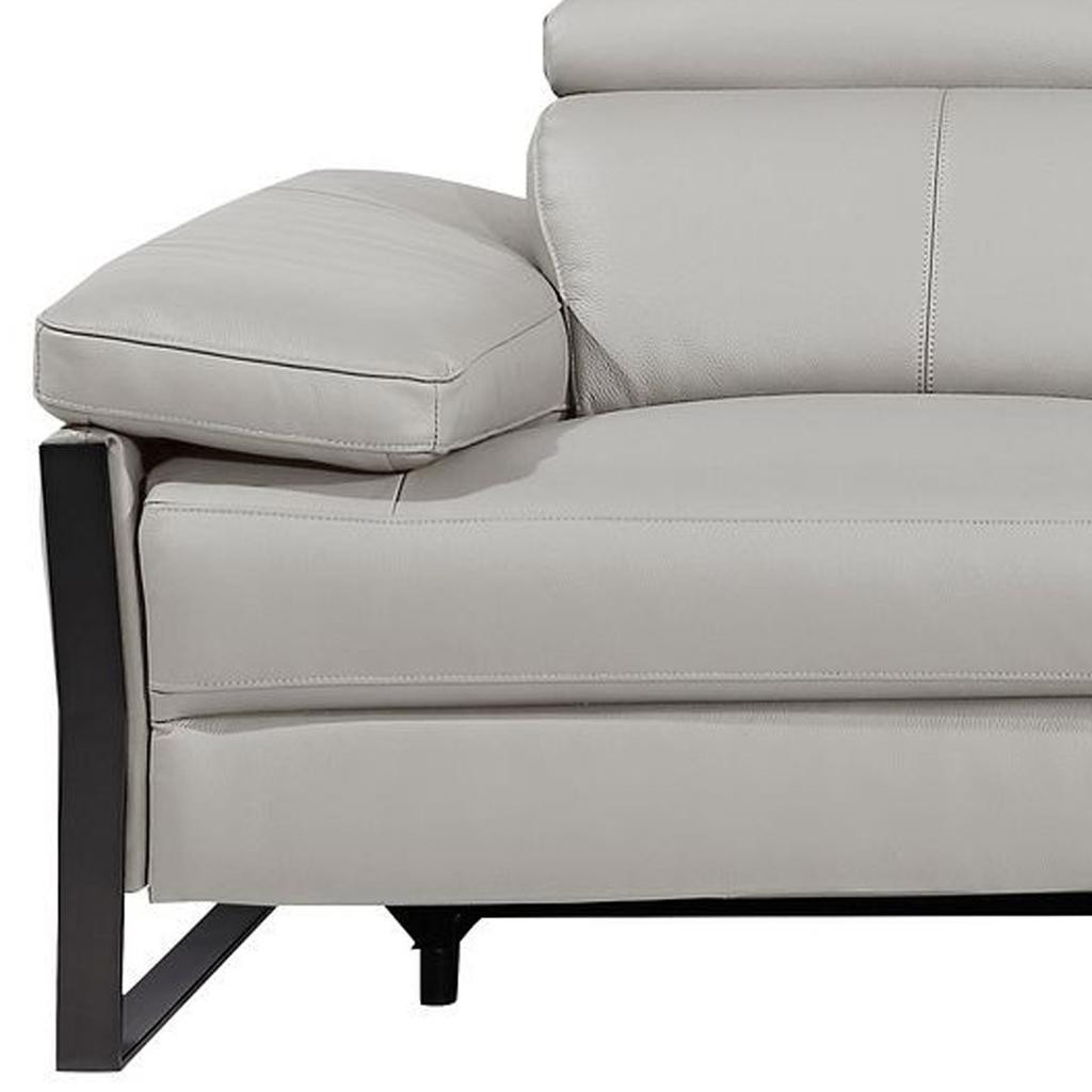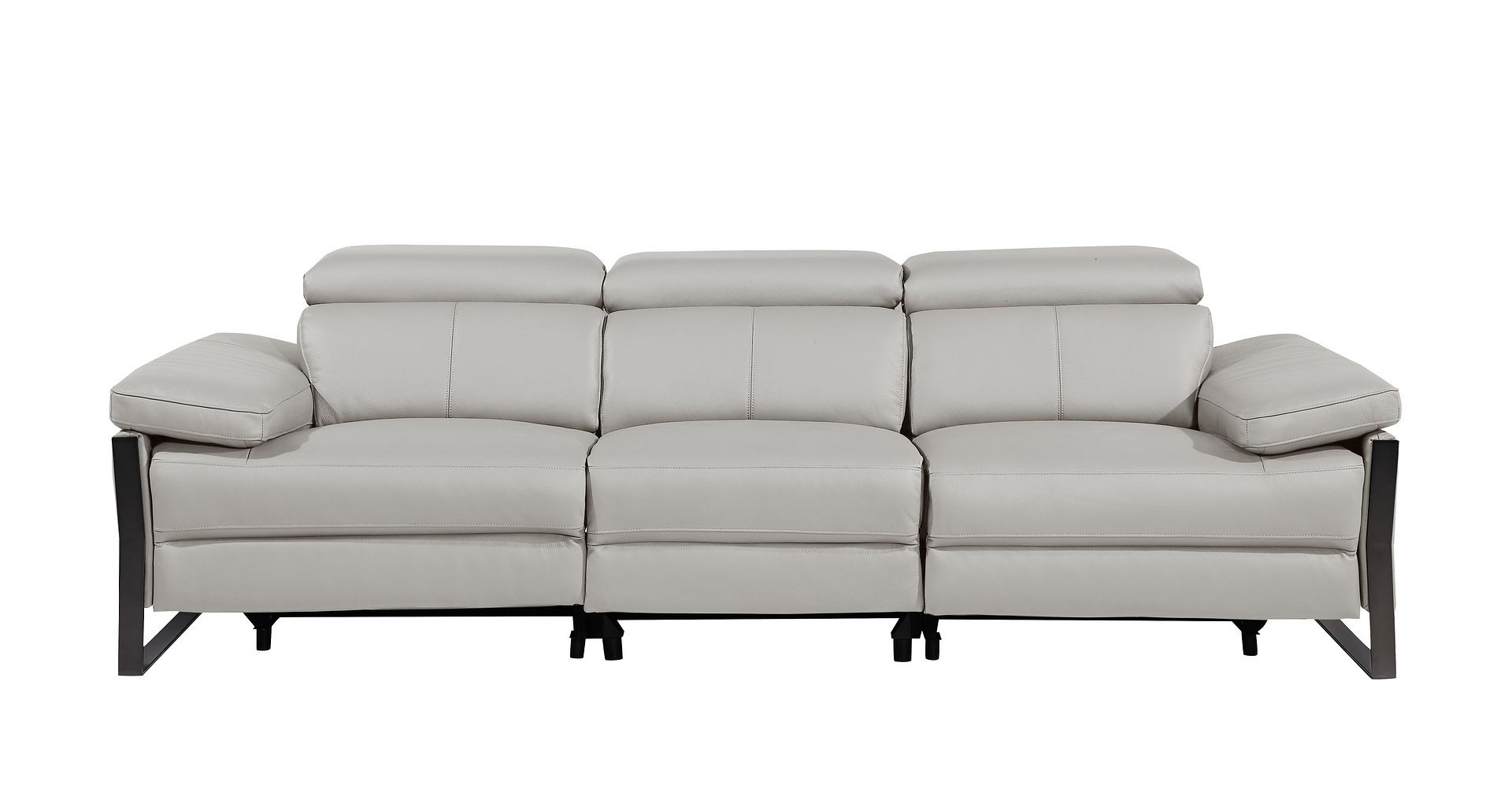 Superior construction from fabulously soft and high grade leather gives this 103-inch light gray top grain leather reclining metal usb sofa a leg up on the competition. The premium leather used makes your lounging luxuriously comfortable and adds an elegant appeal to your space. Solid colors give you lots of decorative options and are easy to work into your decor scheme. Pocket spring construction gives this piece strong support and makes it comfortable to sit even for long periods of time. Rolled arms offer a comfy place to rest. Black stainless steel legs effortlessly elevate the room and add a touch of contemporary design. A great showpiece for your room, this sofa is a must have. 31.00-inch h x 104.00-inch w x 43.00-inch d.