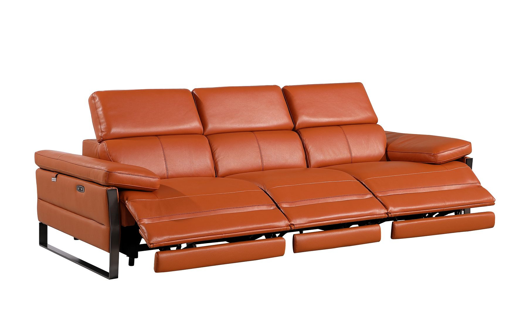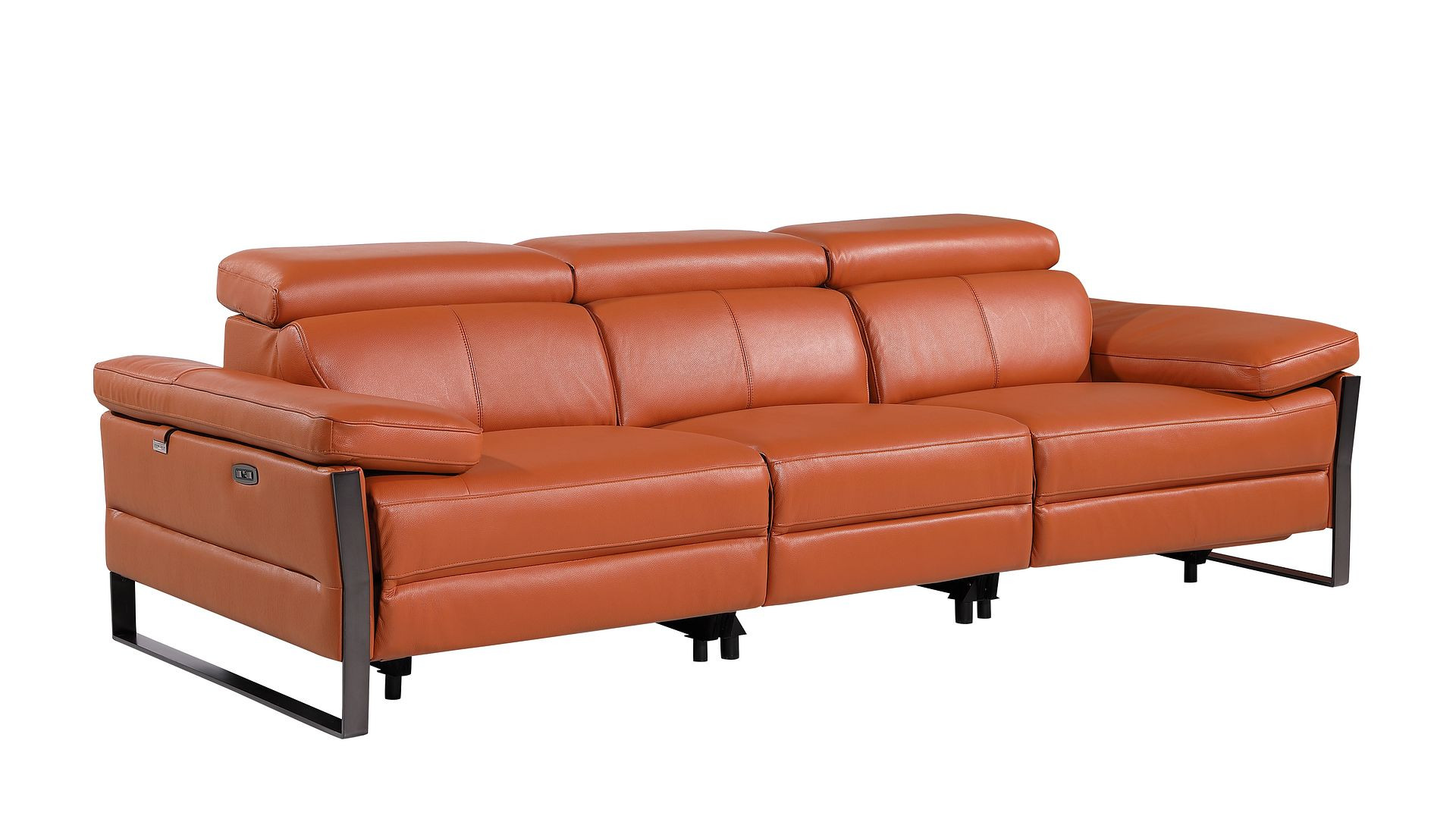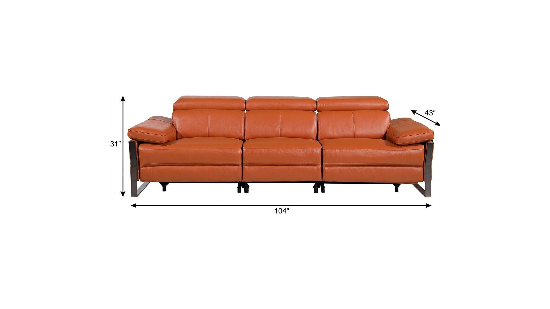Made of the highest quality, supple leather, this 103-inch camel top grain leather reclining metal usb sofa will be the star of your space. The high grade premium leather used makes your lounging luxuriously comfortable and adds an elegant appeal to your space. Solid colors give you lots of decorative options and are easy to work into your decor scheme. Pocket spring construction gives this piece strong support and makes it comfortable to sit even for long periods of time. Rolled arms offer a comfy place to rest. Black stainless steel legs effortlessly elevate the room and add a touch of contemporary design. A great showpiece for your room, this sofa is a must have. 31.00-inch h x 104.00-inch w x 43.00-inch d.