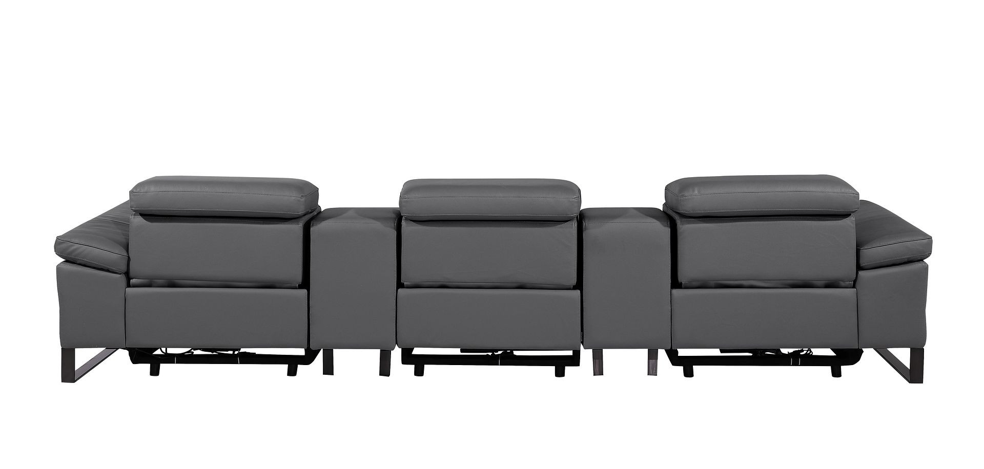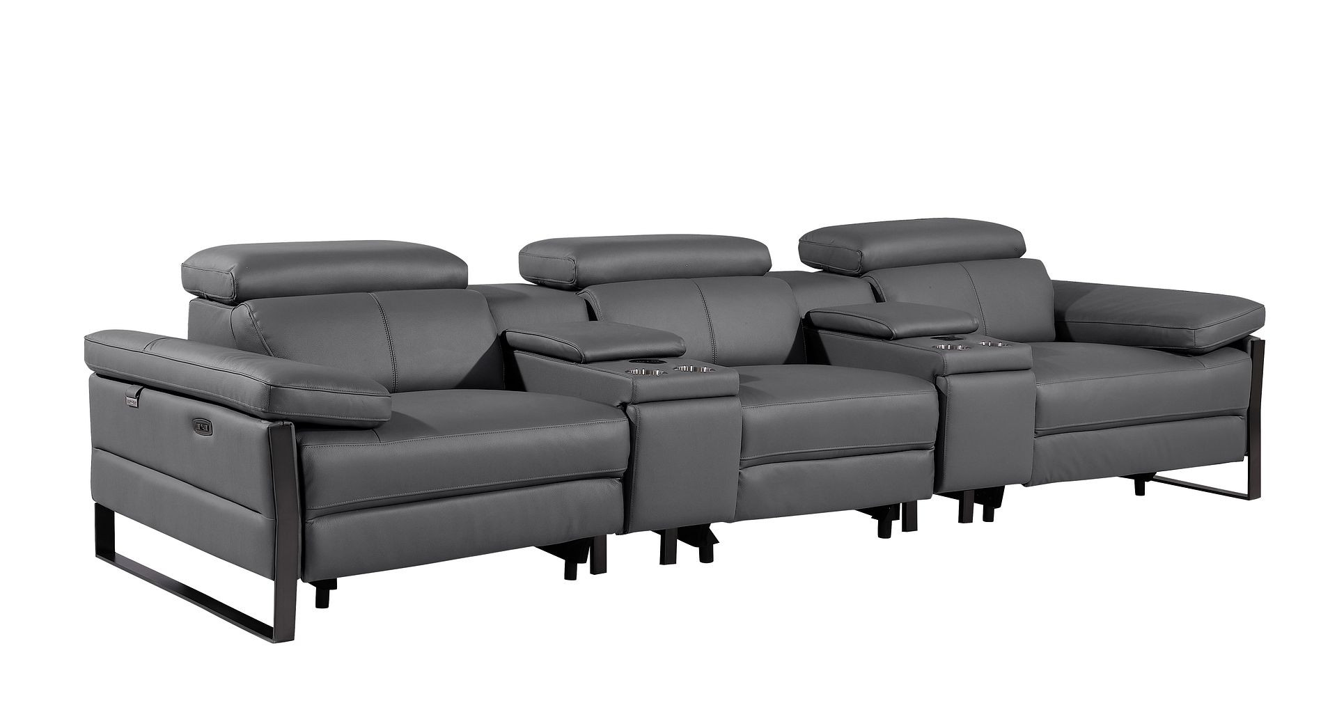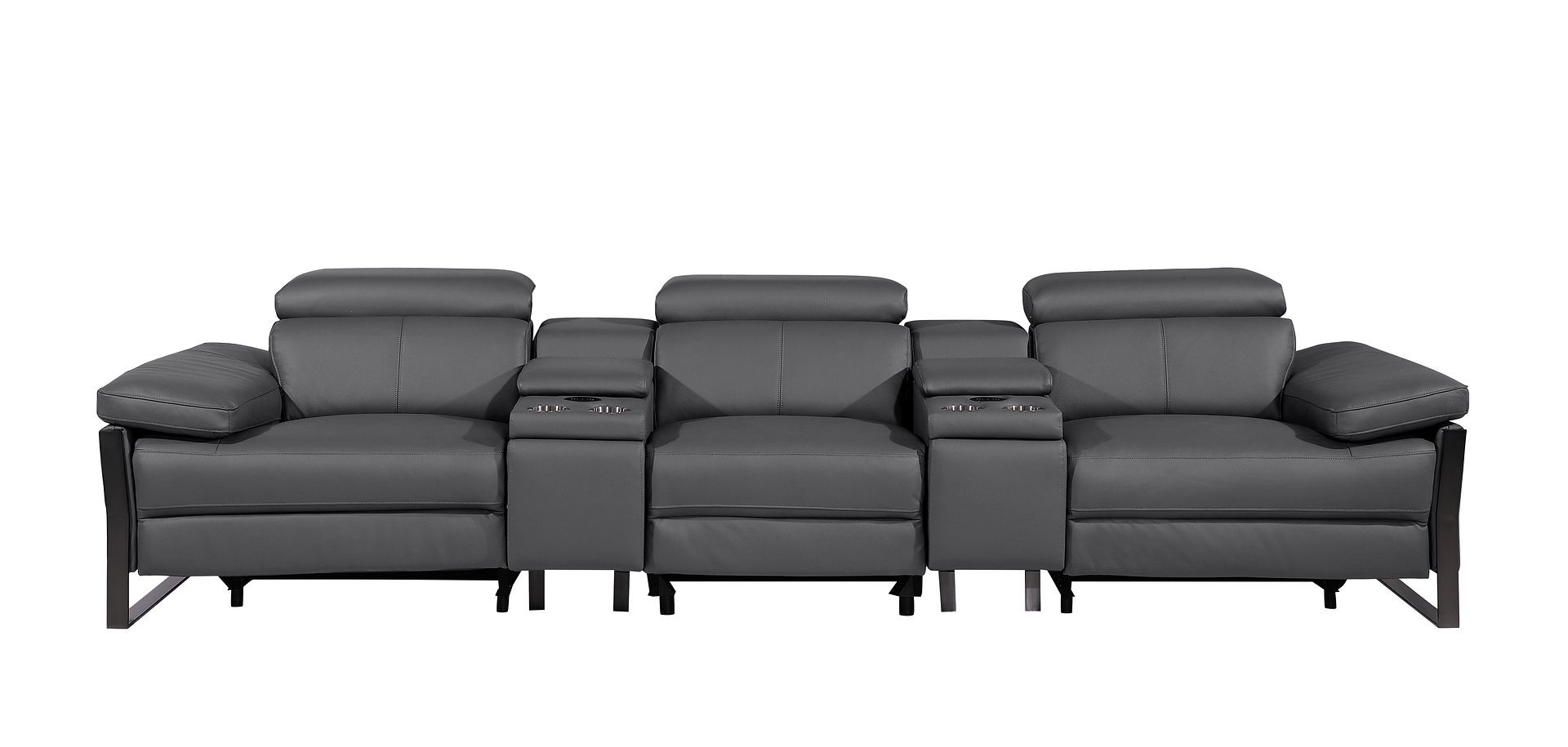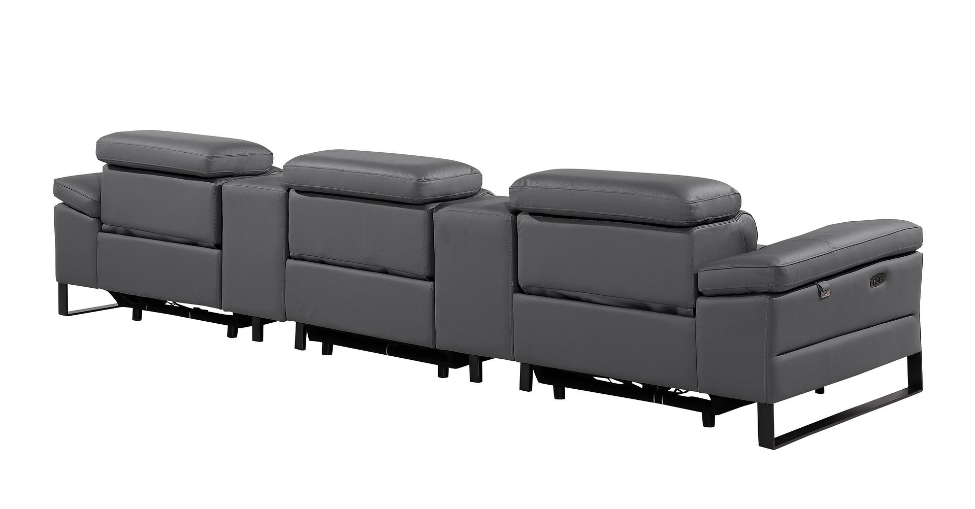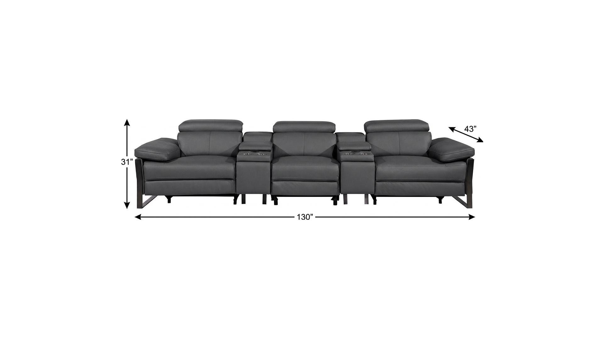 An interior designer's dream, this buttery soft high grade leather 129-inch dark gray top grain leather reclining metal usb sofa will bring just the right touch to your space. The premium leather used makes your lounging luxuriously comfortable and adds an elegant appeal to your space. Solid colors give you lots of decorative options and are easy to work into your decor scheme. Pocket spring construction gives this piece strong support and makes it comfortable to sit even for long periods of time. Rolled arms offer a comfy place to rest. Black stainless steel legs effortlessly elevate the room and add a touch of contemporary design. A great showpiece for your room, this sofa is a must have. 31.00-inch h x 130.00-inch w x 43.00-inch d.