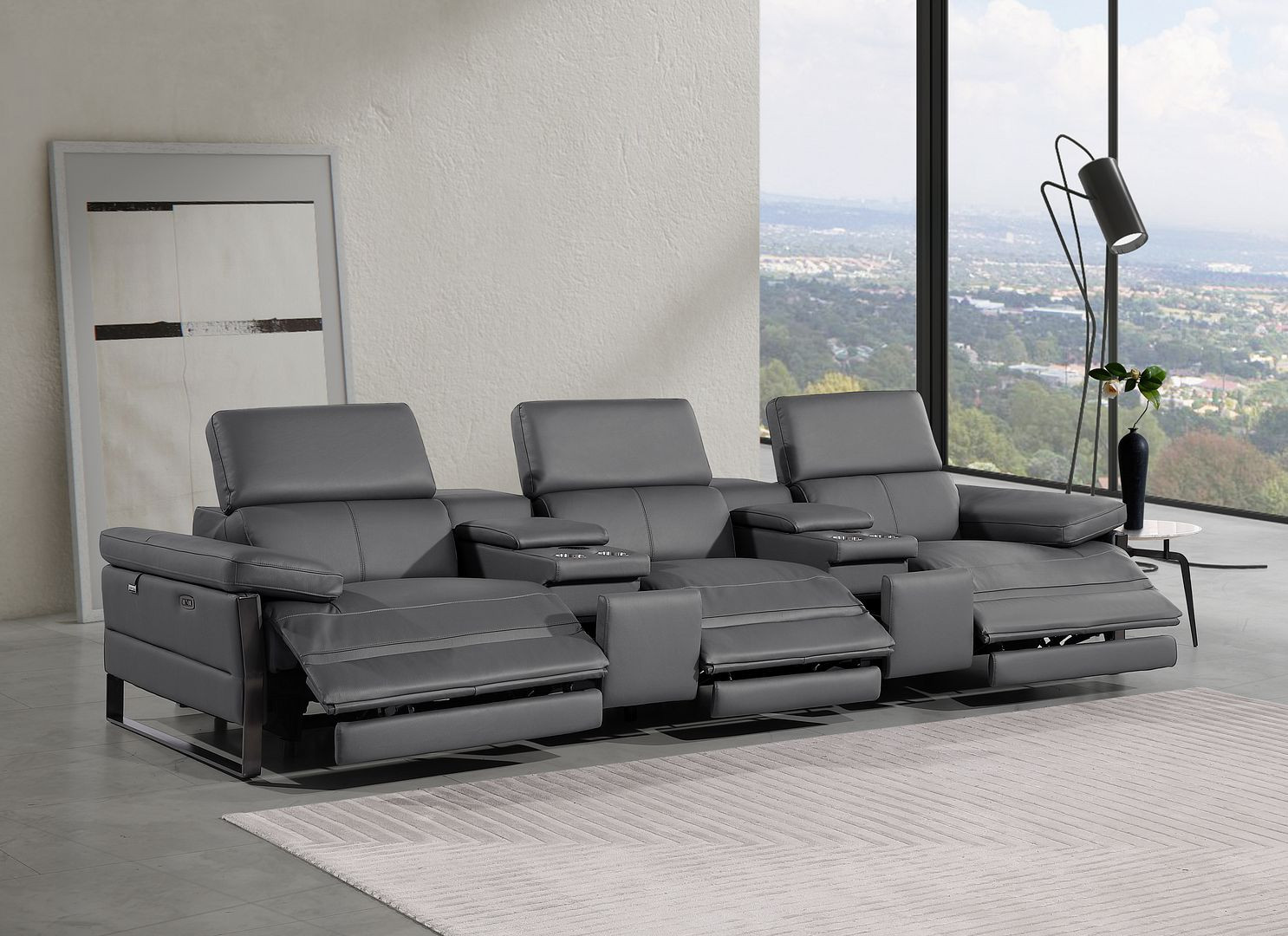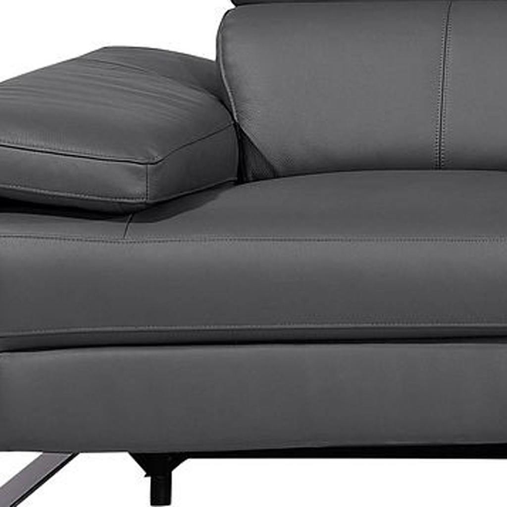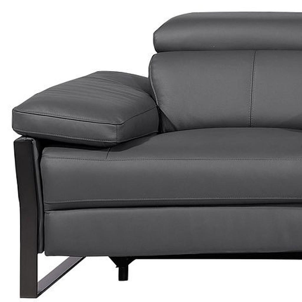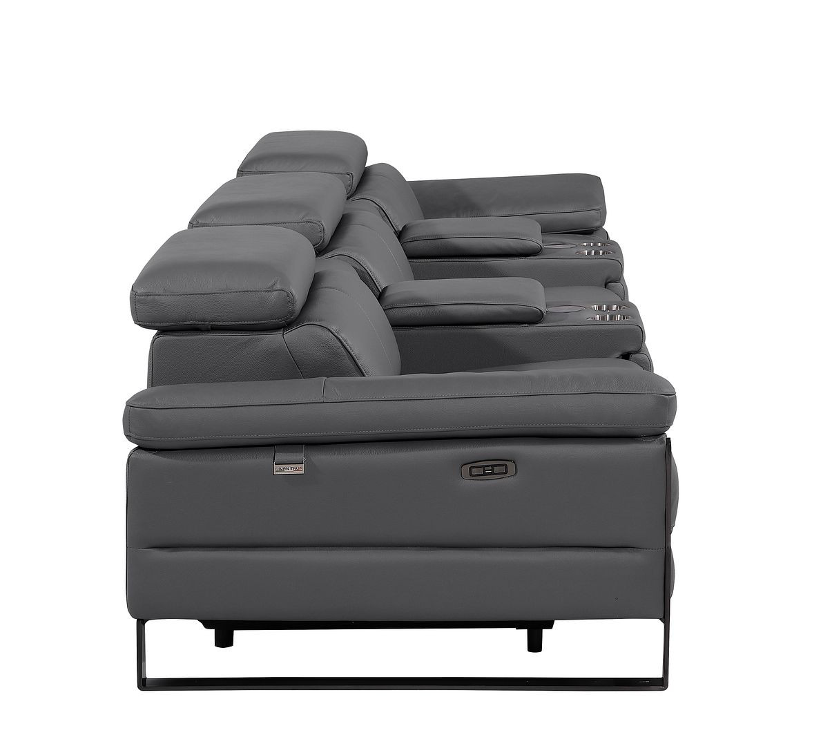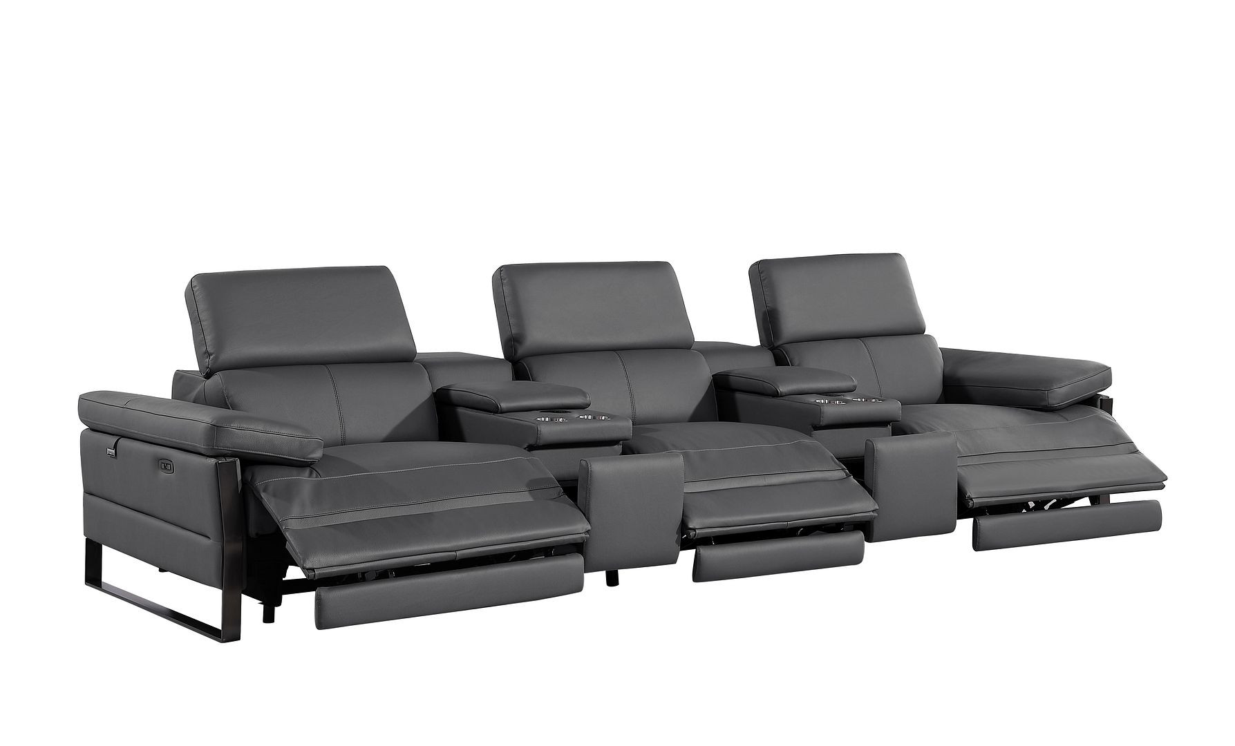 An interior designer's dream, this buttery soft high grade leather 129-inch dark gray top grain leather reclining metal usb sofa will bring just the right touch to your space. The premium leather used makes your lounging luxuriously comfortable and adds an elegant appeal to your space. Solid colors give you lots of decorative options and are easy to work into your decor scheme. Pocket spring construction gives this piece strong support and makes it comfortable to sit even for long periods of time. Rolled arms offer a comfy place to rest. Black stainless steel legs effortlessly elevate the room and add a touch of contemporary design. A great showpiece for your room, this sofa is a must have. 31.00-inch h x 130.00-inch w x 43.00-inch d.