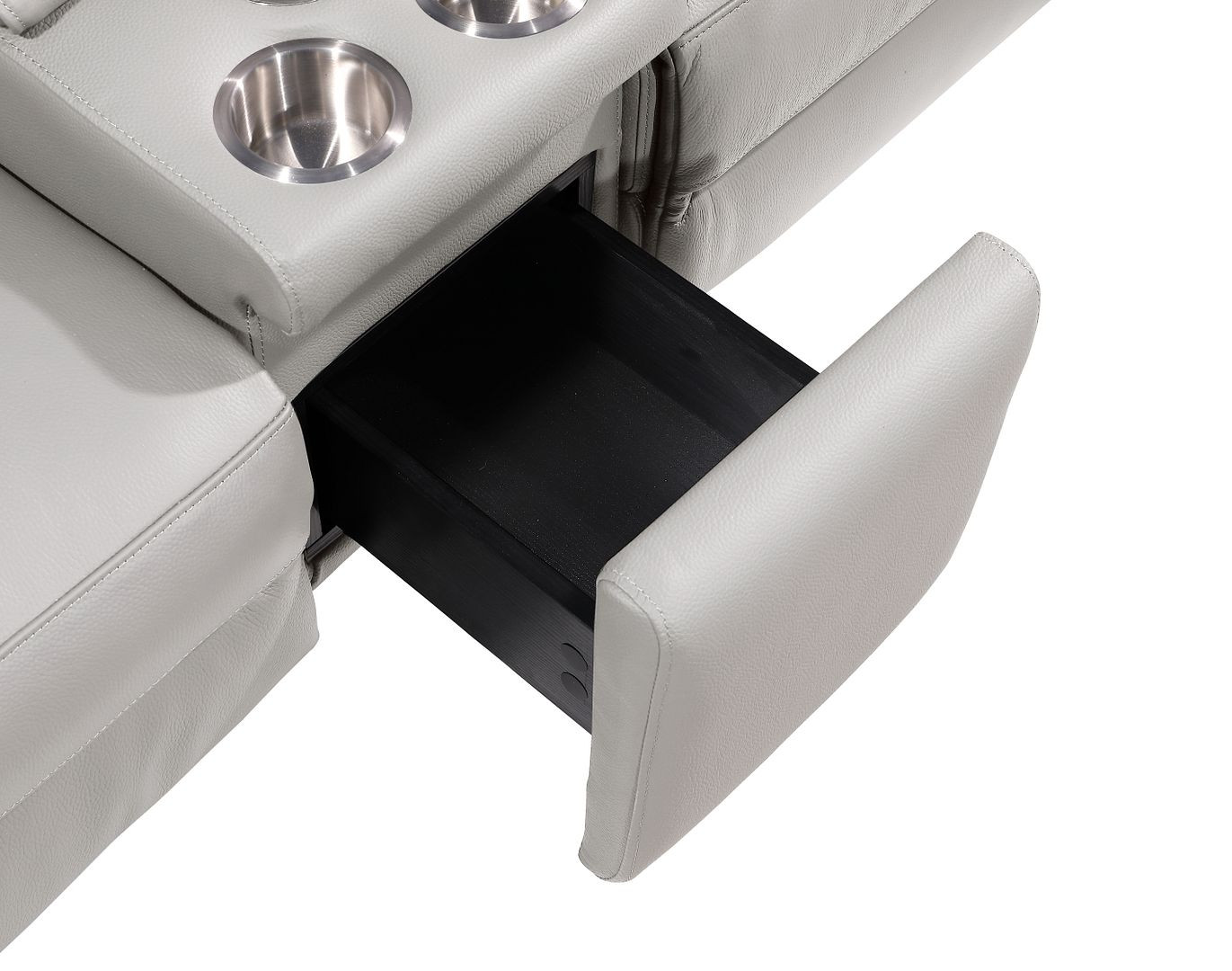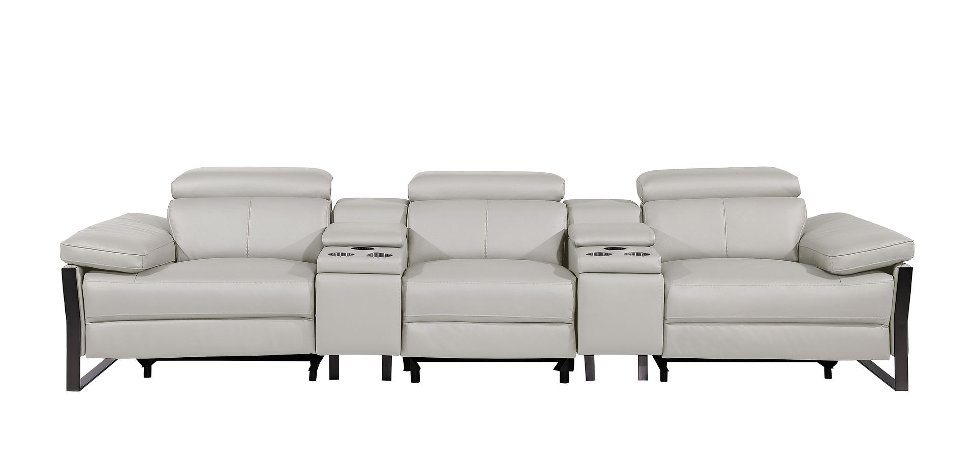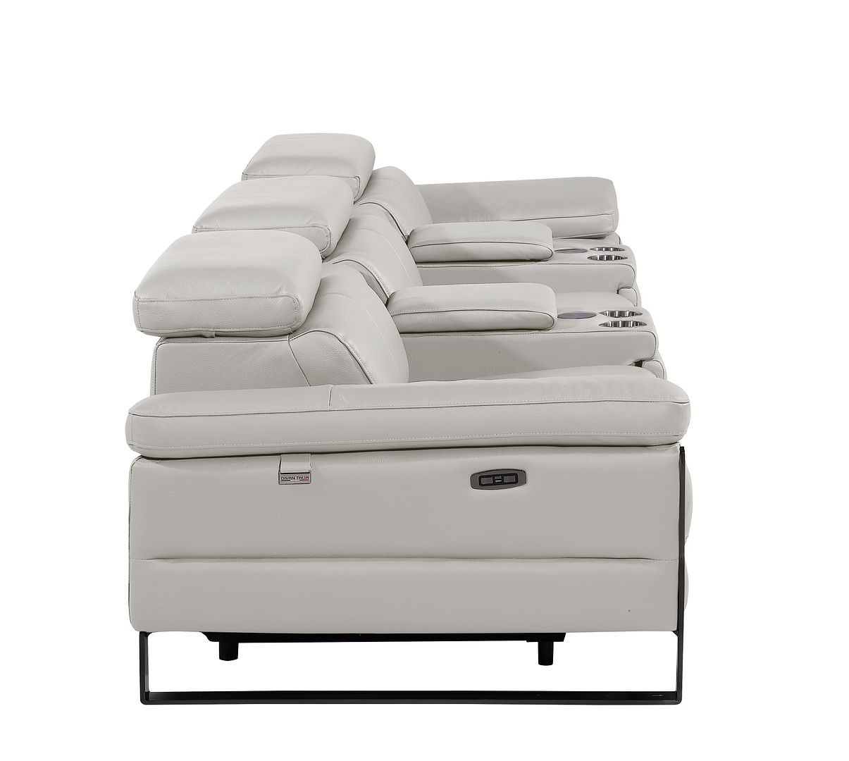 An interior designer's dream, this buttery soft high grade leather 129-inch light gray top grain leather reclining metal usb sofa will bring just the right touch to your space. The premium leather used makes your lounging luxuriously comfortable and adds an elegant appeal to your space. Solid colors give you lots of decorative options and are easy to work into your decor scheme. Pocket spring construction gives this piece strong support and makes it comfortable to sit even for long periods of time. Rolled arms offer a comfy place to rest. Black stainless steel legs effortlessly elevate the room and add a touch of contemporary design. Built to last, this sofa will be a great centerpiece for your room. 31.00-inch h x 130.00-inch w x 43.00-inch d.