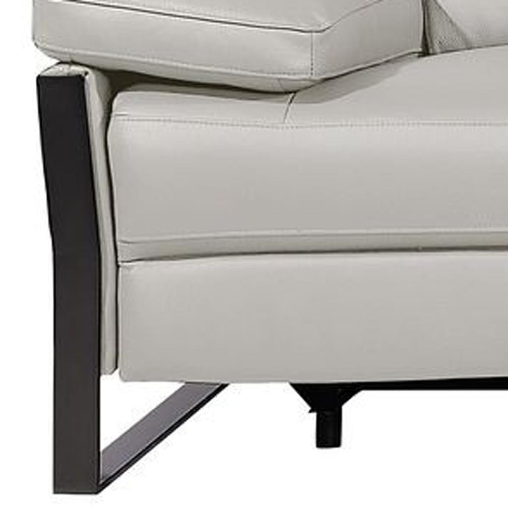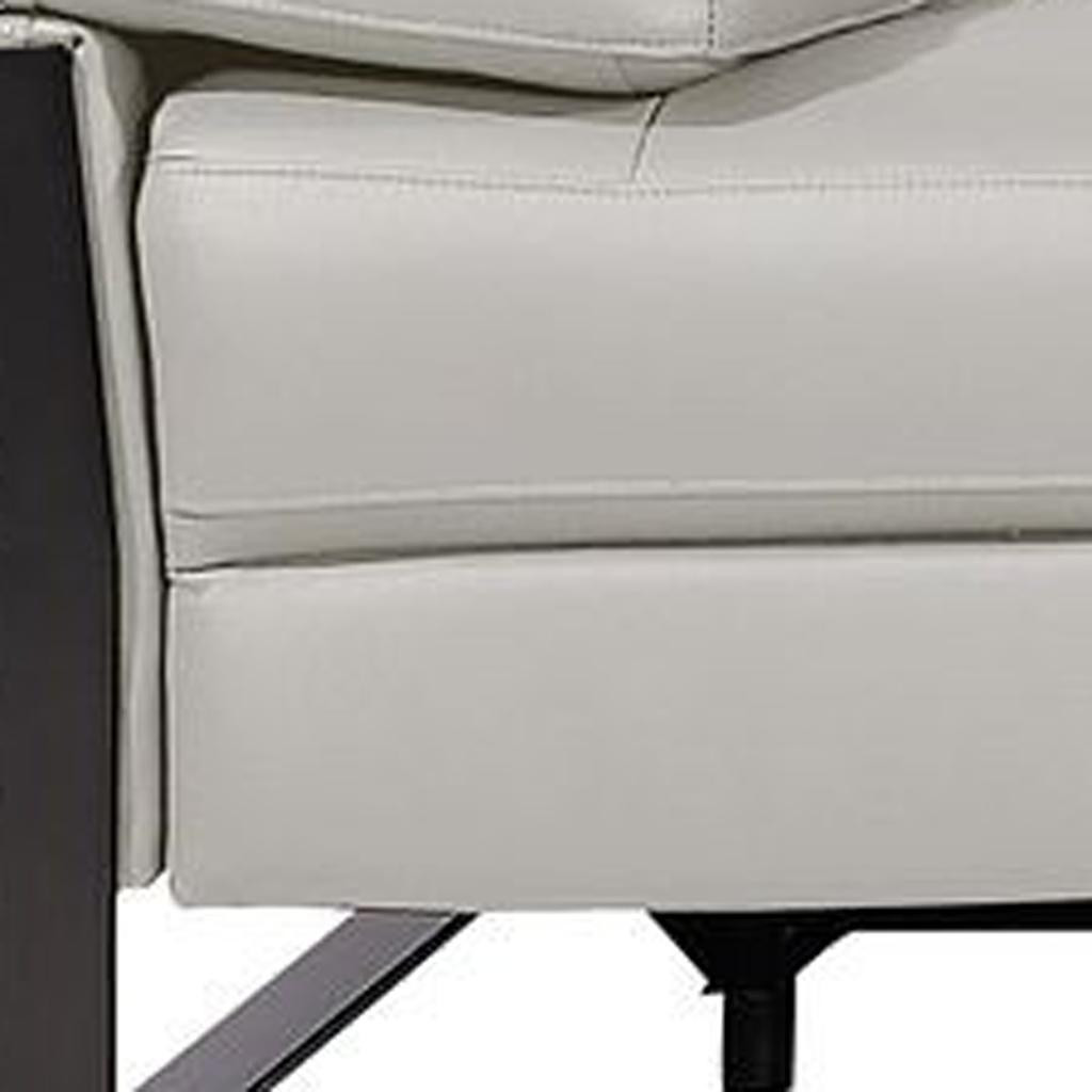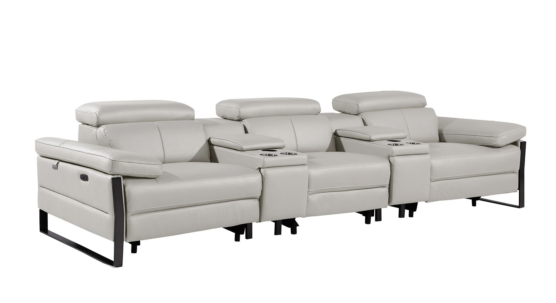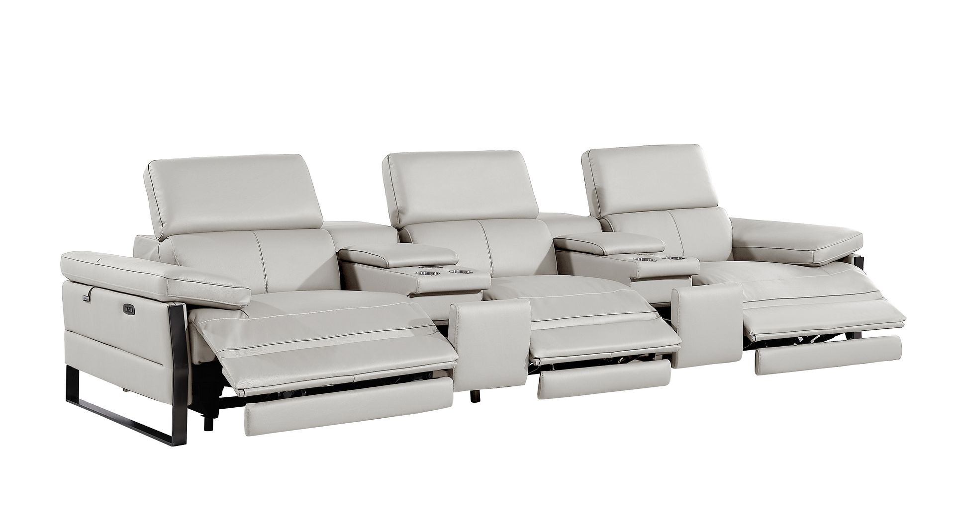An interior designer's dream, this buttery soft high grade leather 129-inch light gray top grain leather reclining metal usb sofa will bring just the right touch to your space. The premium leather used makes your lounging luxuriously comfortable and adds an elegant appeal to your space. Solid colors give you lots of decorative options and are easy to work into your decor scheme. Pocket spring construction gives this piece strong support and makes it comfortable to sit even for long periods of time. Rolled arms offer a comfy place to rest. Black stainless steel legs effortlessly elevate the room and add a touch of contemporary design. Built to last, this sofa will be a great centerpiece for your room. 31.00-inch h x 130.00-inch w x 43.00-inch d.