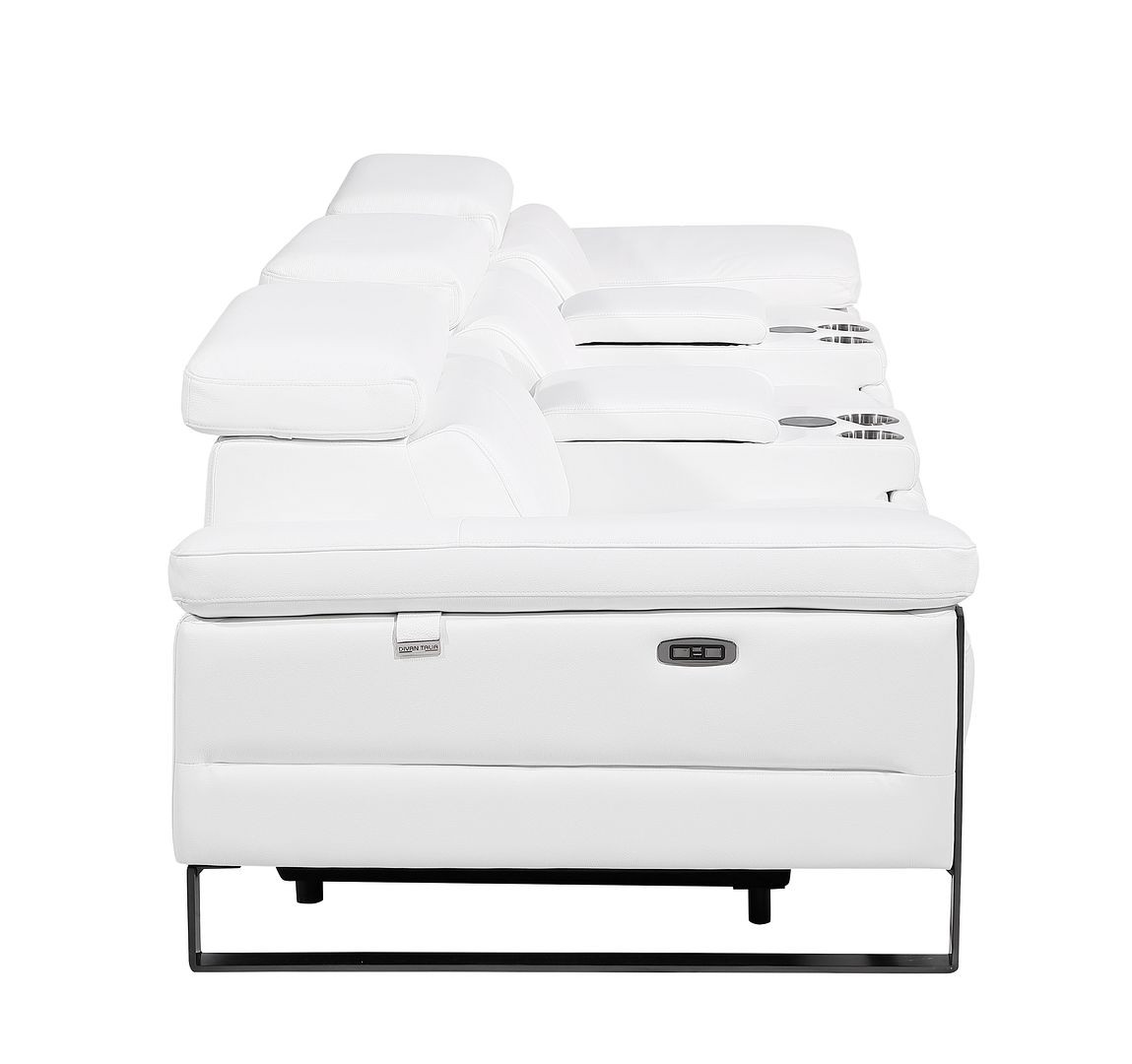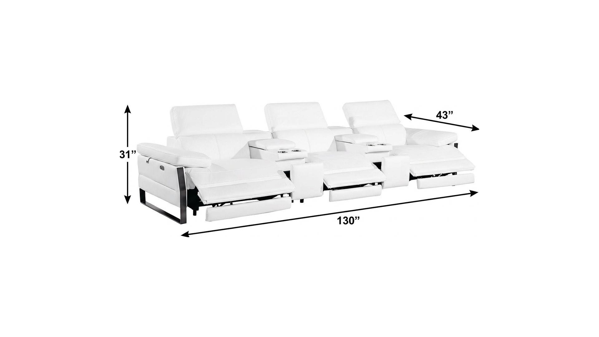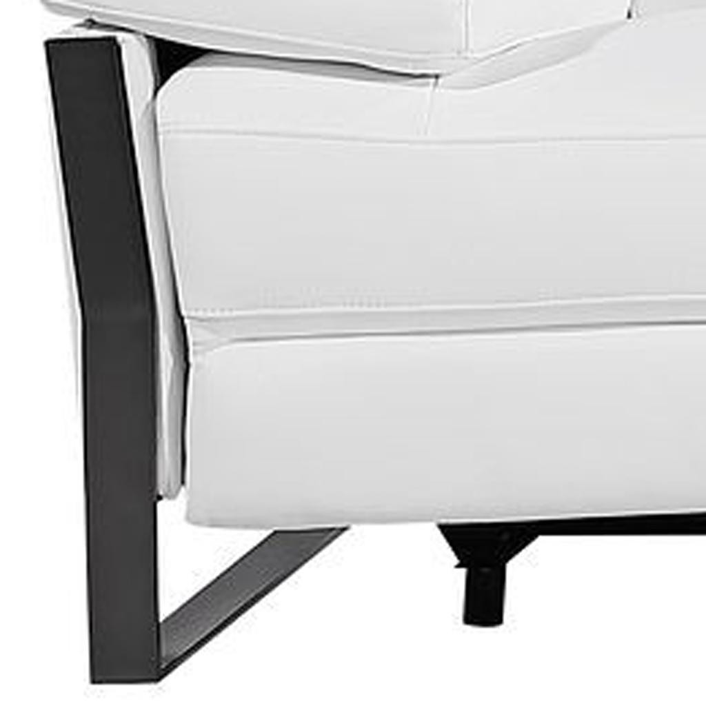 An interior designer's dream, this buttery soft high grade leather 129-inch white top grain leather reclining metal usb sofa will bring just the right touch to your space. The premium leather used makes your lounging luxuriously comfortable and adds an elegant appeal to your space. Solid colors give you lots of decorative options and are easy to work into your decor scheme. Pocket spring construction gives this piece strong support and makes it comfortable to sit even for long periods of time. Rolled arms offer a comfy place to rest. Black stainless steel legs effortlessly elevate the room and add a touch of contemporary design. A great showpiece for your room, this sofa is a must have. 31.00-inch h x 130.00-inch w x 43.00-inch d.