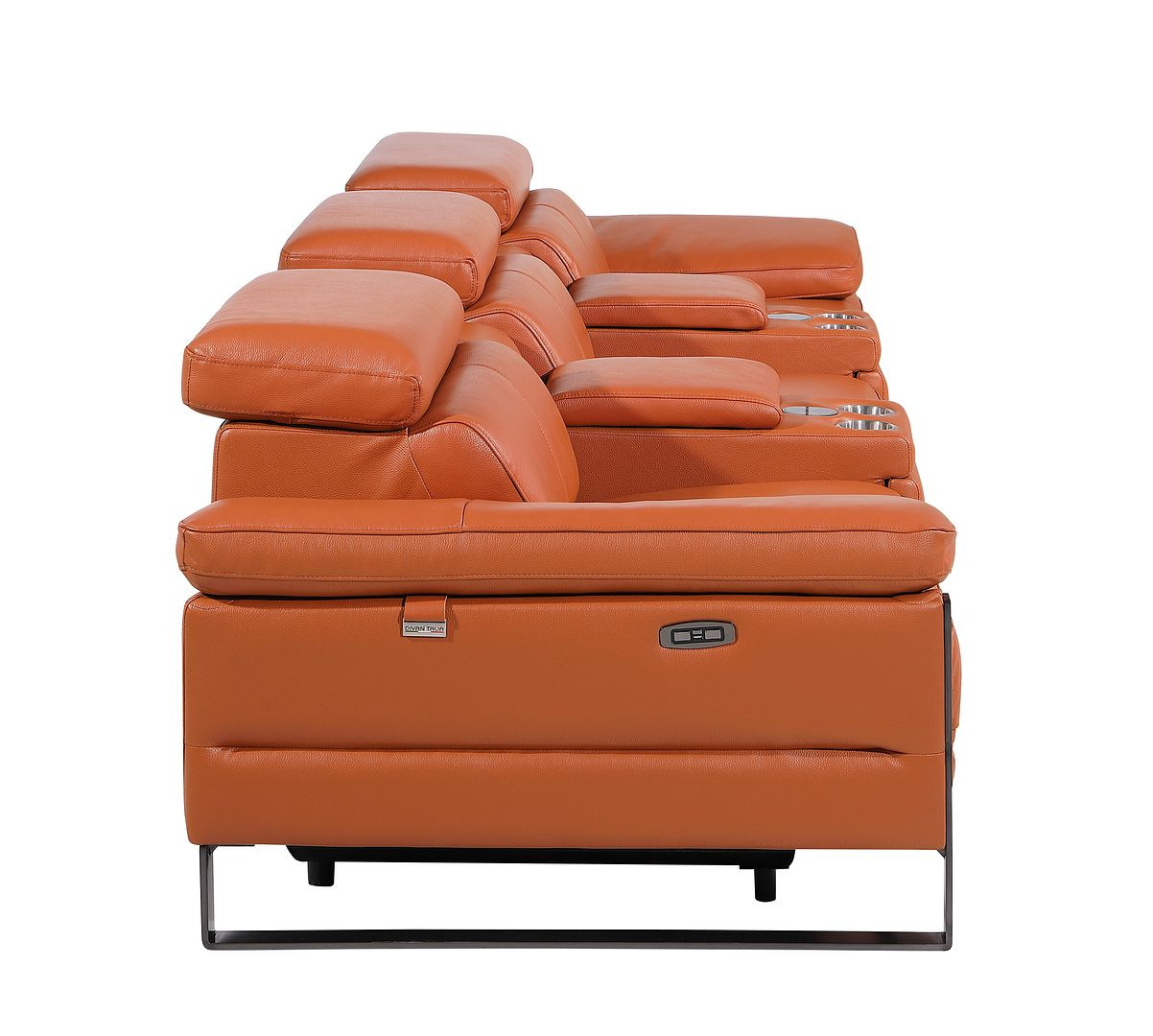 Made of the highest quality, supple leather, this 129-inch camel top grain leather reclining metal usb sofa will be the star of your space. The high grade premium leather used makes your lounging luxuriously comfortable and adds an elegant appeal to your space. Solid colors give you lots of decorative options and are easy to work into your decor scheme. Pocket spring construction gives this piece strong support and makes it comfortable to sit even for long periods of time. Rolled arms offer a comfy place to rest. Black stainless steel legs effortlessly elevate the room and add a touch of contemporary design. A great showpiece for your room, this sofa is a must have. 31.00-inch h x 130.00-inch w x 43.00-inch d.