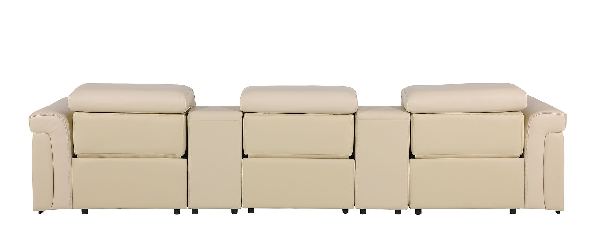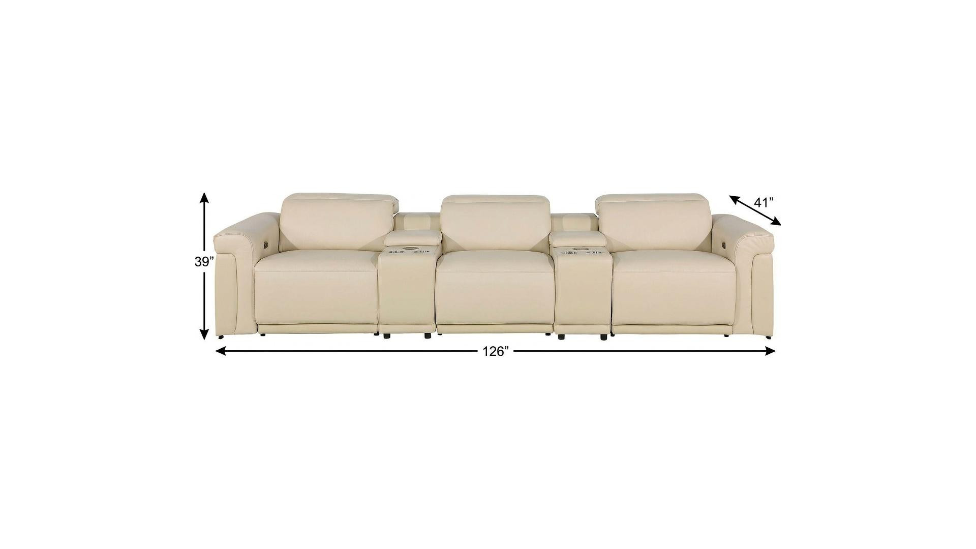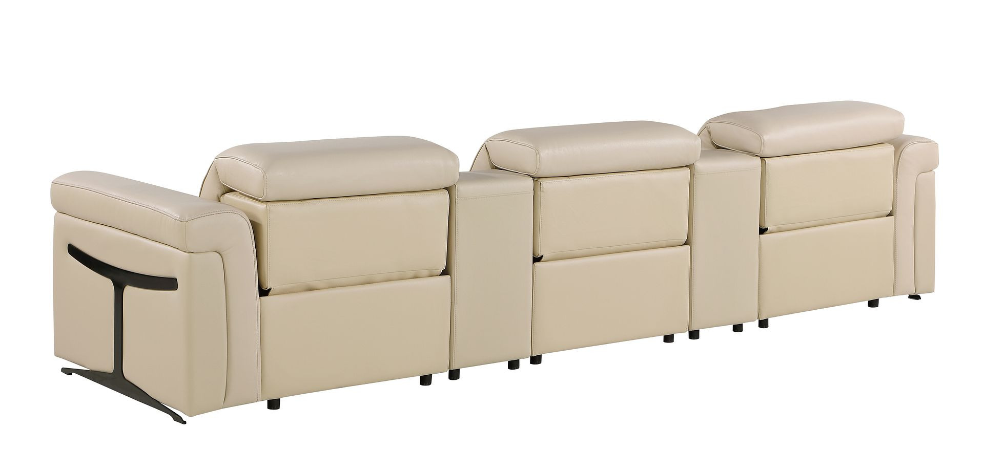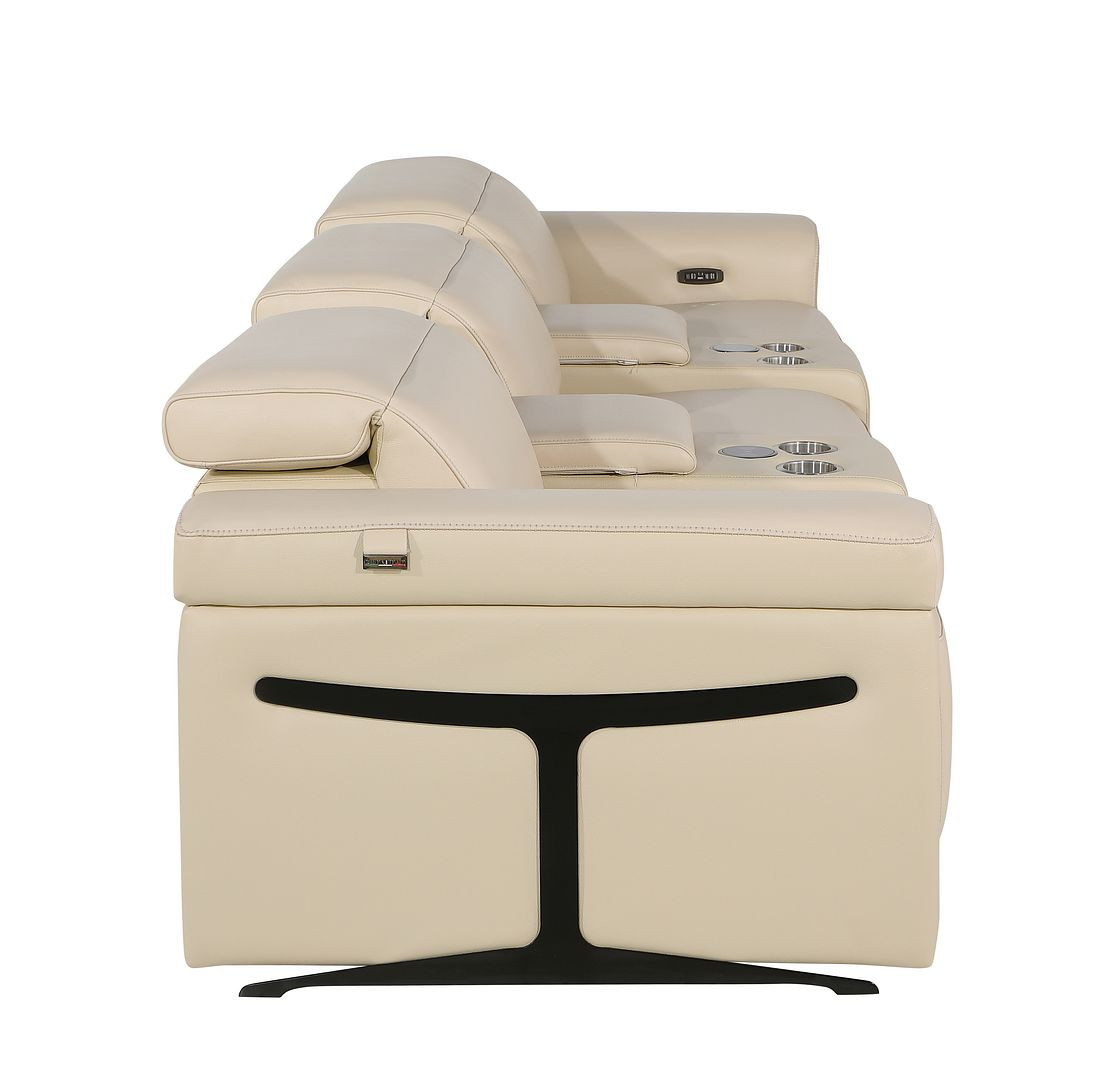 Superior construction from fabulously soft and high grade leather gives this 126-inch beige top grain leather reclining metal usb sofa a leg up on the competition. The premium leather used makes your lounging luxuriously comfortable and adds an elegant appeal to your space. Solid colors give you lots of decorative options and are easy to work into your decor scheme. Pocket spring construction gives this piece strong support and makes it comfortable to sit even for long periods of time. Rolled arms offer a comfy place to rest. Black stainless steel legs effortlessly elevate the room and add a touch of contemporary design. A great showpiece for your room, this sofa is a must have. 39.00-inch h x 126.00-inch w x 41.00-inch d.