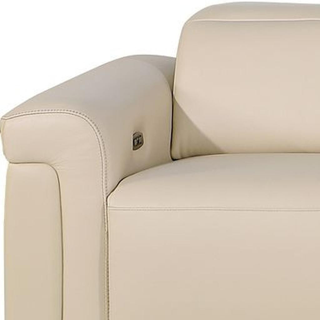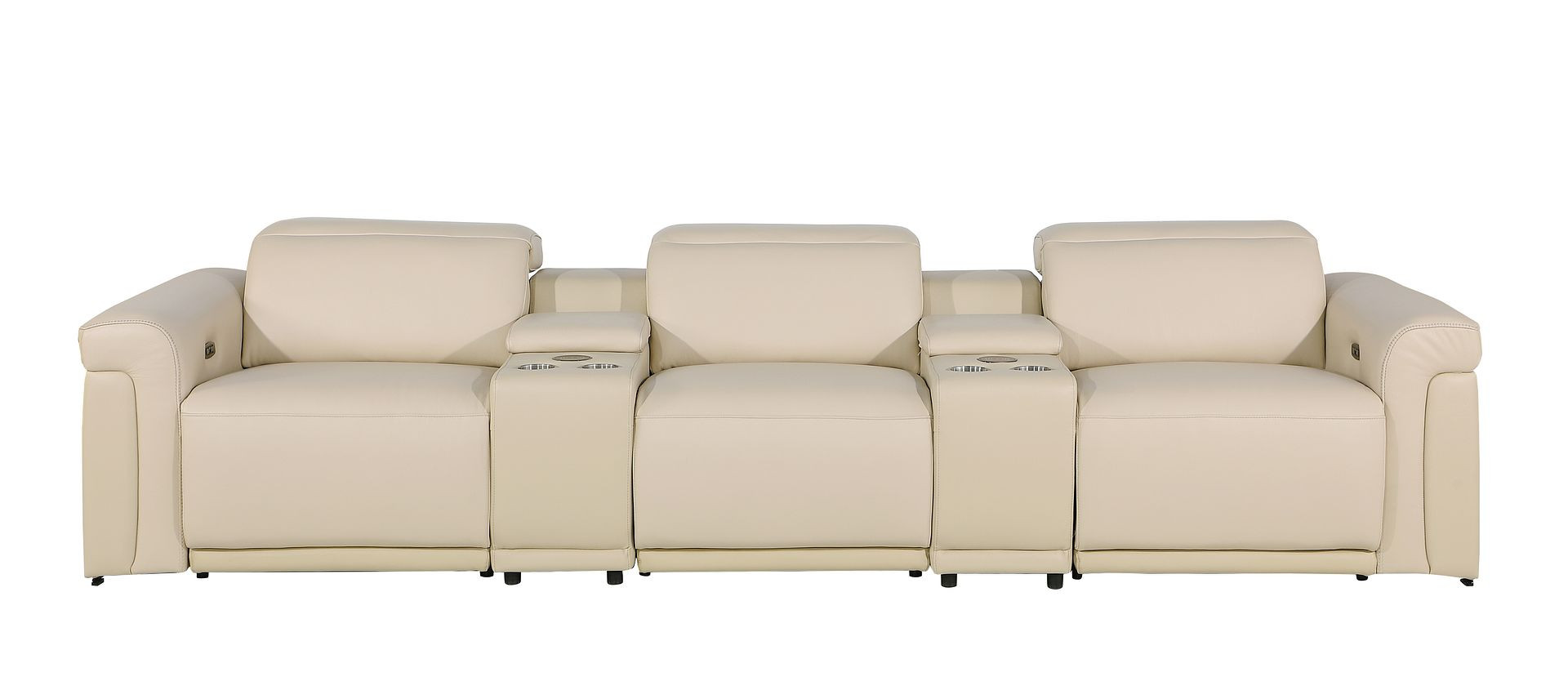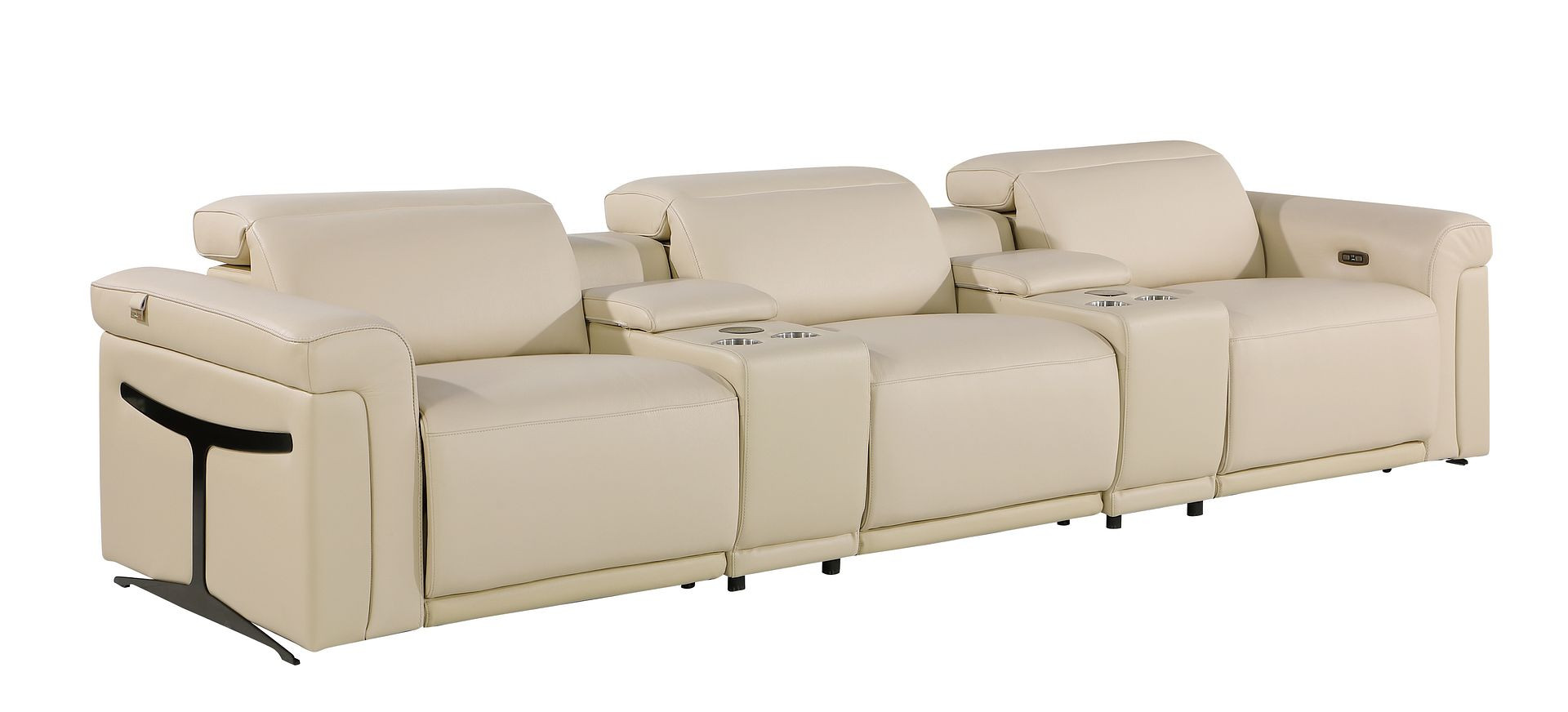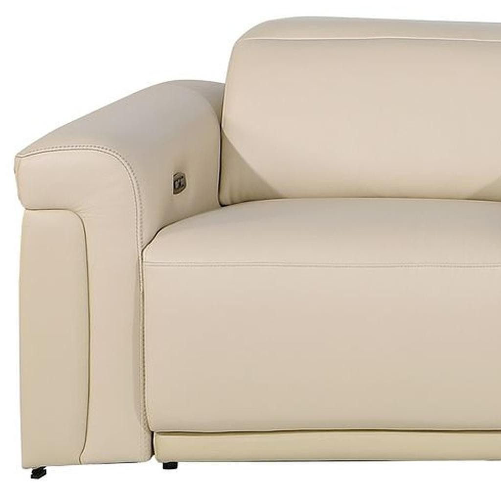 Superior construction from fabulously soft and high grade leather gives this 126-inch beige top grain leather reclining metal usb sofa a leg up on the competition. The premium leather used makes your lounging luxuriously comfortable and adds an elegant appeal to your space. Solid colors give you lots of decorative options and are easy to work into your decor scheme. Pocket spring construction gives this piece strong support and makes it comfortable to sit even for long periods of time. Rolled arms offer a comfy place to rest. Black stainless steel legs effortlessly elevate the room and add a touch of contemporary design. A great showpiece for your room, this sofa is a must have. 39.00-inch h x 126.00-inch w x 41.00-inch d.