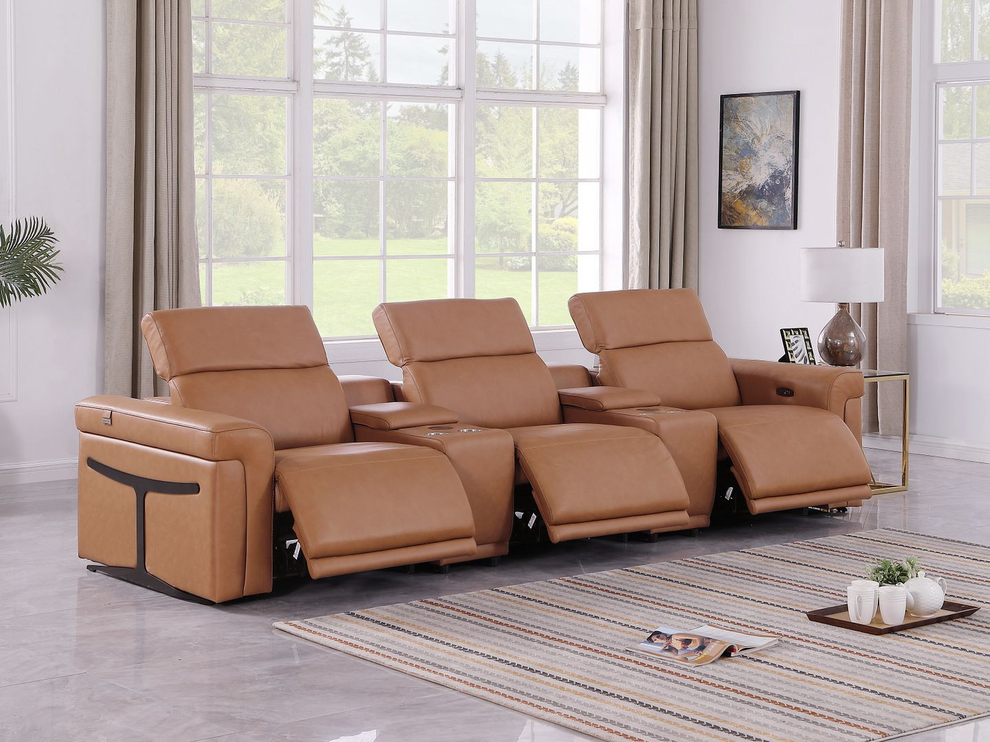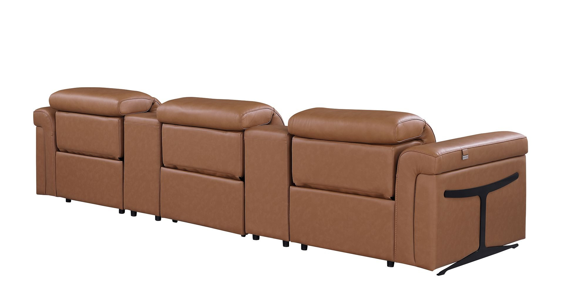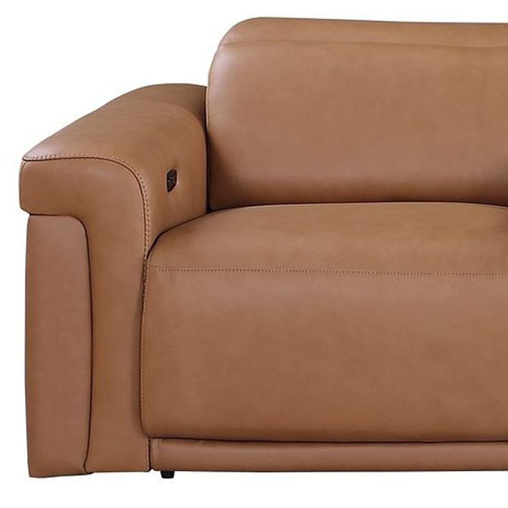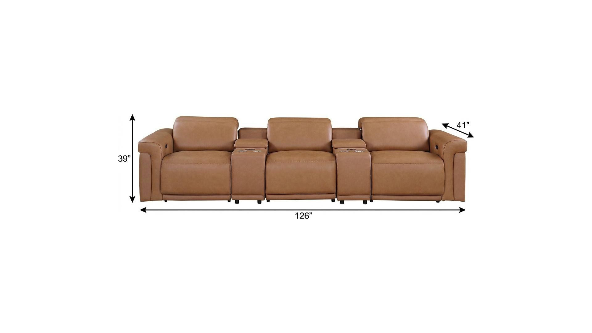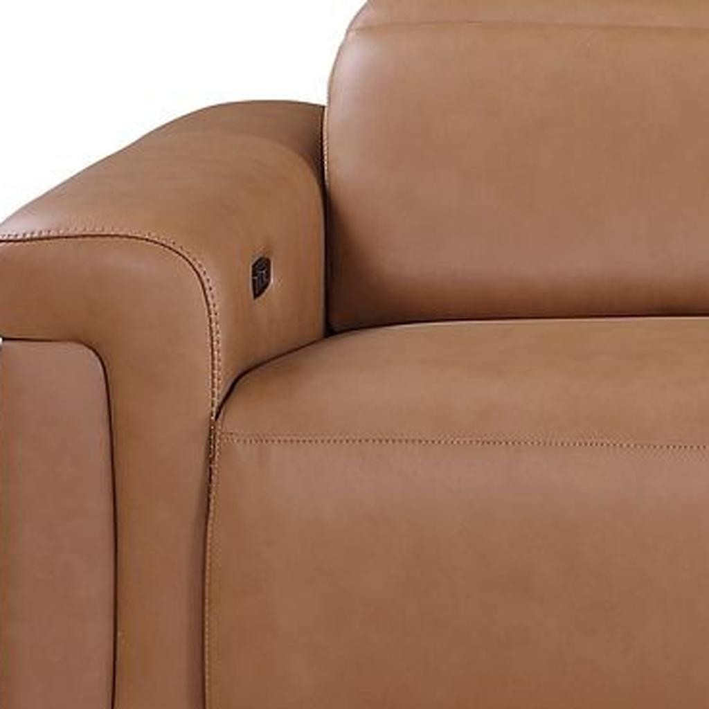 Superior construction from fabulously soft and high grade leather gives this 126-inch chestnut top grain leather reclining metal usb sofa a leg up on the competition. The premium leather used makes your lounging luxuriously comfortable and adds an elegant appeal to your space. Solid colors give you lots of decorative options and are easy to work into your decor scheme. Pocket spring construction gives this piece strong support and makes it comfortable to sit even for long periods of time. Rolled arms offer a comfy place to rest. Black stainless steel legs effortlessly elevate the room and add a touch of contemporary design. A great showpiece for your room, this sofa is a must have. 39.00-inch h x 126.00-inch w x 41.00-inch d.