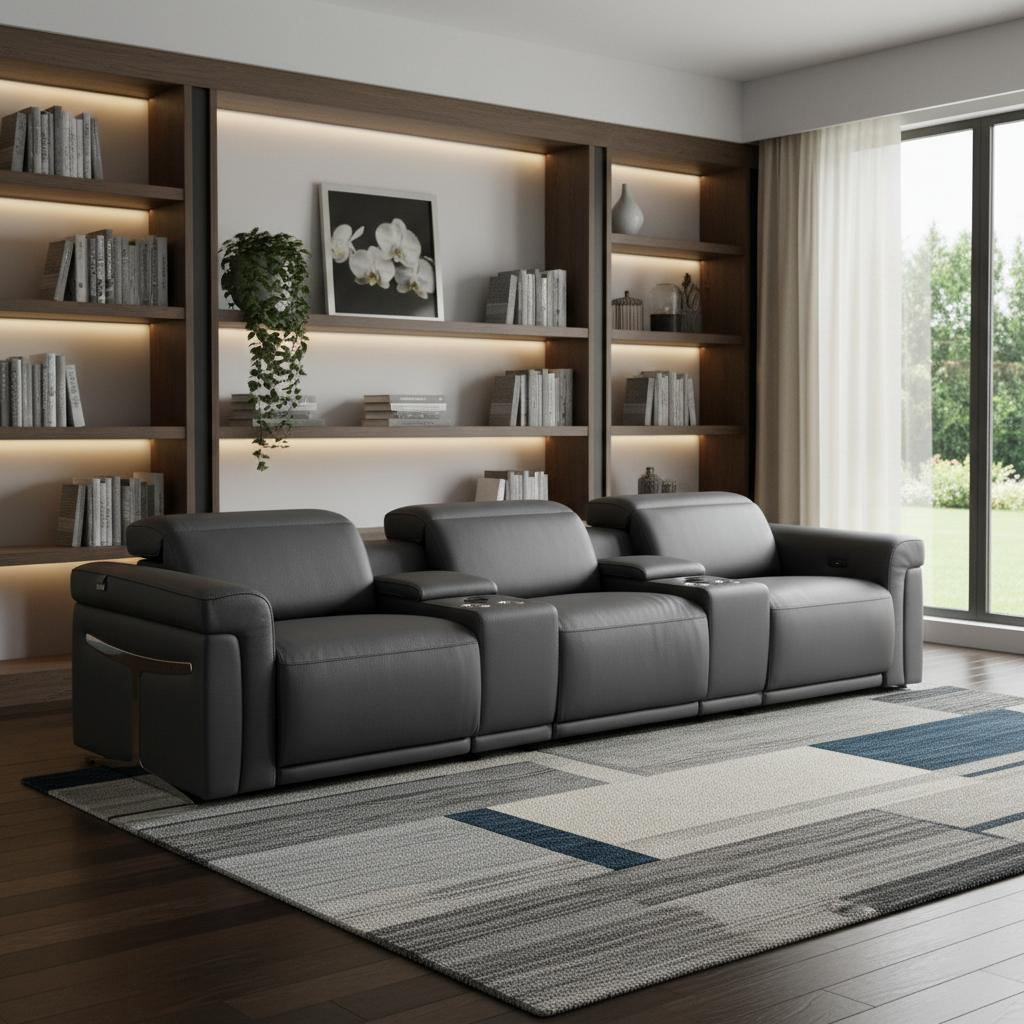 leather power reclining sofa, Italian leather reclining sofa, top grain leather sofa with recliners, 3 seat power recliner sofa, sofa with console storage, sofa with USB ports and wireless charging, luxury Italian leather sofa, modern reclining sofa, Chrome leg sofa, sofa with lumbar support, home theater leather sofa, contemporary reclining sofa |
