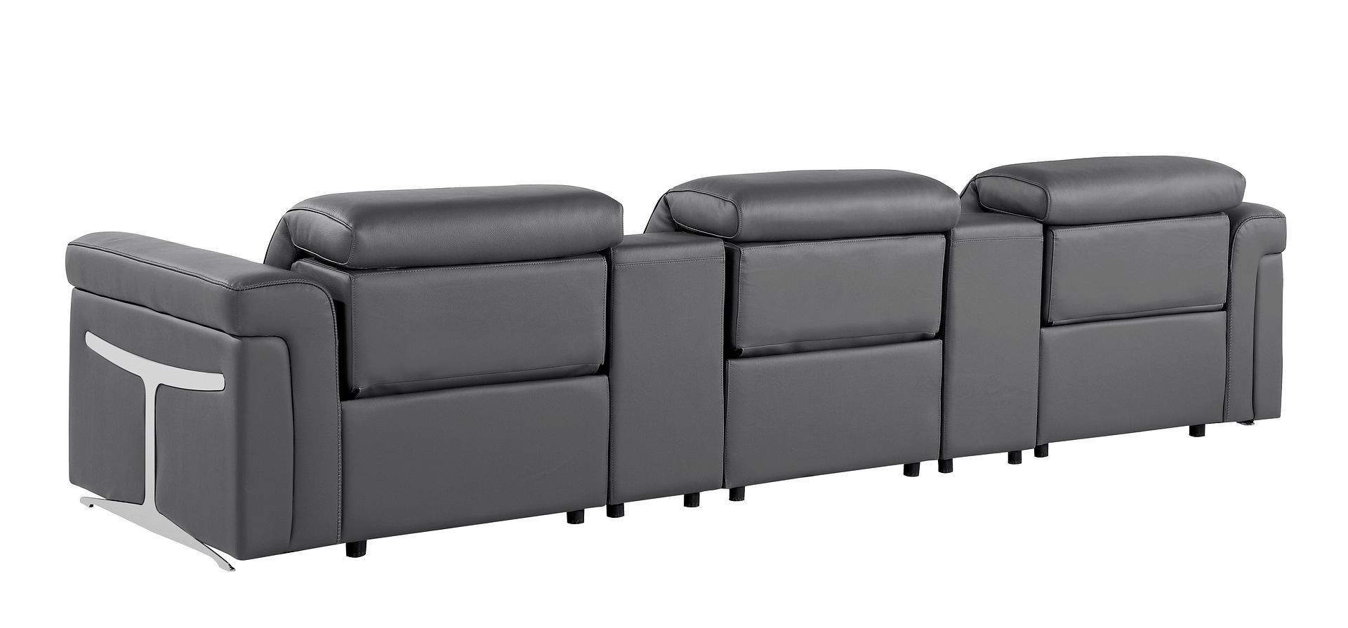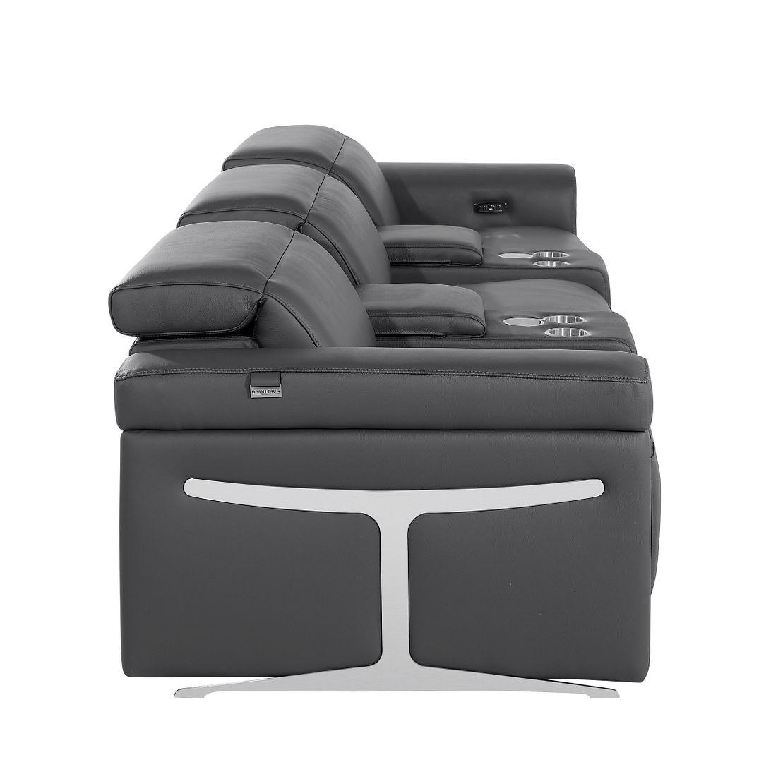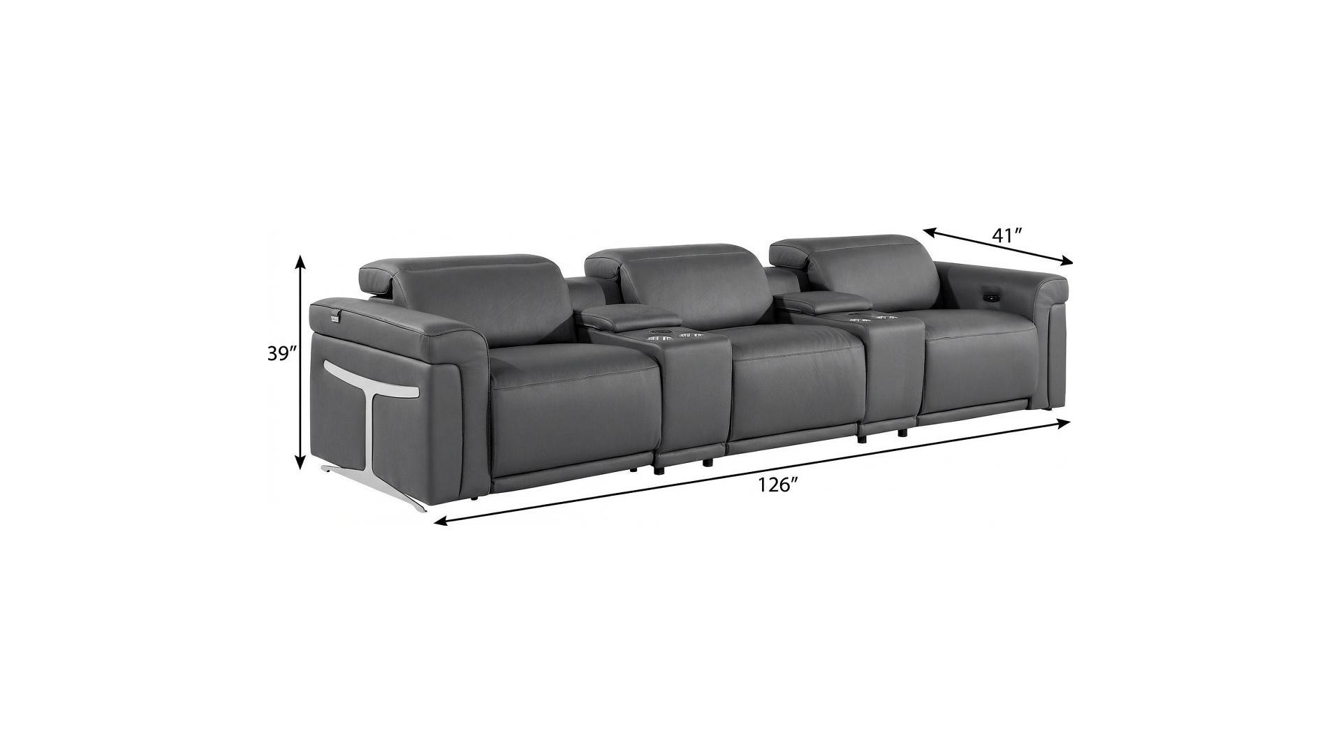 Superior construction from fabulously soft and high grade leather gives this 126-inch dark gray top grain leather reclining metal usb sofa a leg up on the competition. The premium leather used makes your lounging luxuriously comfortable and adds an elegant appeal to your space. Solid colors give you lots of decorative options and are easy to work into your decor scheme. Pocket spring construction gives this piece strong support and makes it comfortable to sit even for long periods of time. Rolled arms offer a comfy place to rest. Black stainless steel legs effortlessly elevate the room and add a touch of contemporary design. A great showpiece for your room, this sofa is a must have. 39.00-inch h x 126.00-inch w x 41.00-inch d.
