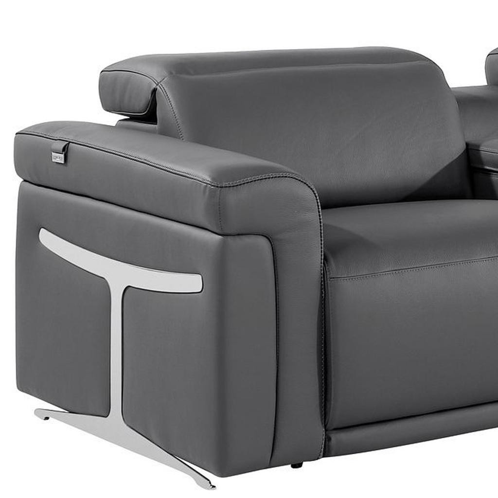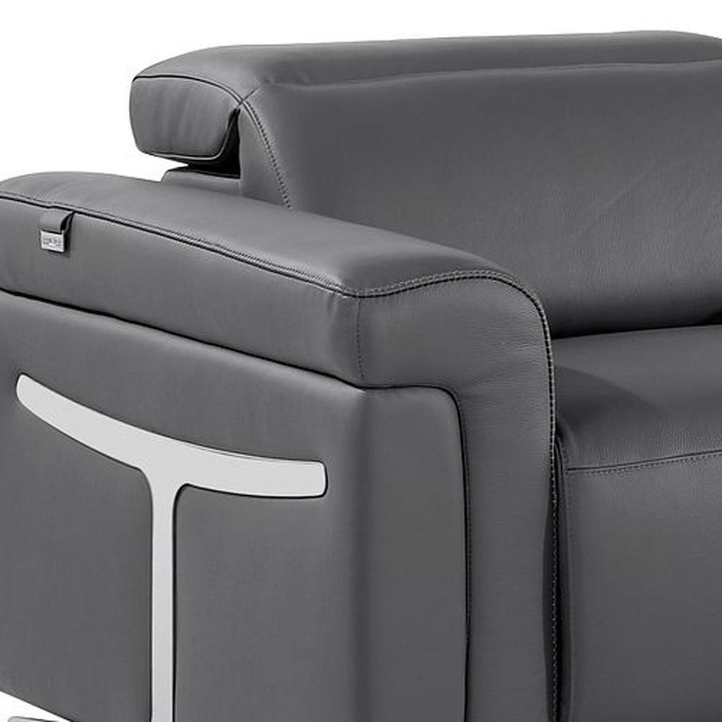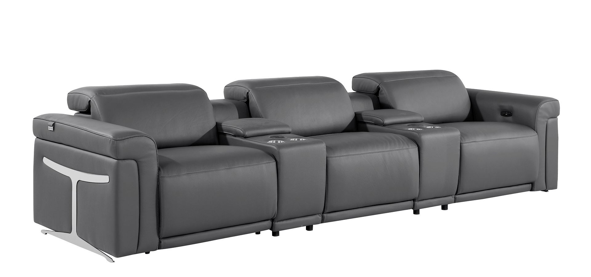 Superior construction from fabulously soft and high grade leather gives this 126-inch dark gray top grain leather reclining metal usb sofa a leg up on the competition. The premium leather used makes your lounging luxuriously comfortable and adds an elegant appeal to your space. Solid colors give you lots of decorative options and are easy to work into your decor scheme. Pocket spring construction gives this piece strong support and makes it comfortable to sit even for long periods of time. Rolled arms offer a comfy place to rest. Black stainless steel legs effortlessly elevate the room and add a touch of contemporary design. A great showpiece for your room, this sofa is a must have. 39.00-inch h x 126.00-inch w x 41.00-inch d.