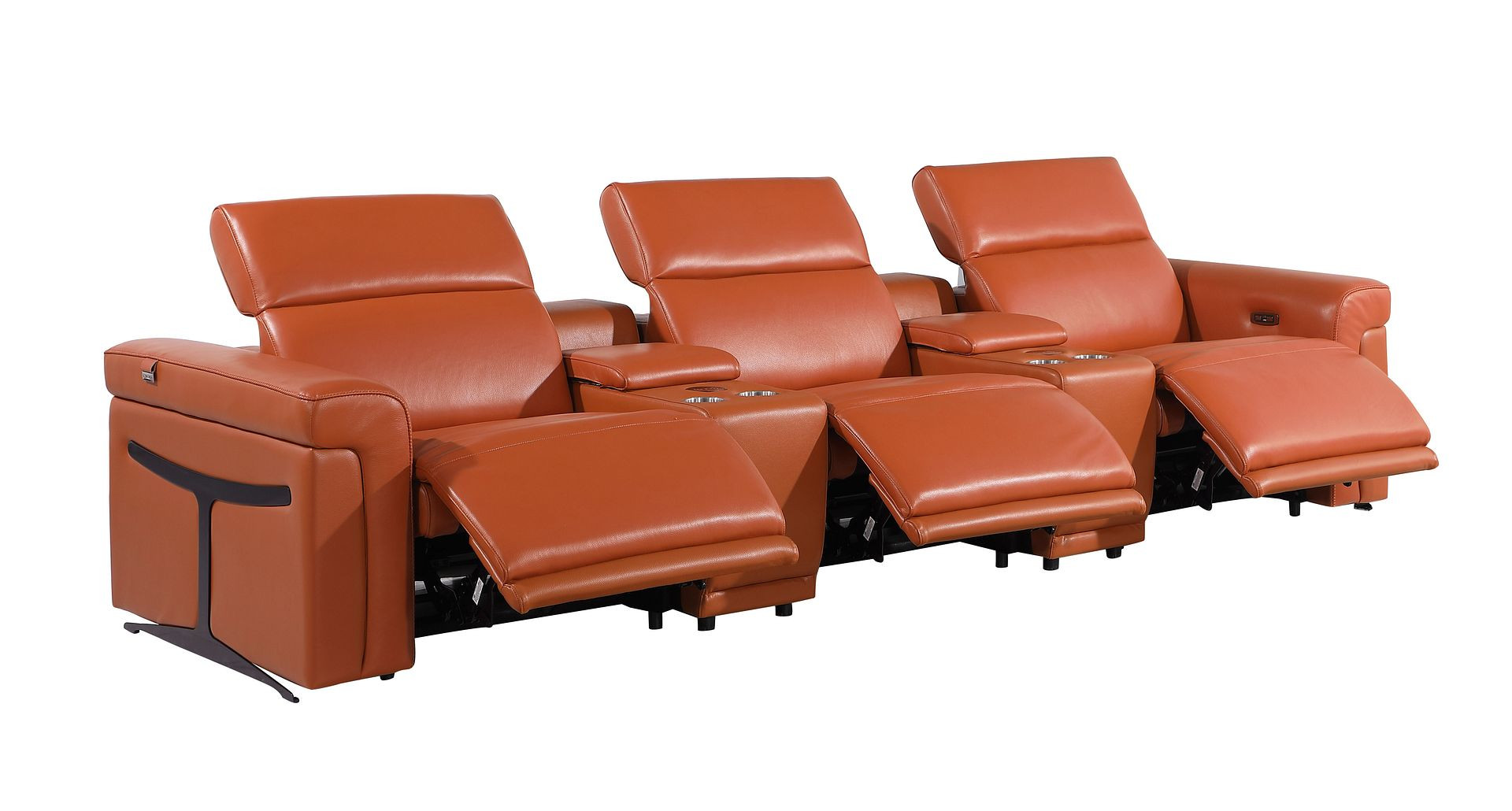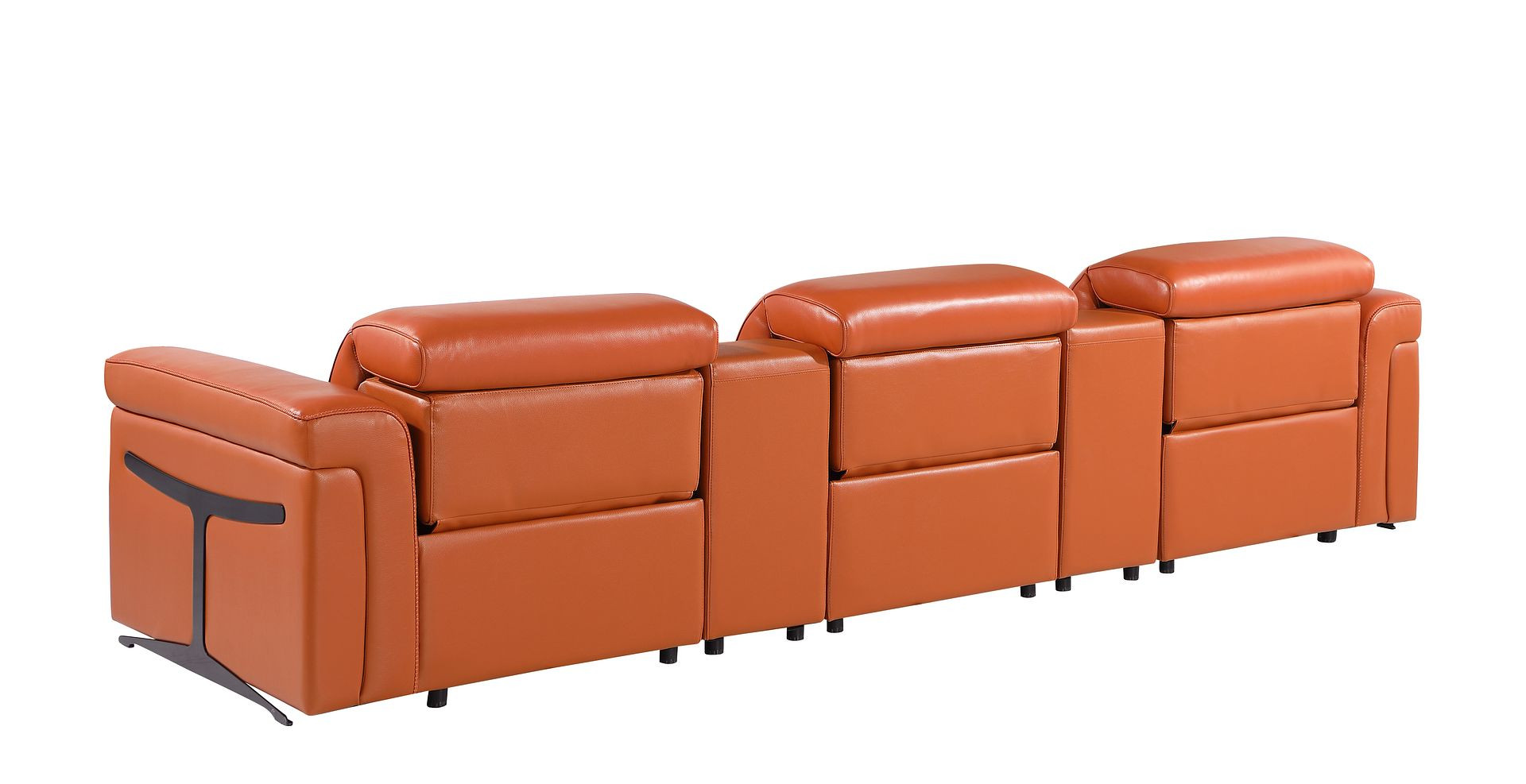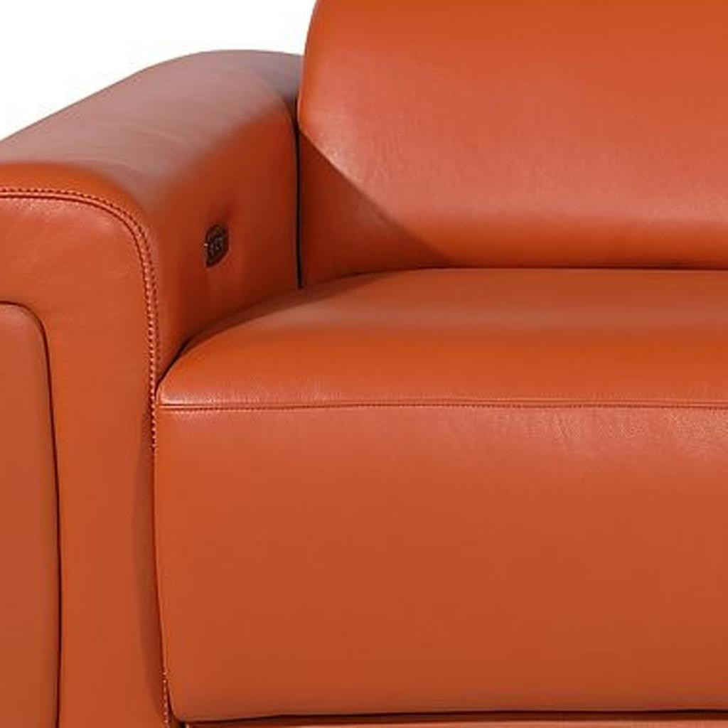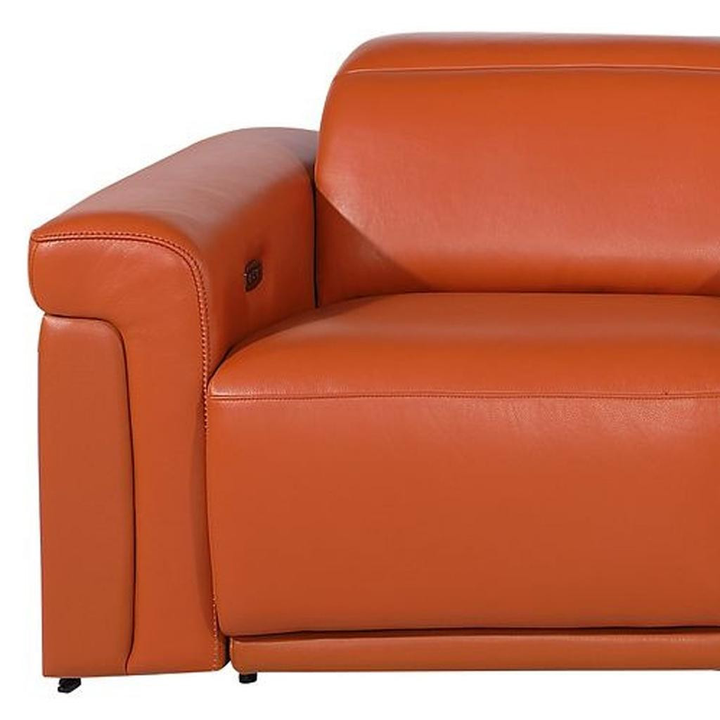 Superior construction from fabulously soft and high grade leather gives this 126-inch camel top grain leather reclining metal usb sofa a leg up on the competition. The premium leather used makes your lounging luxuriously comfortable and adds an elegant appeal to your space. Solid colors give you lots of decorative options and are easy to work into your decor scheme. Pocket spring construction gives this piece strong support and makes it comfortable to sit even for long periods of time. Rolled arms offer a comfy place to rest. Black stainless steel legs effortlessly elevate the room and add a touch of contemporary design. A great showpiece for your room, this sofa is a must have. 39.00-inch h x 126.00-inch w x 41.00-inch d.