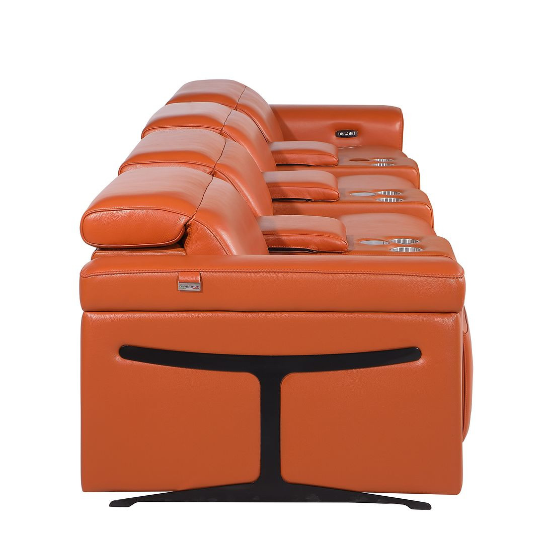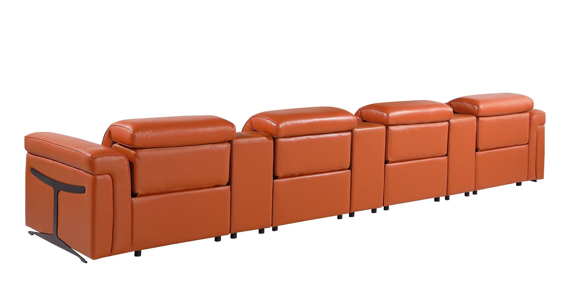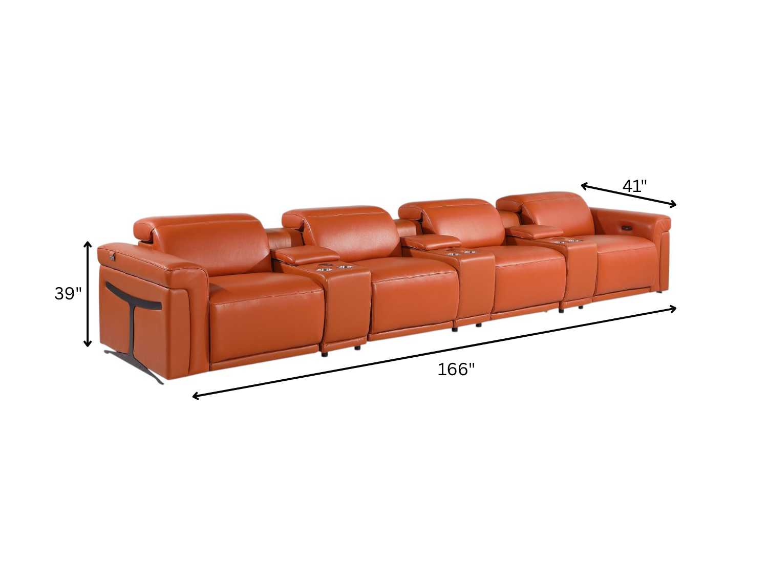 An interior designer's dream, this buttery soft high grade leather 166-inch camel top grain leather reclining metal usb sofa will bring just the right touch to your space. The premium leather used makes your lounging luxuriously comfortable and adds an elegant appeal to your space. Solid colors give you lots of decorative options and are easy to work into your decor scheme. Pocket spring construction gives this piece strong support and makes it comfortable to sit even for long periods of time. Rolled arms offer a comfy place to rest. Black stainless steel legs effortlessly elevate the room and add a touch of contemporary design. A great showpiece for your room, this sofa is a must have. 39.00-inch h x 166.00-inch w x 41.00-inch d.