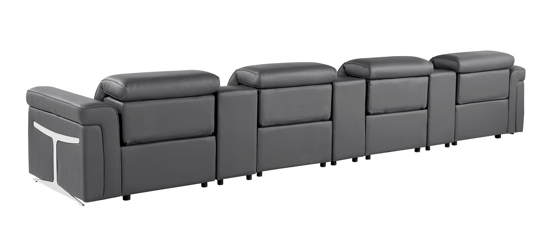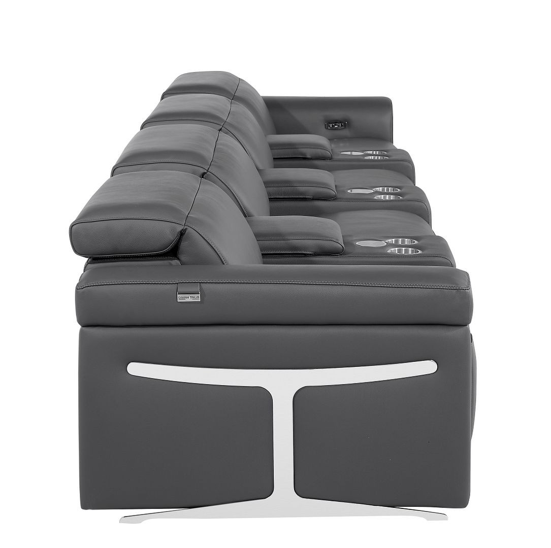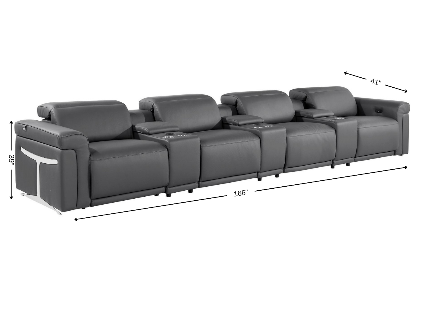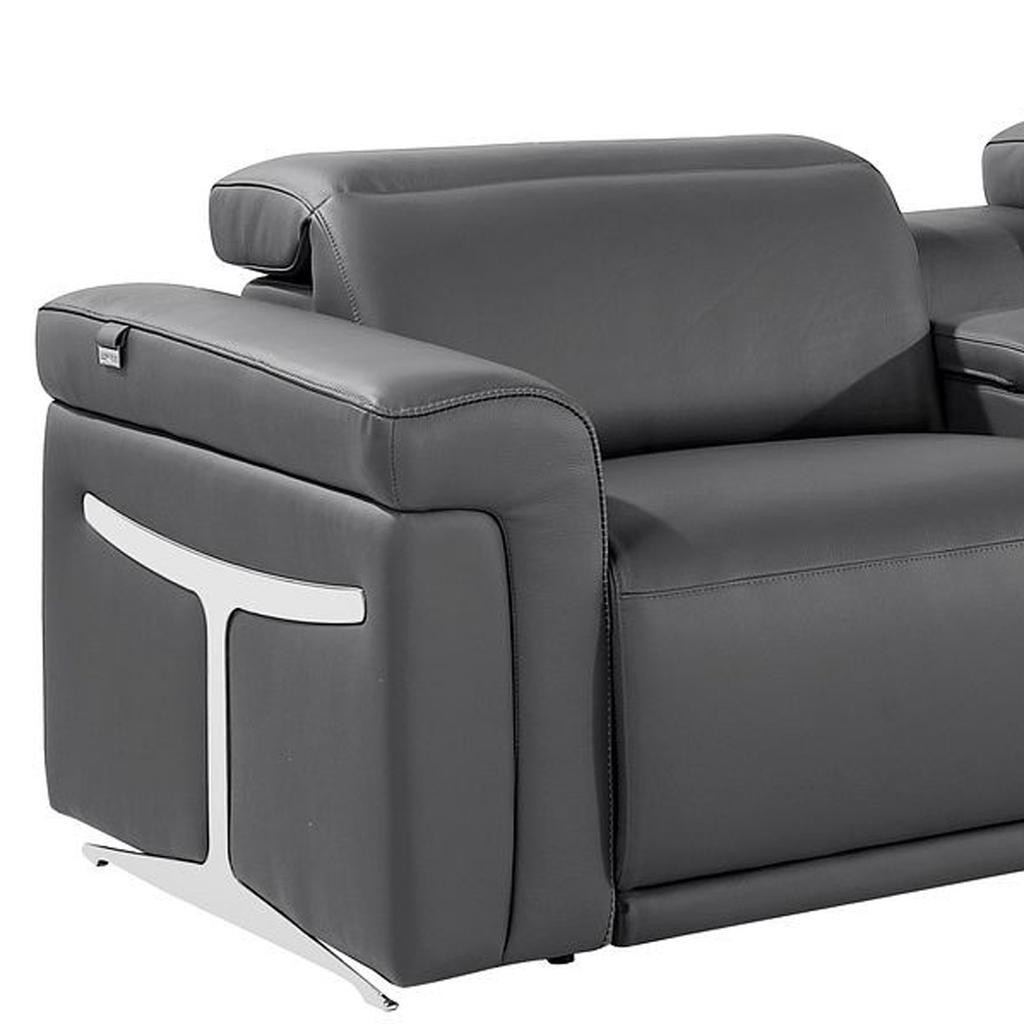 An interior designer's dream, this buttery soft high grade leather 166-inch dark gray top grain leather reclining metal usb sofa will bring just the right touch to your space. The premium leather used makes your lounging luxuriously comfortable and adds an elegant appeal to your space. Solid colors give you lots of decorative options and are easy to work into your decor scheme. Pocket spring construction gives this piece strong support and makes it comfortable to sit even for long periods of time. Rolled arms offer a comfy place to rest. Black stainless steel legs effortlessly elevate the room and add a touch of contemporary design. A great showpiece for your room, this sofa is a must have. 39.00-inch h x 166.00-inch w x 41.00-inch d.