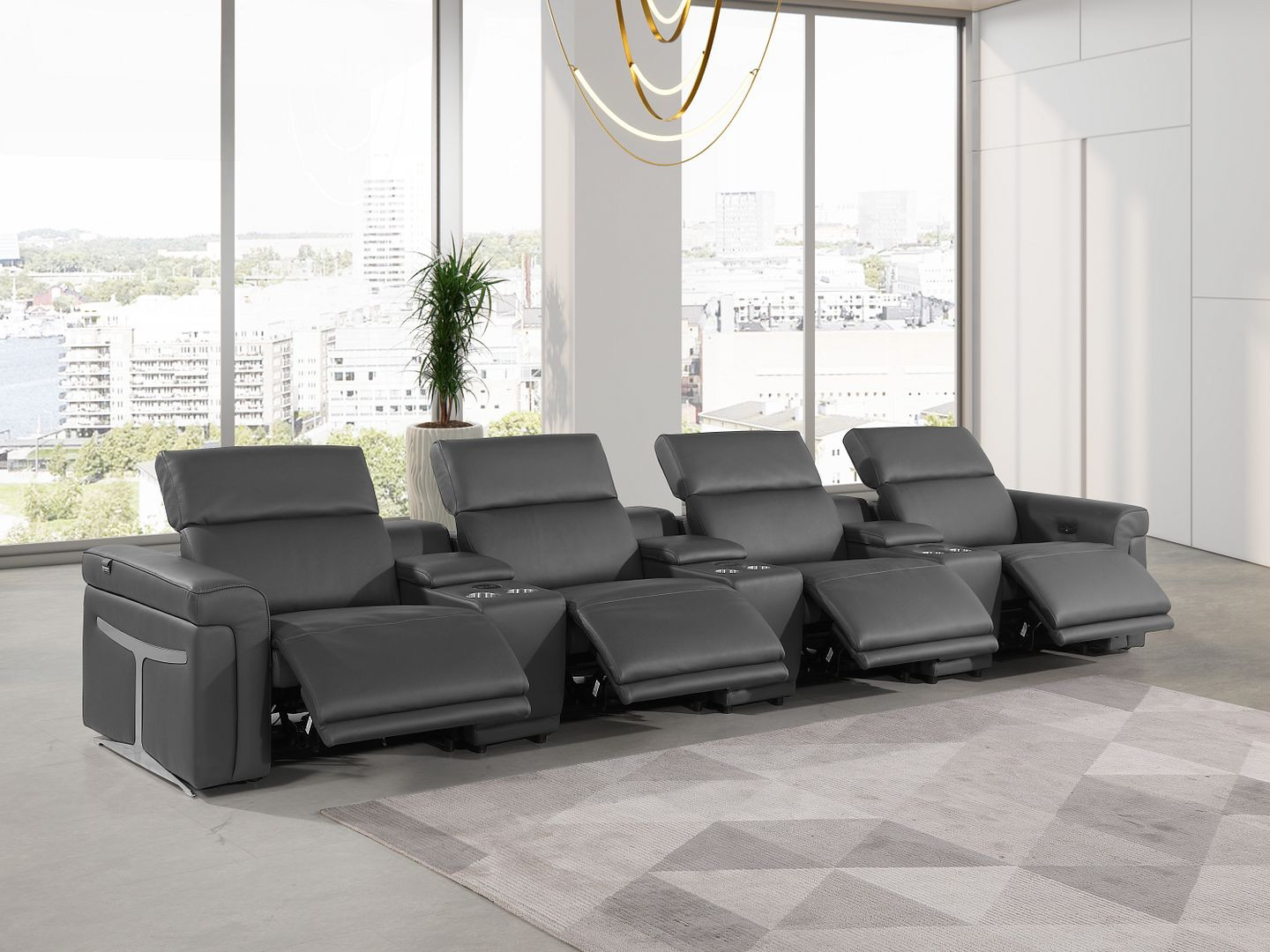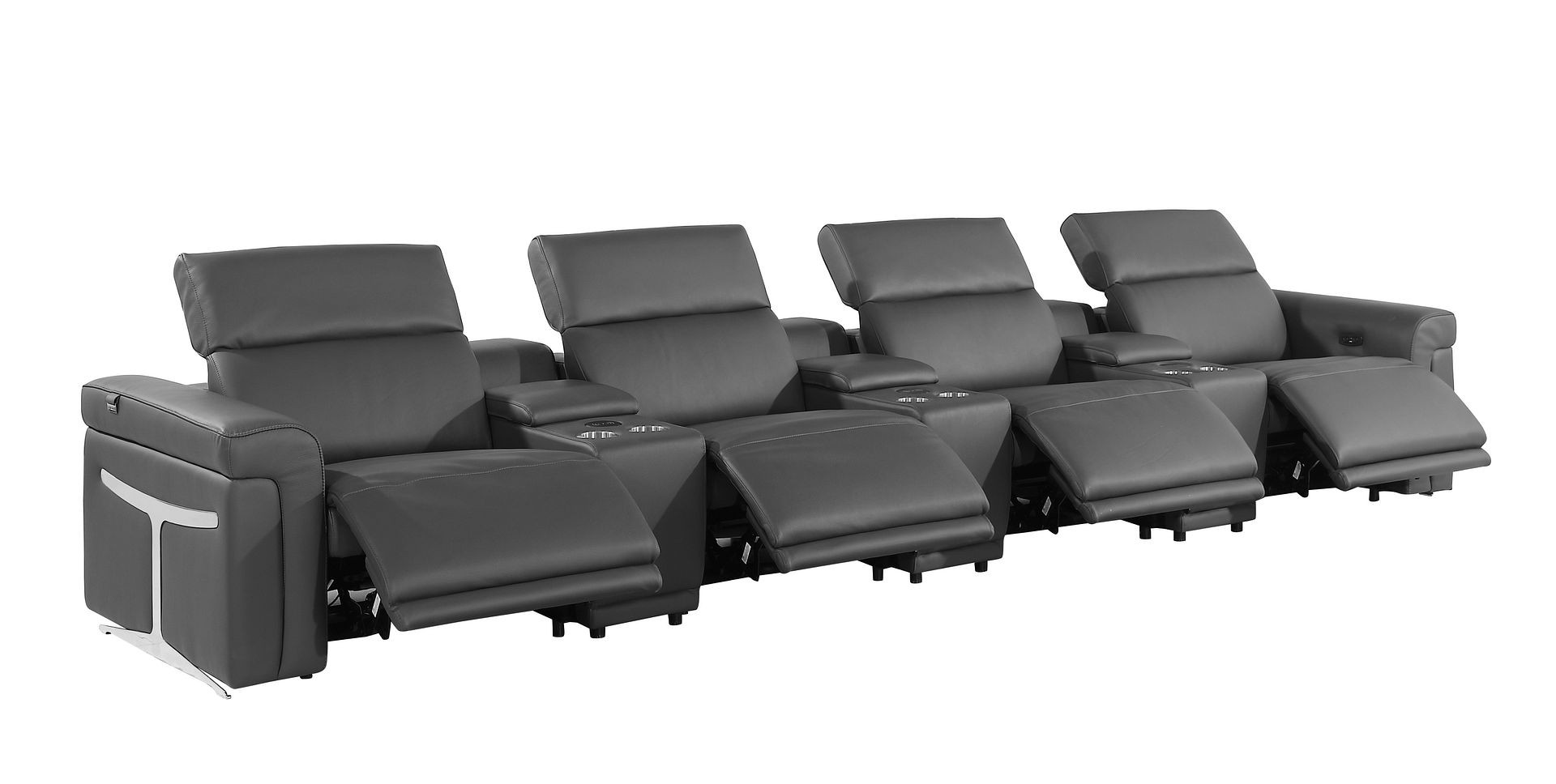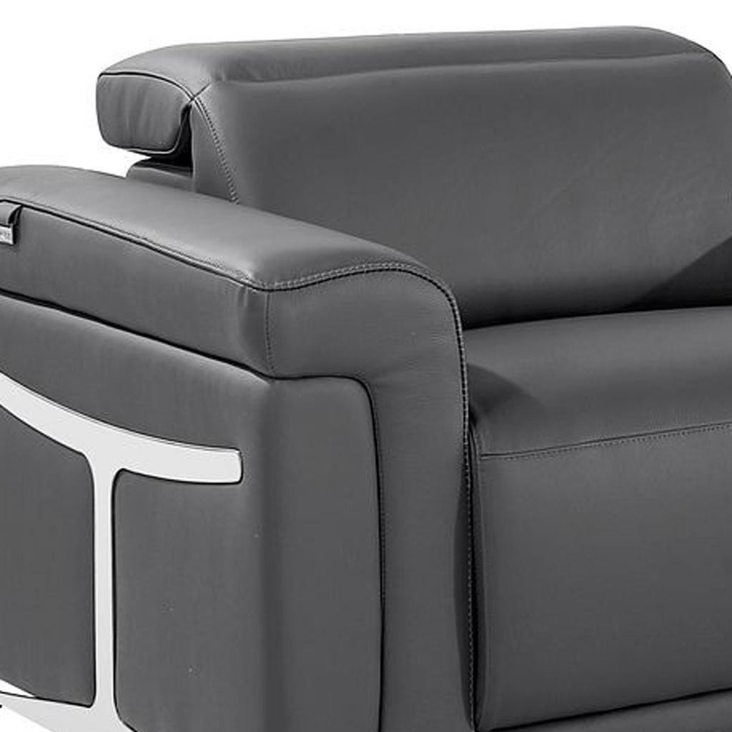 An interior designer's dream, this buttery soft high grade leather 166-inch dark gray top grain leather reclining metal usb sofa will bring just the right touch to your space. The premium leather used makes your lounging luxuriously comfortable and adds an elegant appeal to your space. Solid colors give you lots of decorative options and are easy to work into your decor scheme. Pocket spring construction gives this piece strong support and makes it comfortable to sit even for long periods of time. Rolled arms offer a comfy place to rest. Black stainless steel legs effortlessly elevate the room and add a touch of contemporary design. A great showpiece for your room, this sofa is a must have. 39.00-inch h x 166.00-inch w x 41.00-inch d.
