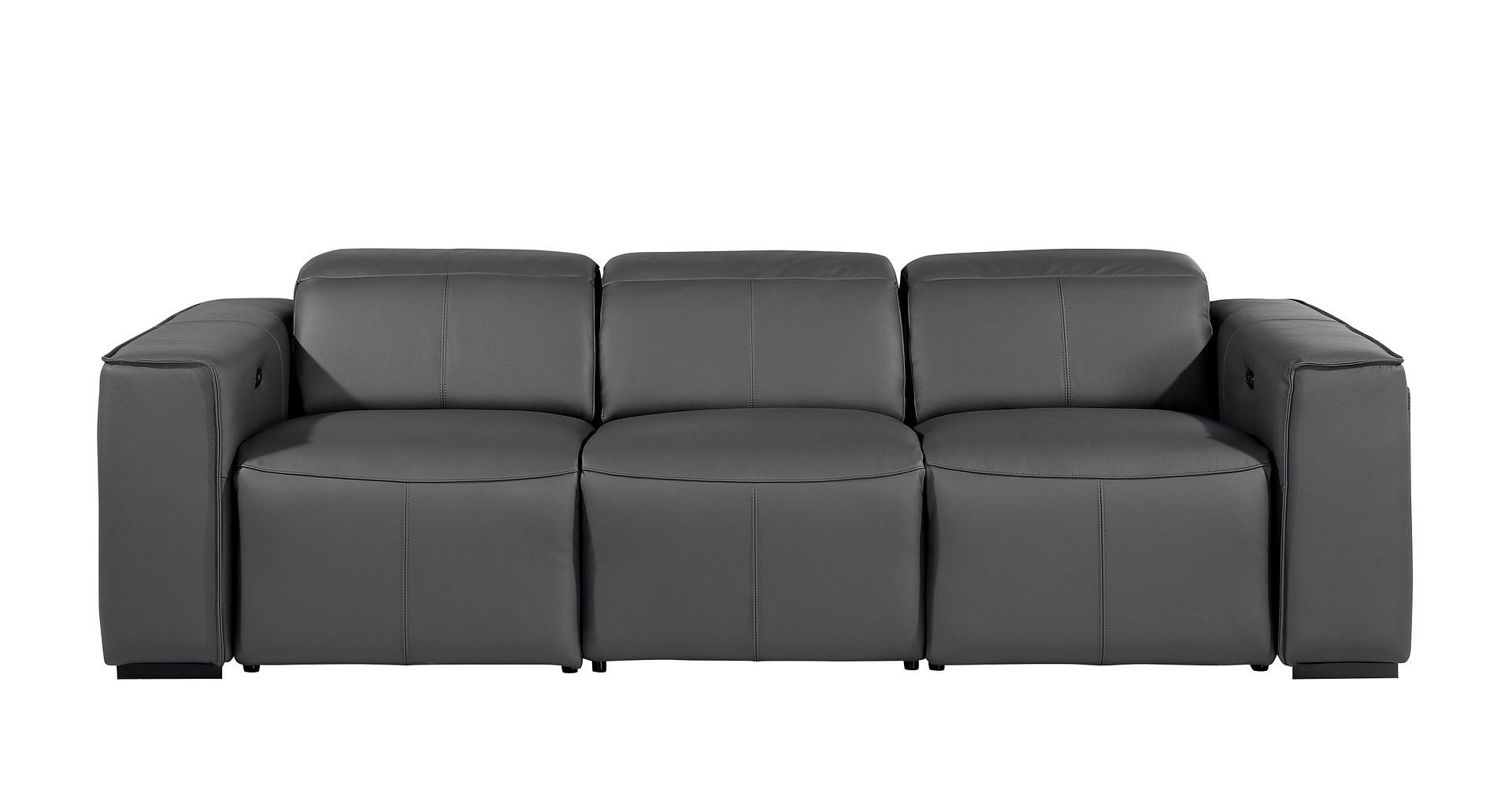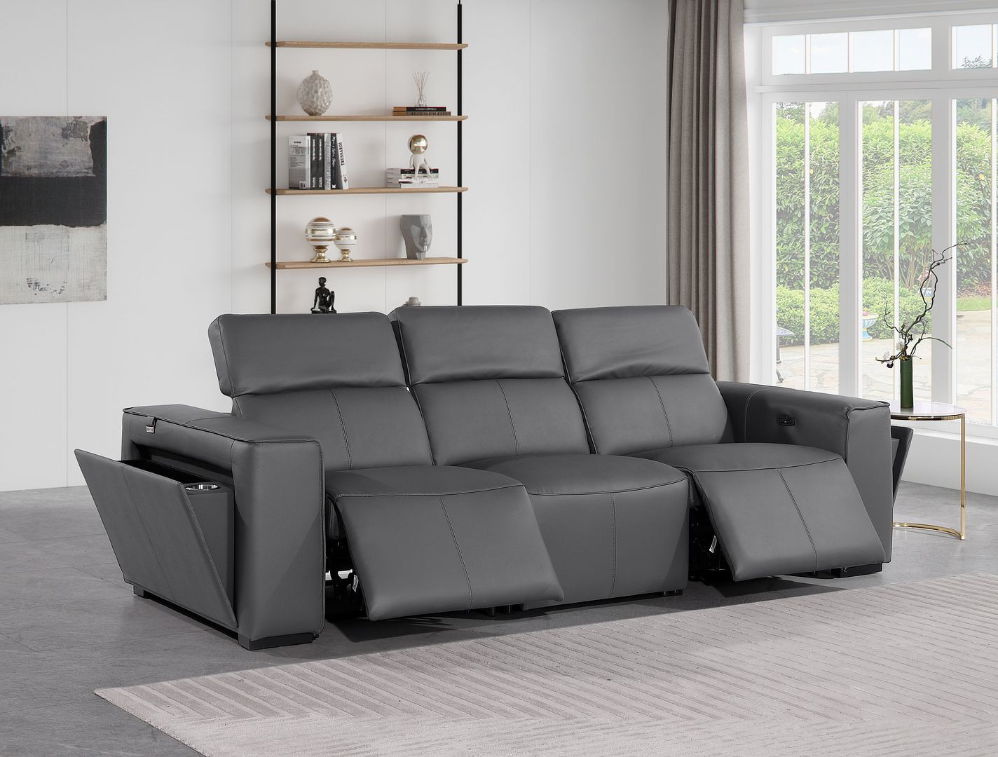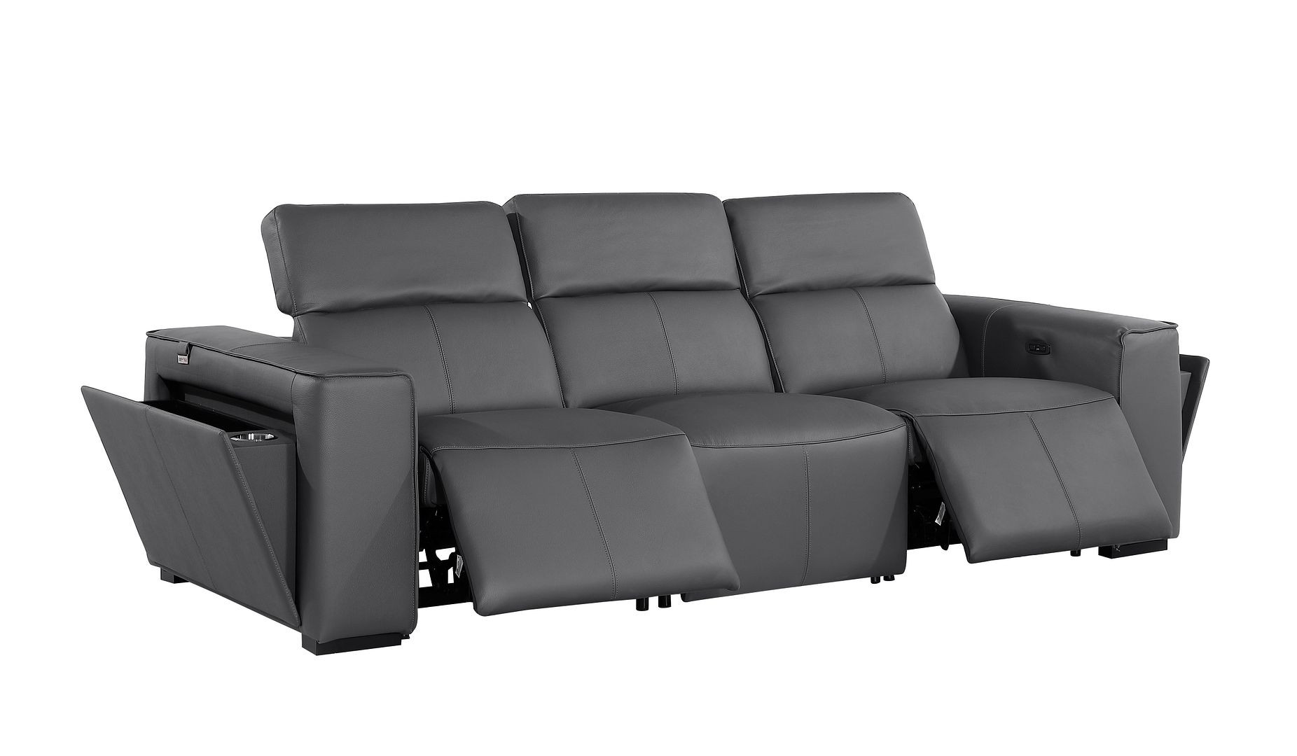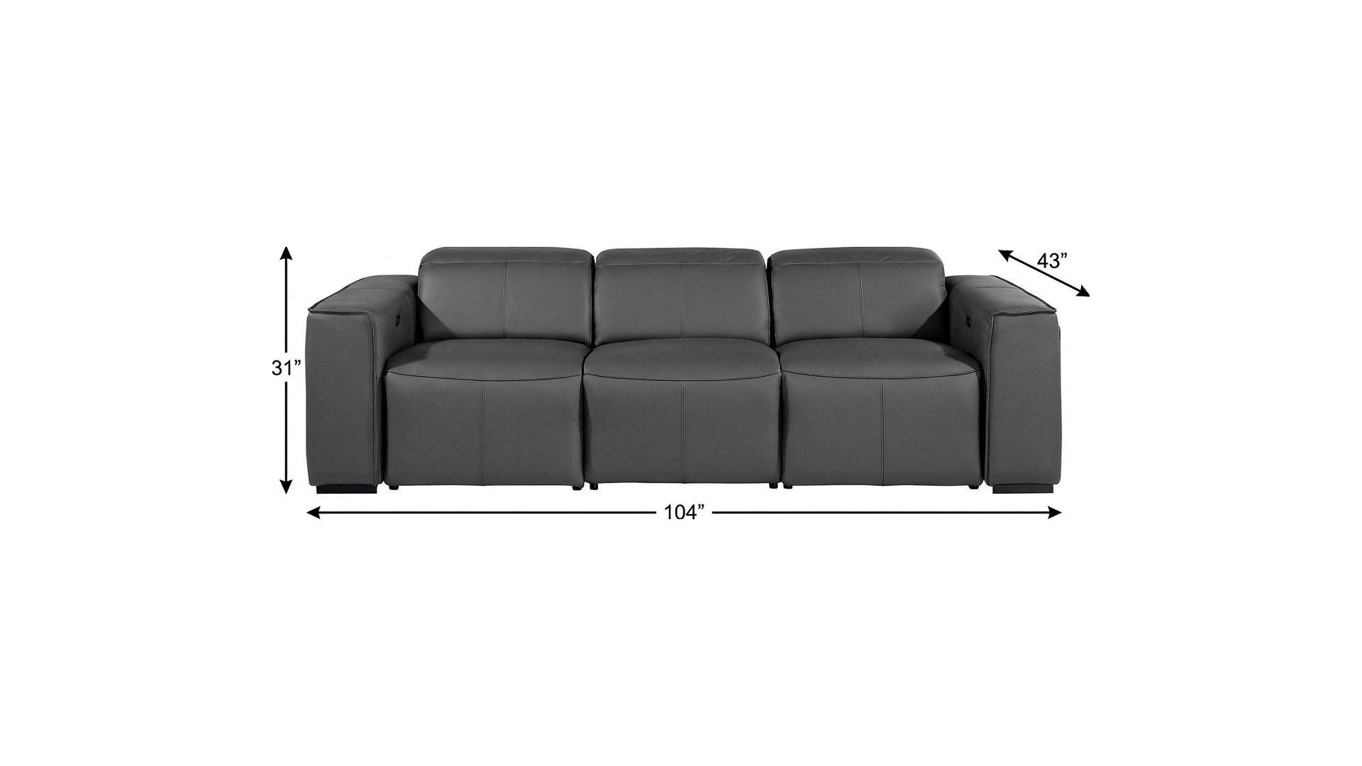 Made of the highest quality, supple leather, this 104-inch dark gray top grain leather reclining metal usb sofa will be the star of your space. The high grade premium leather used makes your lounging luxuriously comfortable and adds an elegant appeal to your space. Solid colors give you lots of decorative options and are easy to work into your decor scheme. Pocket spring construction gives this piece strong support and makes it comfortable to sit even for long periods of time. Square arms offer a comfy place to rest. Brown stainless steel legs effortlessly elevate the room and add a touch of contemporary design. A great showpiece for your room, this sofa is a must have. 31.00-inch h x 104.00-inch w x 43.00-inch d.