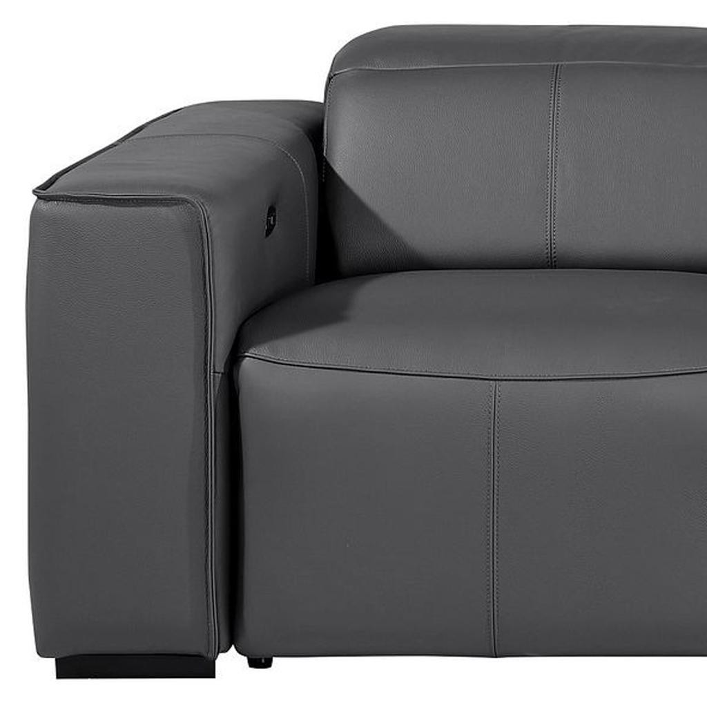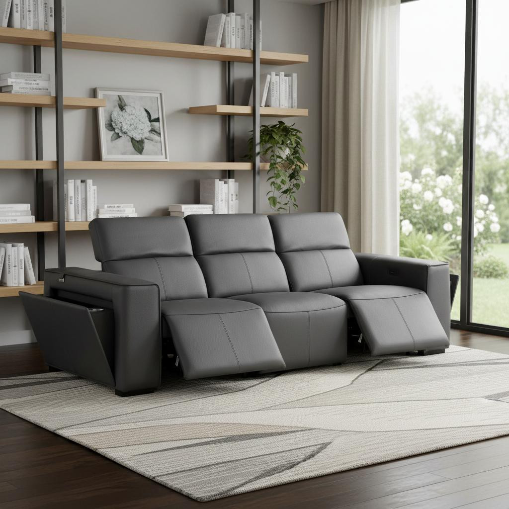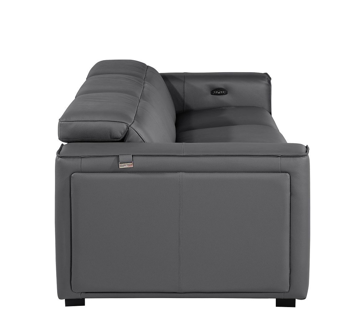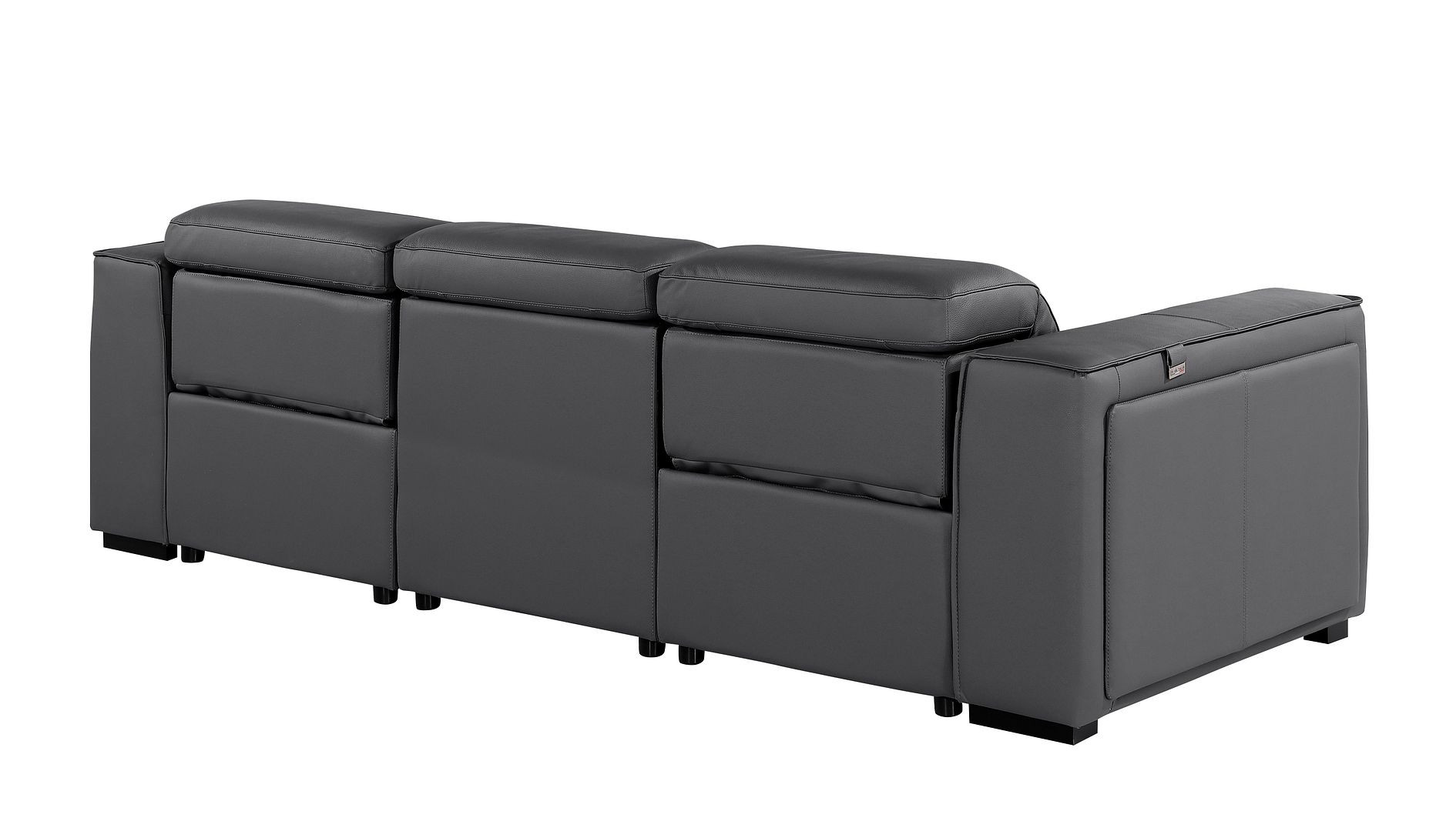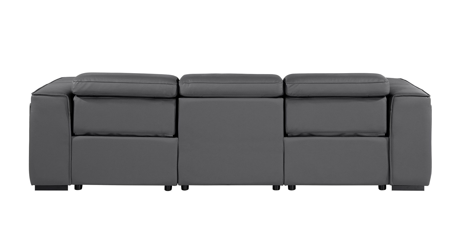 Made of the highest quality, supple leather, this 104-inch dark gray top grain leather reclining metal usb sofa will be the star of your space. The high grade premium leather used makes your lounging luxuriously comfortable and adds an elegant appeal to your space. Solid colors give you lots of decorative options and are easy to work into your decor scheme. Pocket spring construction gives this piece strong support and makes it comfortable to sit even for long periods of time. Square arms offer a comfy place to rest. Brown stainless steel legs effortlessly elevate the room and add a touch of contemporary design. A great showpiece for your room, this sofa is a must have. 31.00-inch h x 104.00-inch w x 43.00-inch d.