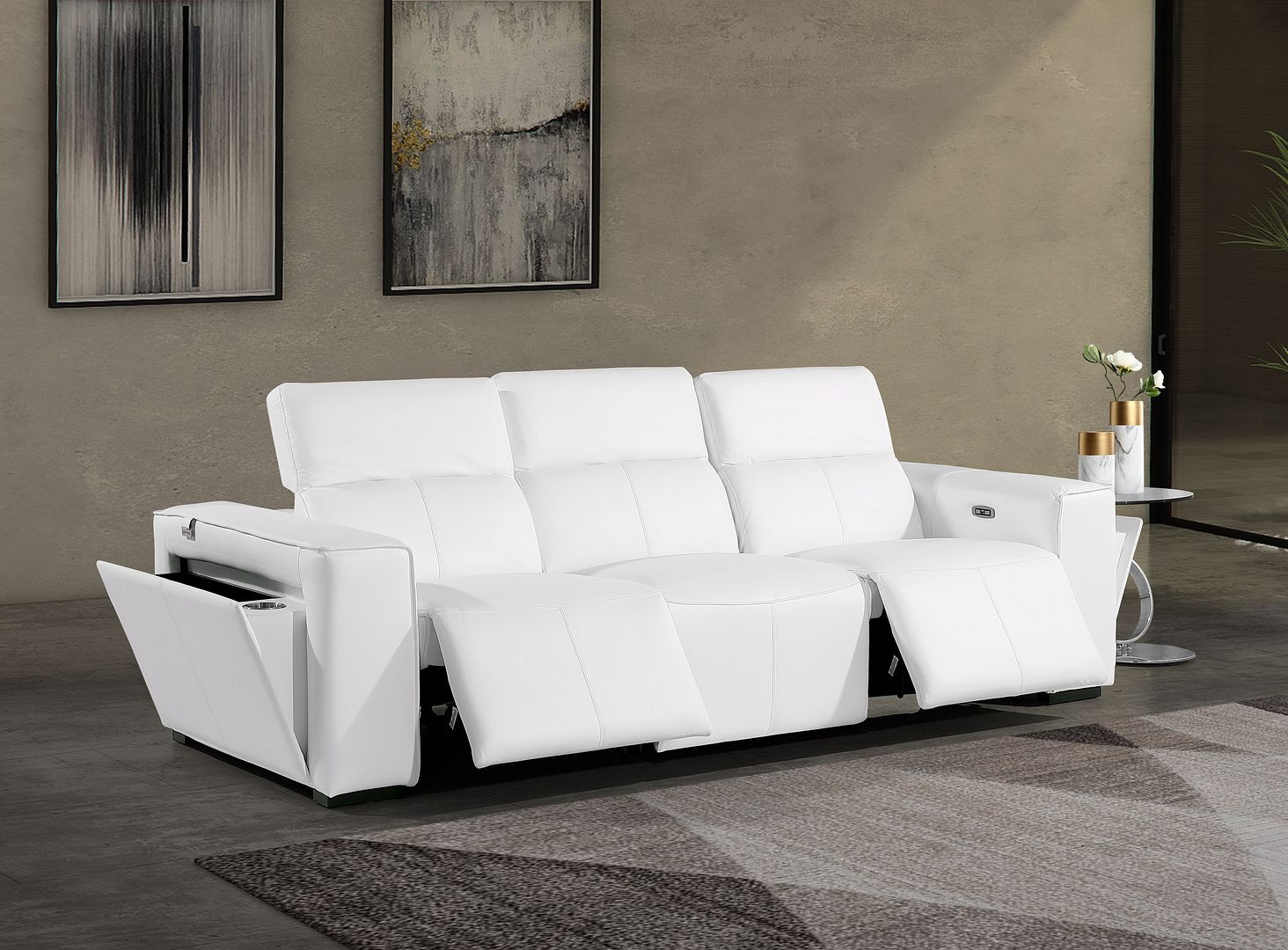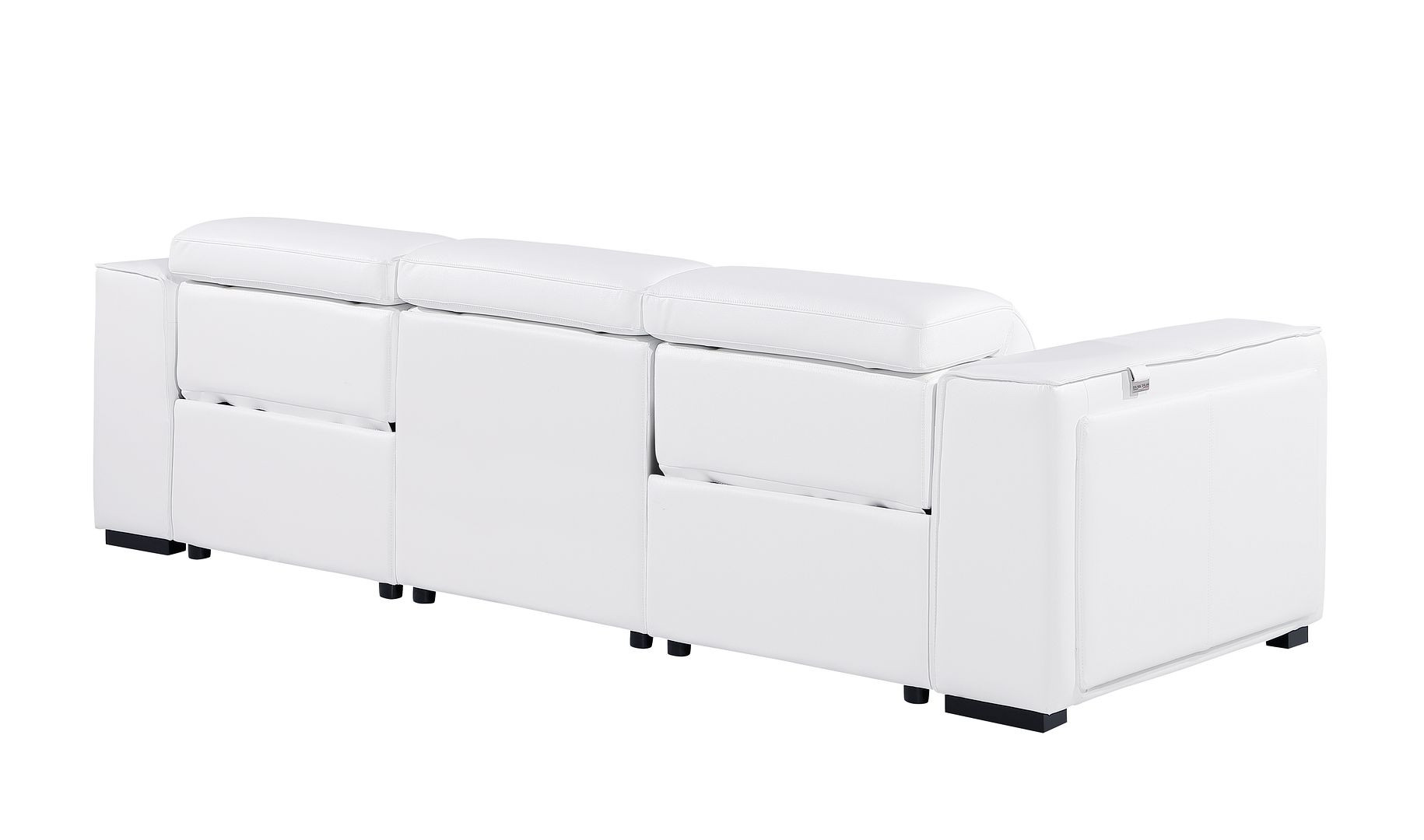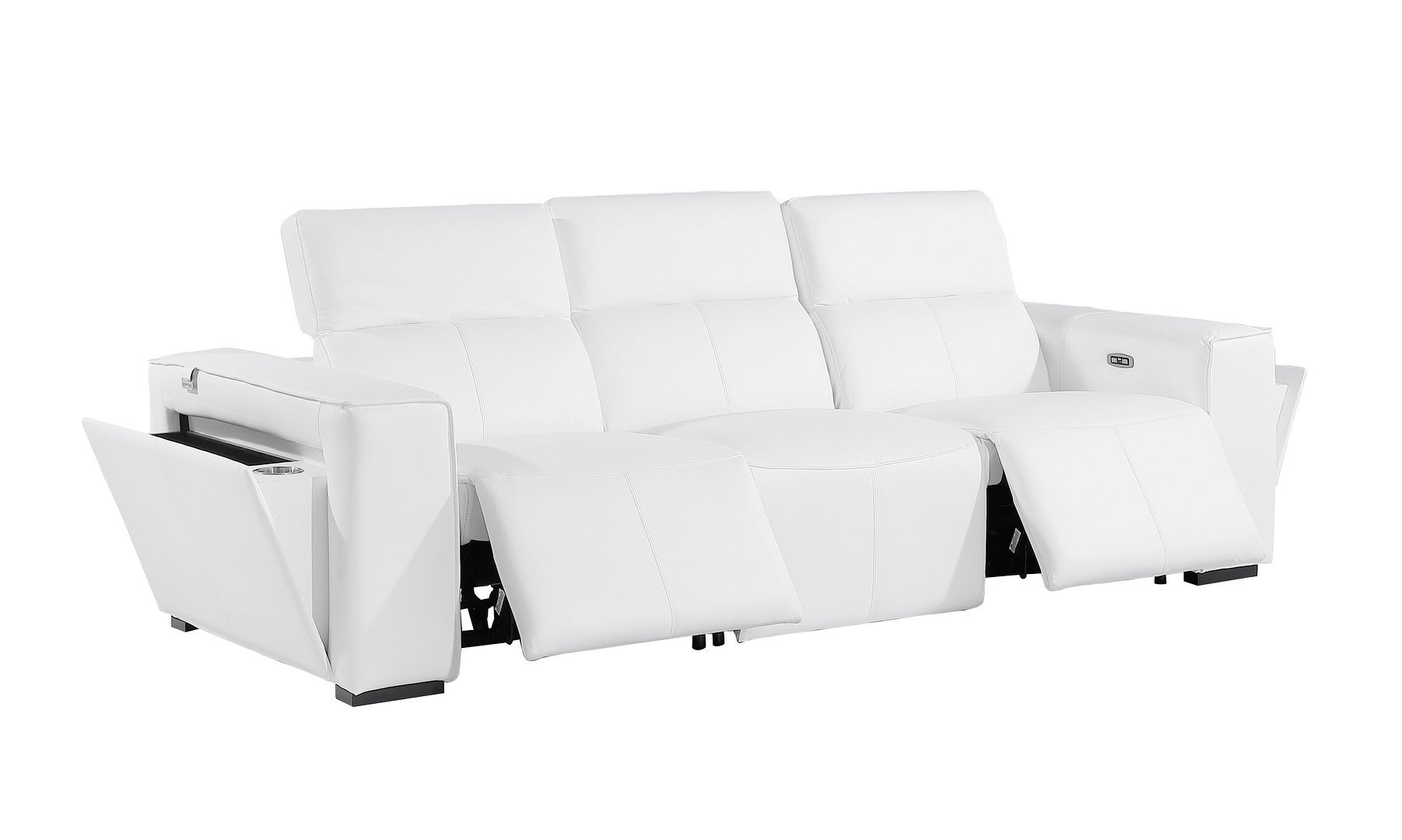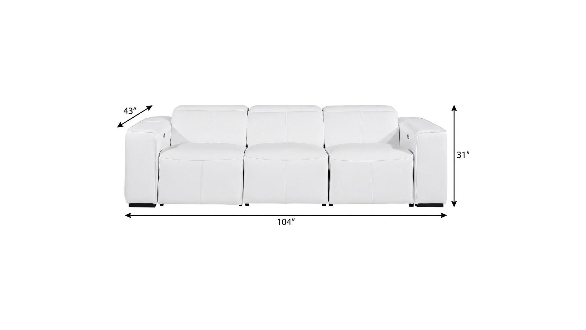 Made of the highest quality, supple leather, this 104-inch white top grain leather reclining metal usb sofa will be the star of your space. The high grade premium leather used makes your lounging luxuriously comfortable and adds an elegant appeal to your space. Solid colors give you lots of decorative options and are easy to work into your decor scheme. Pocket spring construction gives this piece strong support and makes it comfortable to sit even for long periods of time. Square arms offer a comfy place to rest. Brown stainless steel legs effortlessly elevate the room and add a touch of contemporary design. A great showpiece for your room, this sofa is a must have. 31.00-inch h x 104.00-inch w x 43.00-inch d.