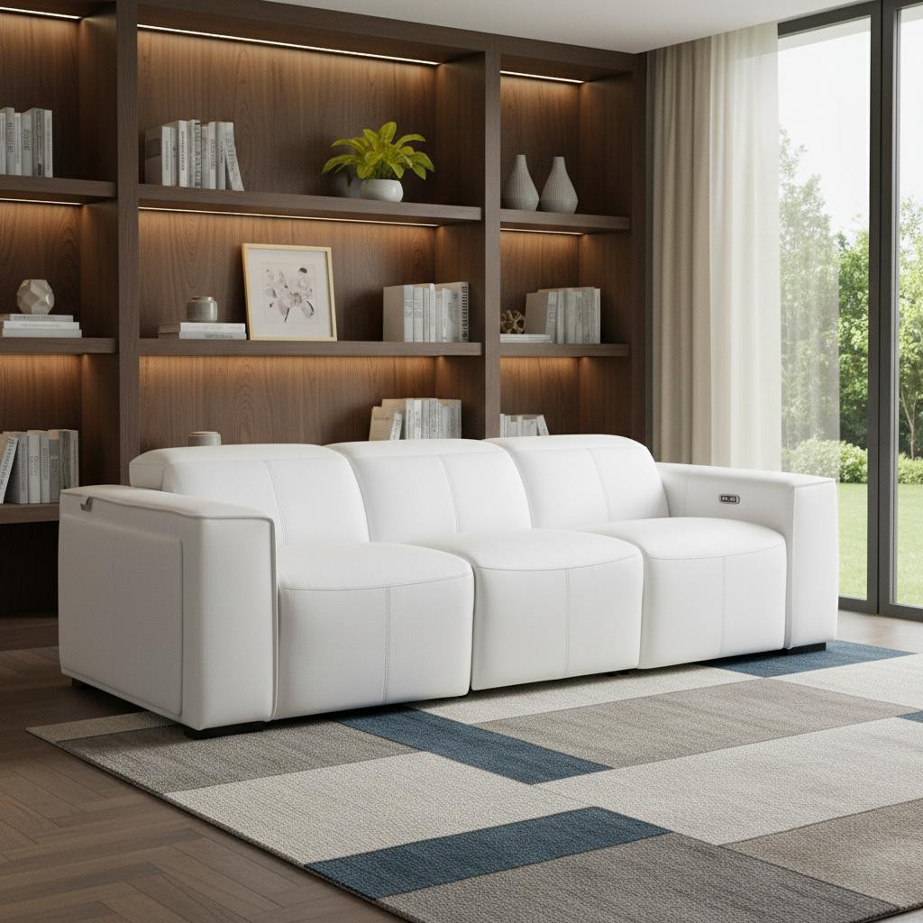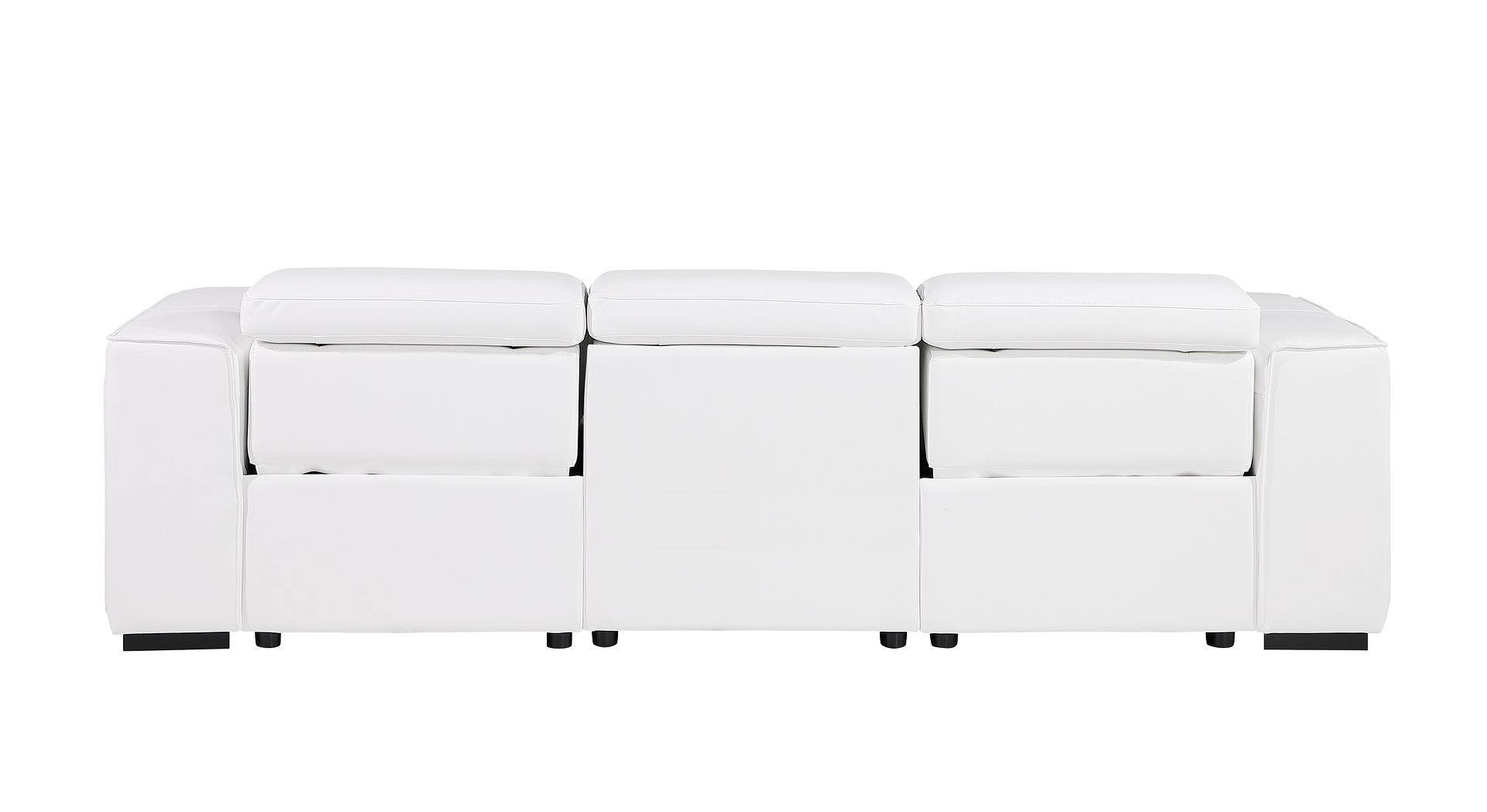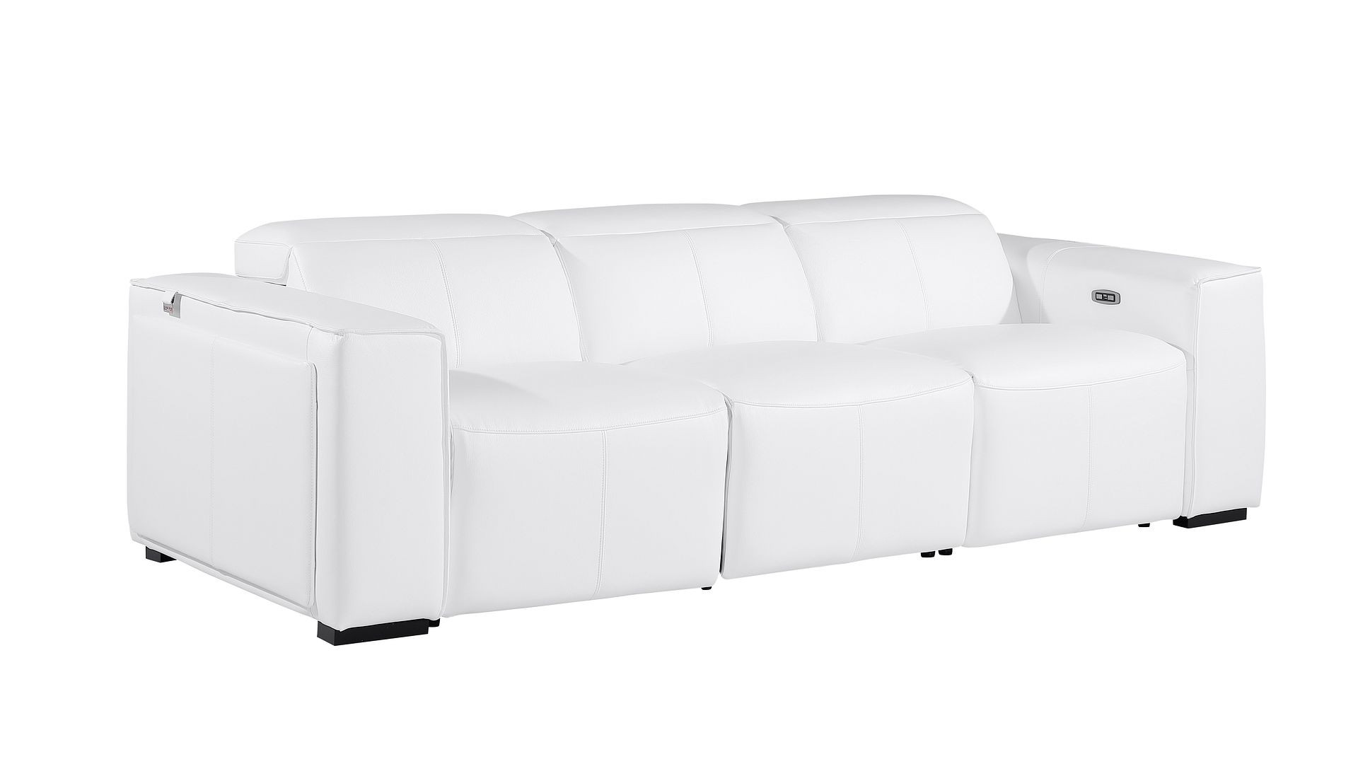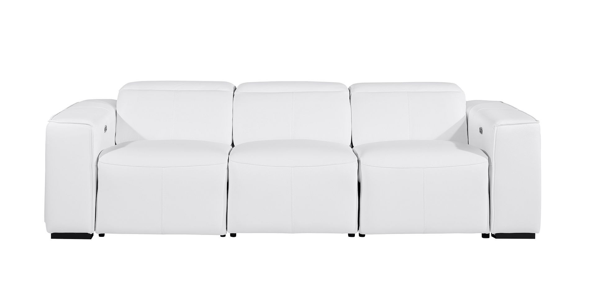 Made of the highest quality, supple leather, this 104-inch white top grain leather reclining metal usb sofa will be the star of your space. The high grade premium leather used makes your lounging luxuriously comfortable and adds an elegant appeal to your space. Solid colors give you lots of decorative options and are easy to work into your decor scheme. Pocket spring construction gives this piece strong support and makes it comfortable to sit even for long periods of time. Square arms offer a comfy place to rest. Brown stainless steel legs effortlessly elevate the room and add a touch of contemporary design. A great showpiece for your room, this sofa is a must have. 31.00-inch h x 104.00-inch w x 43.00-inch d.