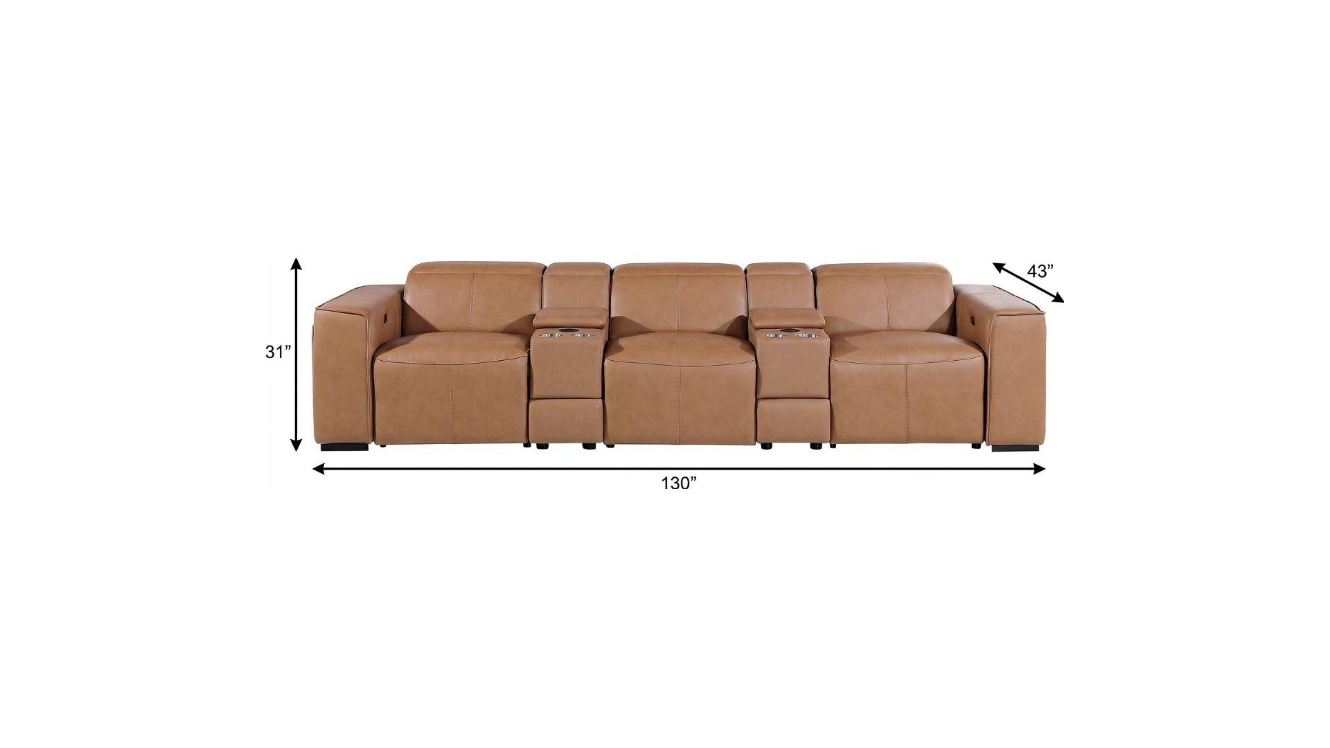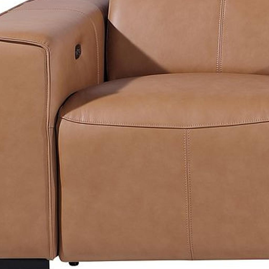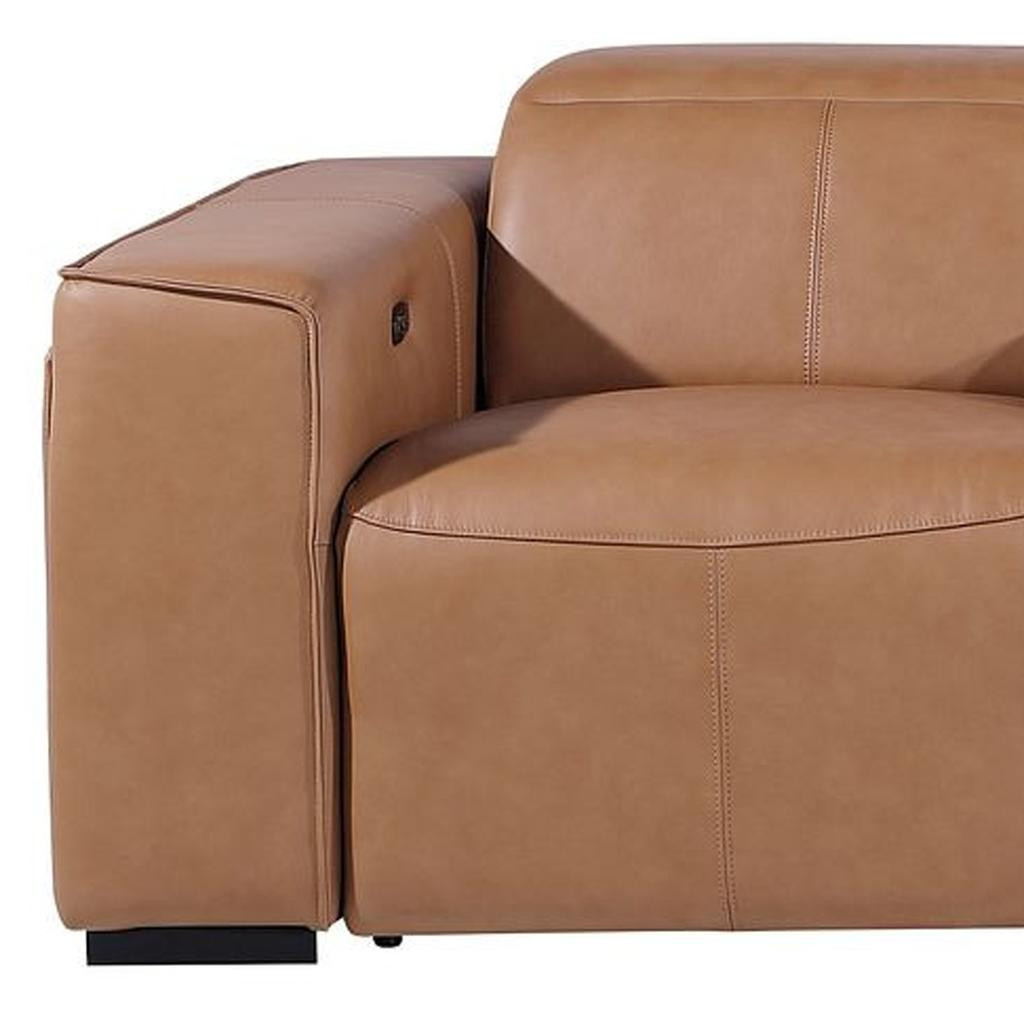 Superior construction from fabulously soft and high grade leather gives this 130-inch chestnut top grain leather reclining metal usb sofa a leg up on the competition. The premium leather used makes your lounging luxuriously comfortable and adds an elegant appeal to your space. Solid colors give you lots of decorative options and are easy to work into your decor scheme. Pocket spring construction gives this piece strong support and makes it comfortable to sit even for long periods of time. Square arms offer a comfy place to rest. Brown stainless steel legs effortlessly elevate the room and add a touch of contemporary design. Built to last, this sofa will be a great centerpiece for your room. 31.00-inch h x 130.00-inch w x 43.00-inch d.