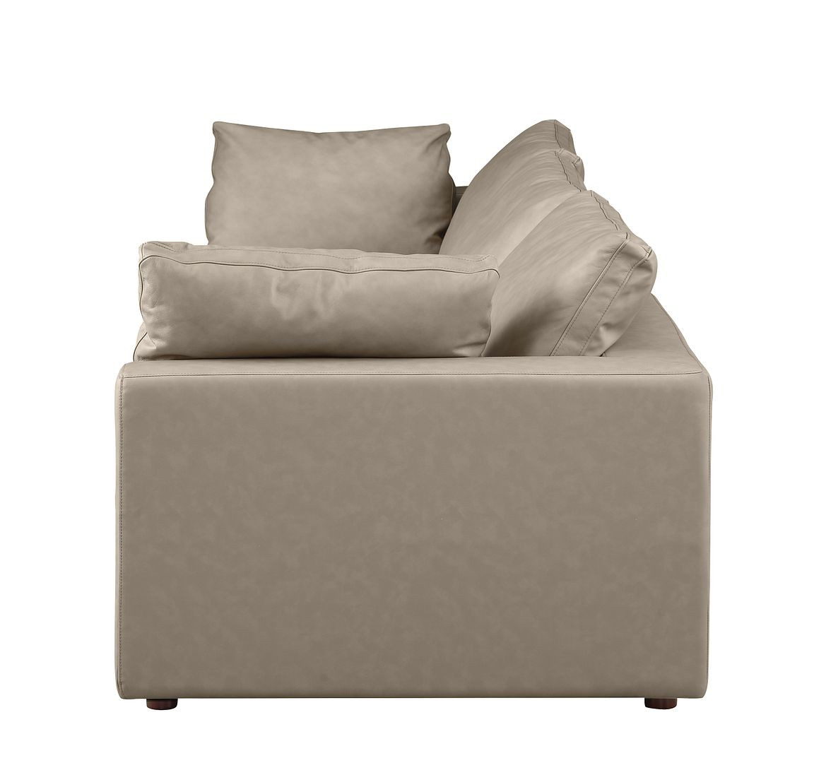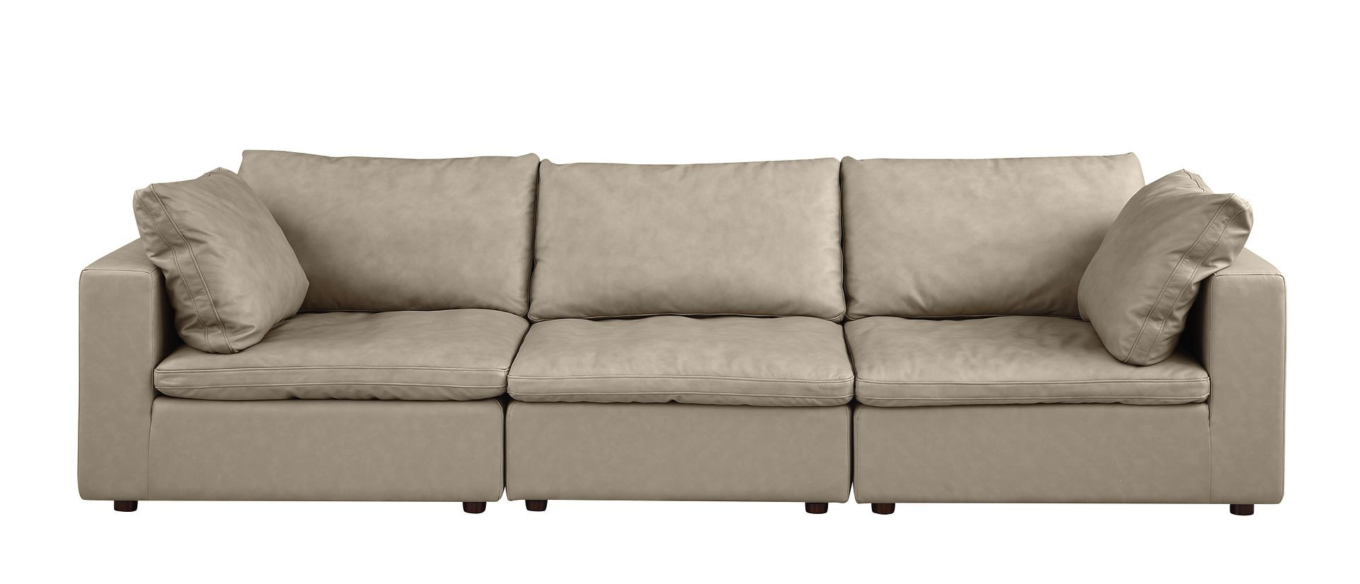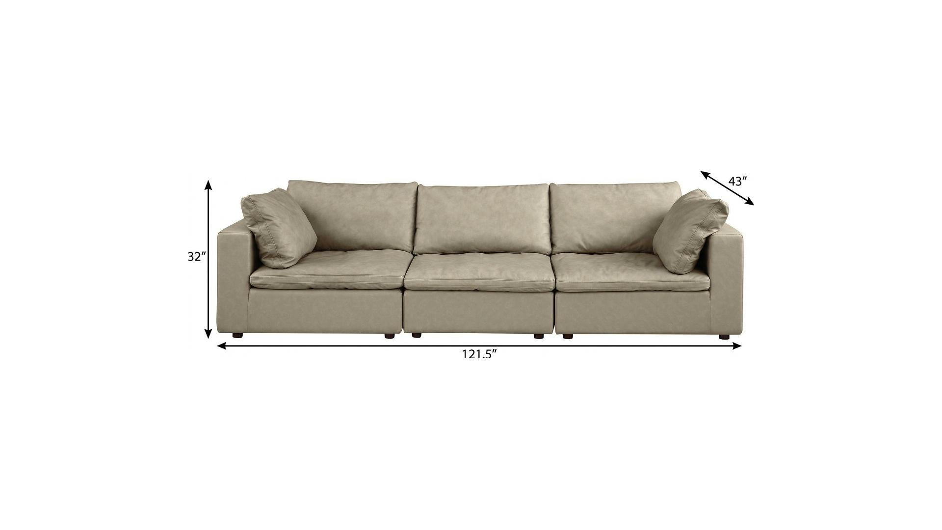 Superior construction from fabulously soft and high grade leather gives this 122-inch beige top grain leather reclining solid wood sofa a leg up on the competition. The premium leather used makes your lounging luxuriously comfortable and adds an elegant appeal to your space. Solid colors give you lots of decorative options and are easy to work into your decor scheme. Pocket spring construction gives this piece strong support and makes it comfortable to sit even for long periods of time. Square arms offer a comfy place to rest. Brown solid wood legs effortlessly elevate the room and add a touch of contemporary design. A great showpiece for your room, this sofa is a must have. 32.00-inch h x 121.50-inch w x 43.00-inch d.