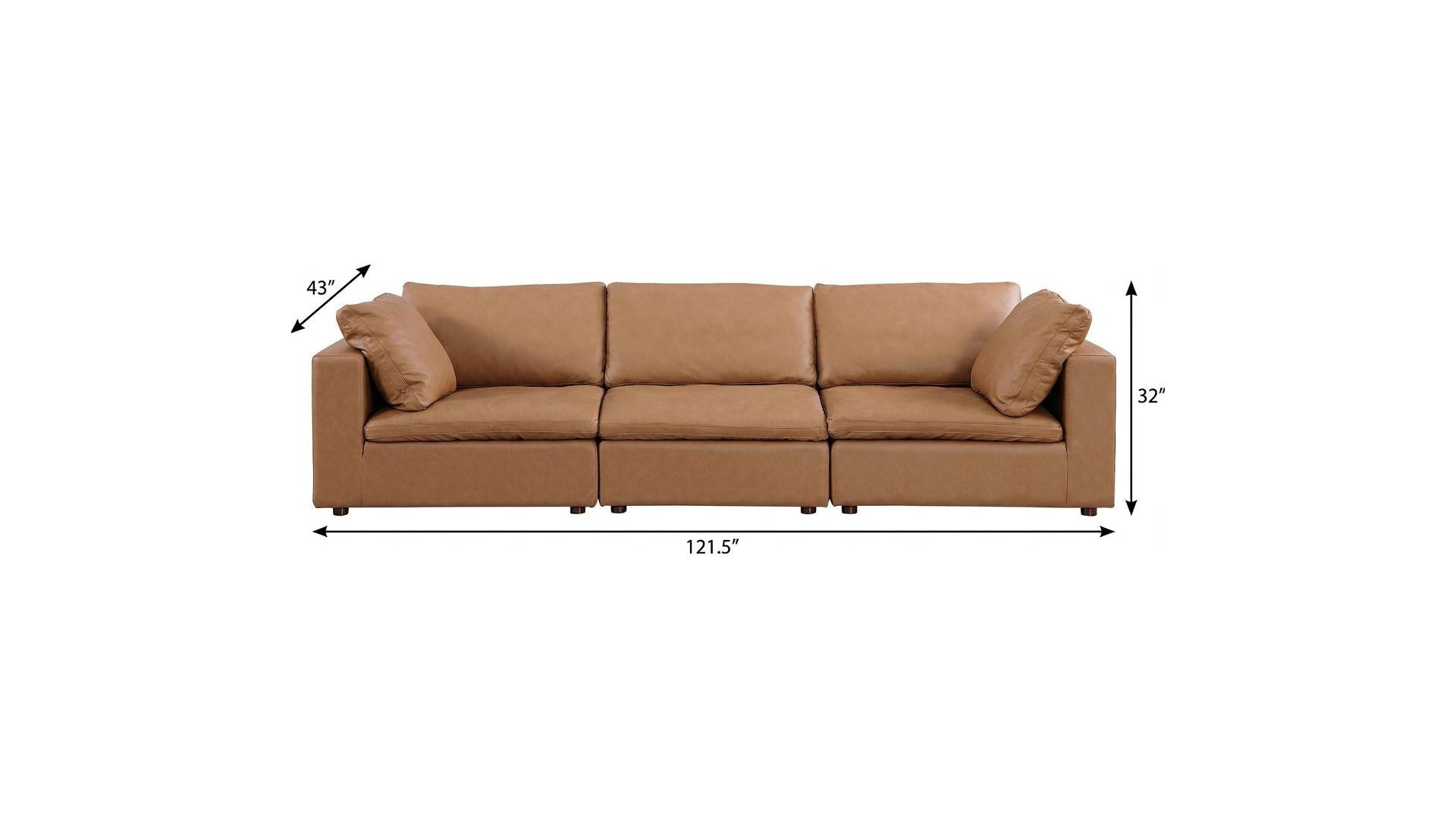 Made of the highest quality, supple leather, this 122-inch chestnut top grain leather reclining solid wood sofa will be the star of your space. The high grade premium leather used makes your lounging luxuriously comfortable and adds an elegant appeal to your space. Solid colors give you lots of decorative options and are easy to work into your decor scheme. Pocket spring construction gives this piece strong support and makes it comfortable to sit even for long periods of time. Square arms offer a comfy place to rest. Brown solid wood legs effortlessly elevate the room and add a touch of contemporary design. A great showpiece for your room, this sofa is a must have. 32.00-inch h x 121.50-inch w x 43.00-inch d.