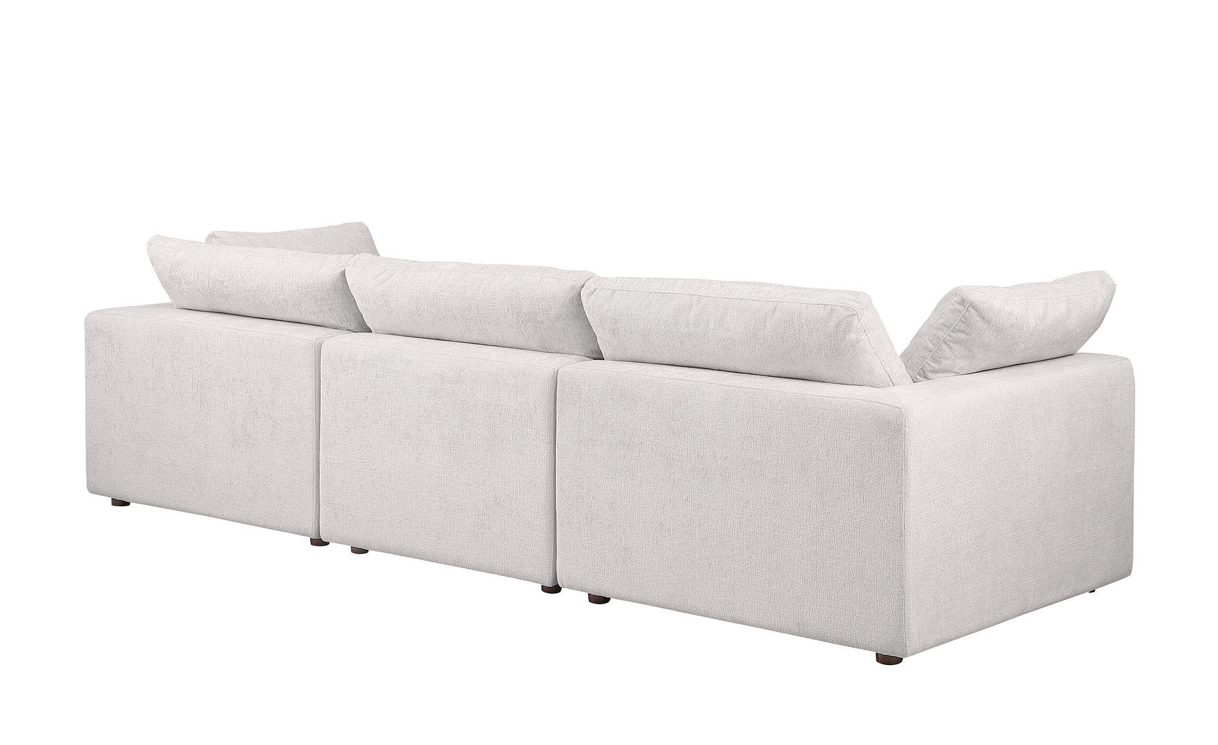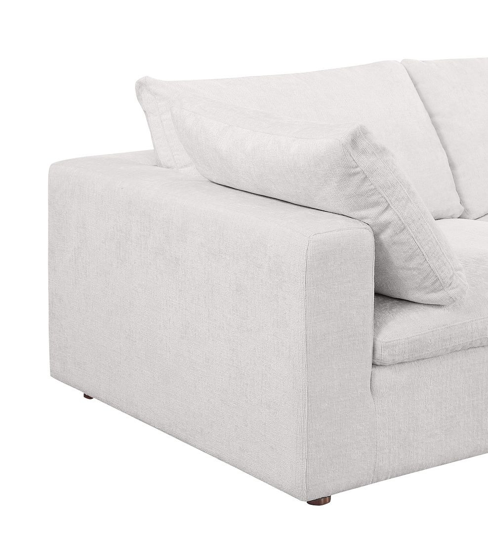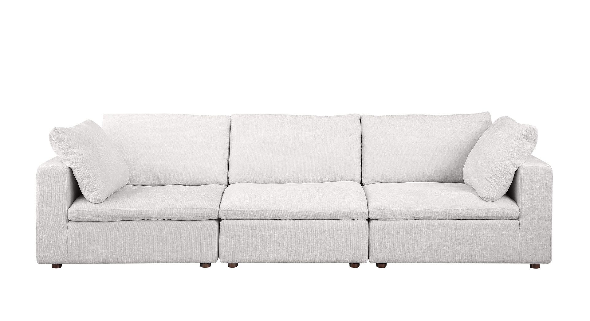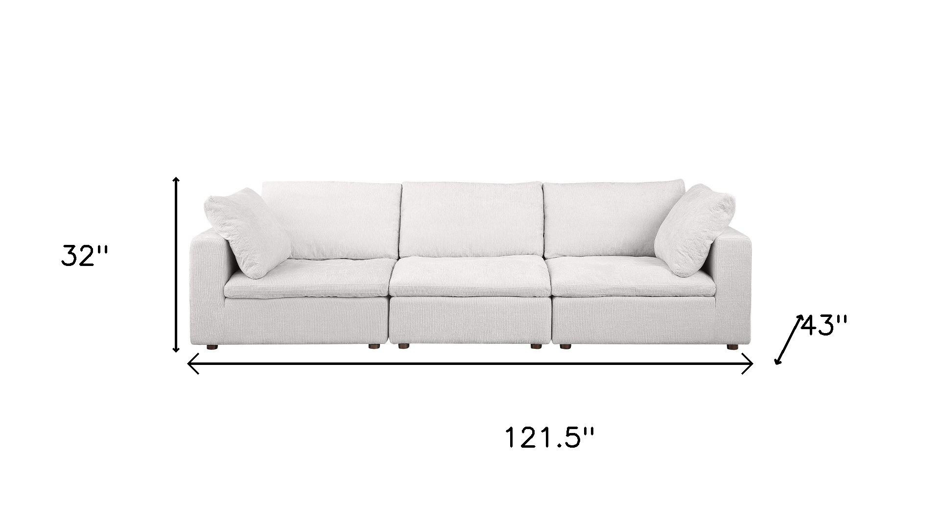 Designed for comfort and good looks, this 122-inch pearl fabric reclining sofa is a great option to anchor your space. Solid colors give you lots of decorative options and are easy to work into your decor scheme. Pocket spring construction gives this piece strong support and makes it comfortable to sit even for long periods of time. Square arms offer a comfy place to rest. Brown solid wood legs effortlessly elevate the room and add a touch of contemporary design. A great showpiece for your room, this sofa is a must have. 32.00-inch h x 121.50-inch w x 43.00-inch d.