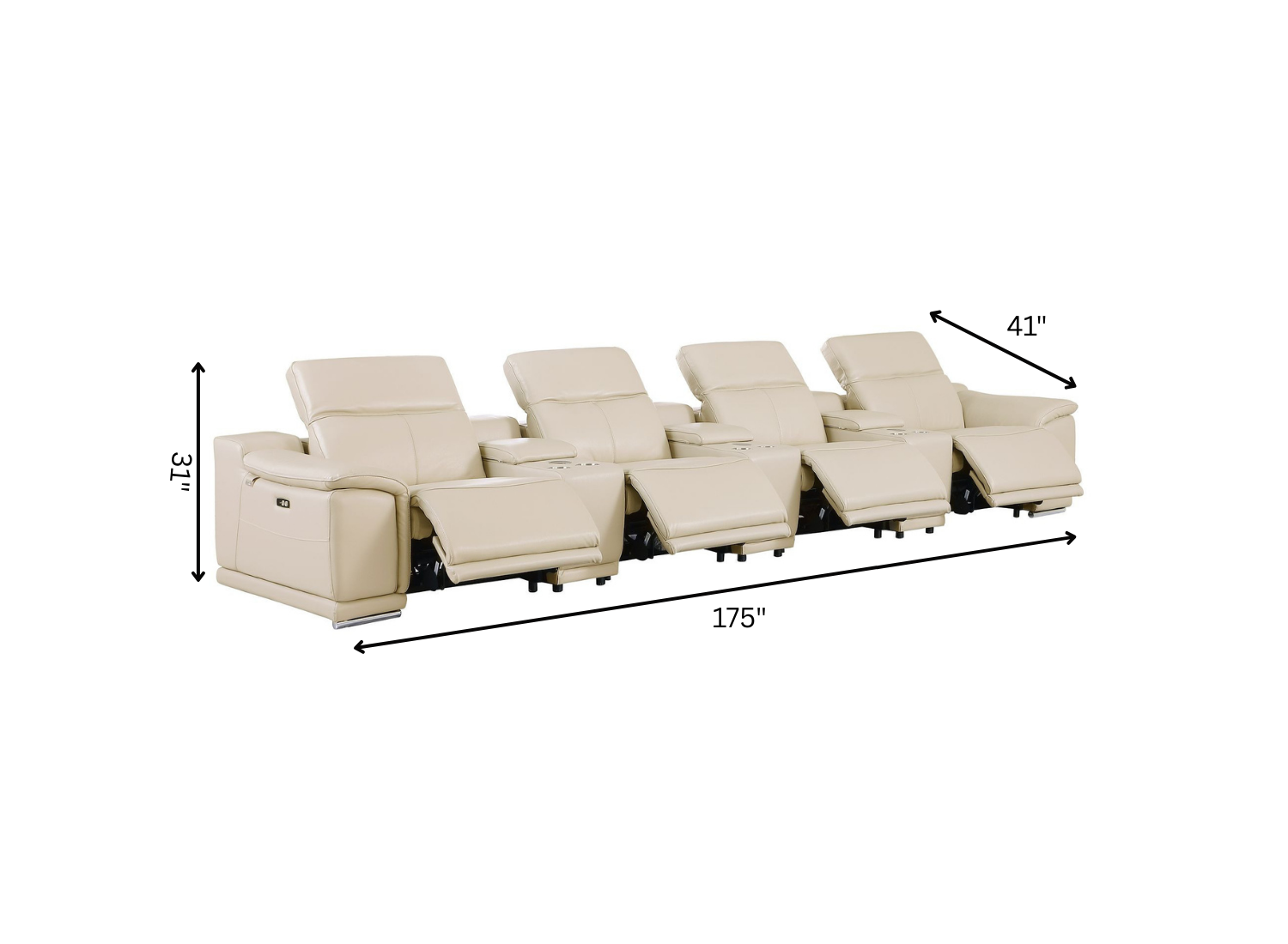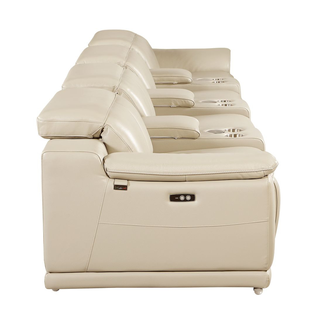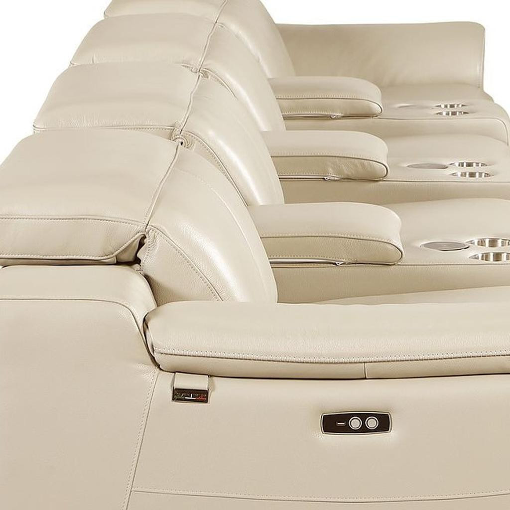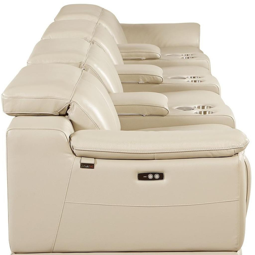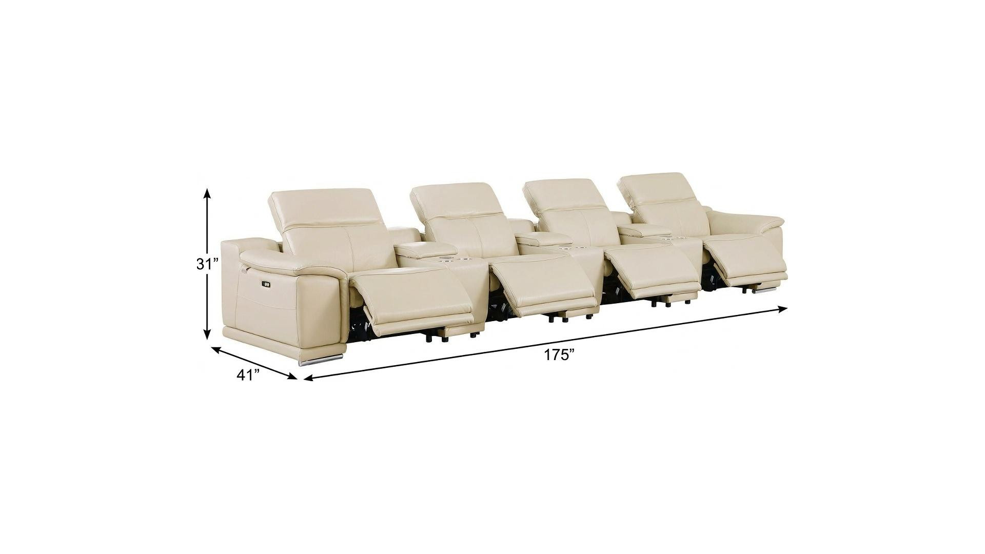 An interior designer's dream, this buttery soft high grade leather 175-inch beige italian leather reclining metal usb sofa will bring just the right touch to your space. The premium leather used makes your lounging luxuriously comfortable and adds an elegant appeal to your space. Solid colors give you lots of decorative options and are easy to work into your decor scheme. Pocket spring construction gives this piece strong support and makes it comfortable to sit even for long periods of time. Rolled arms offer a comfy place to rest. Silver stainless steel legs effortlessly elevate the room and add a touch of contemporary design. A great showpiece for your room, this sofa is a must have. 31.00-inch h x 175.00-inch w x 41.00-inch d.