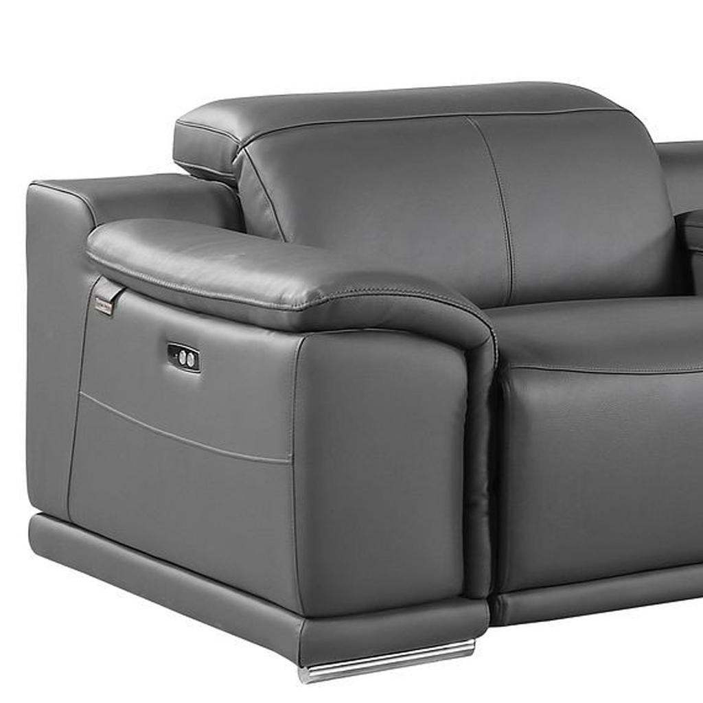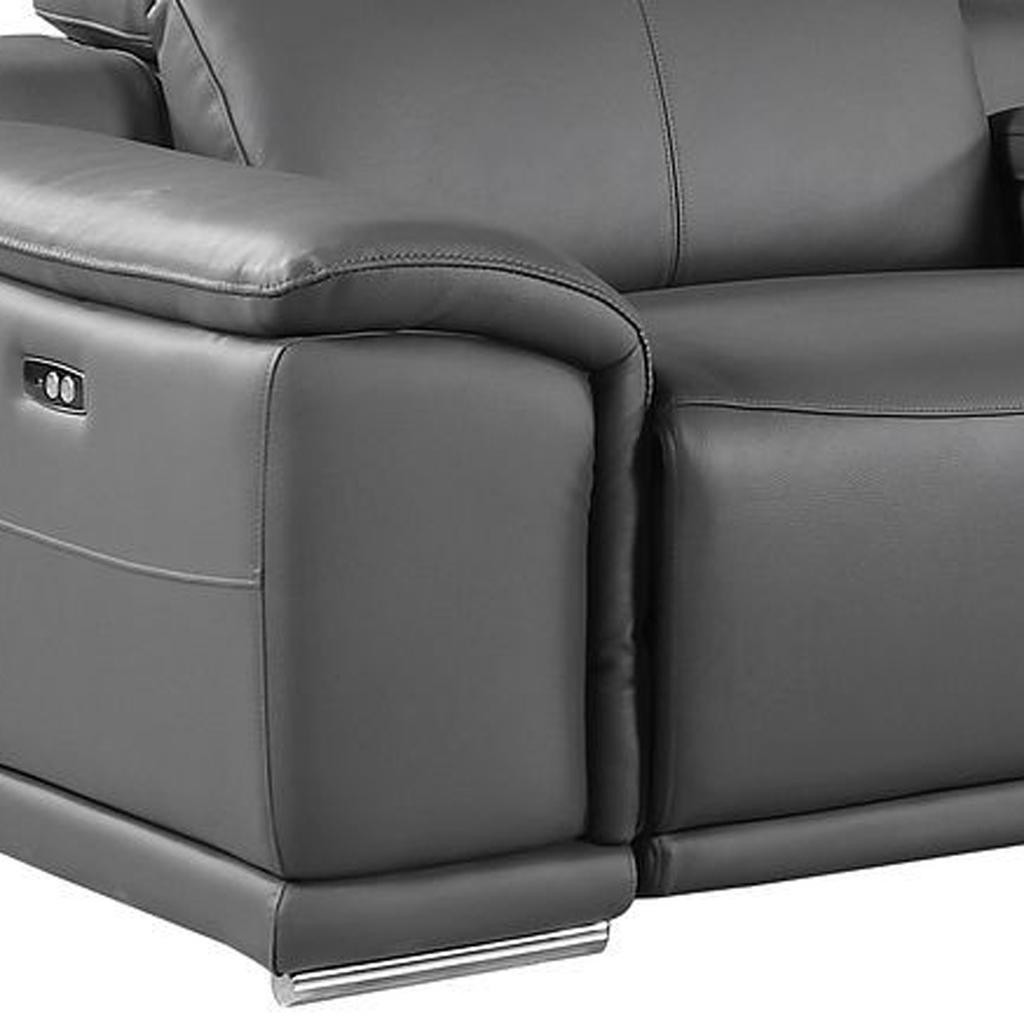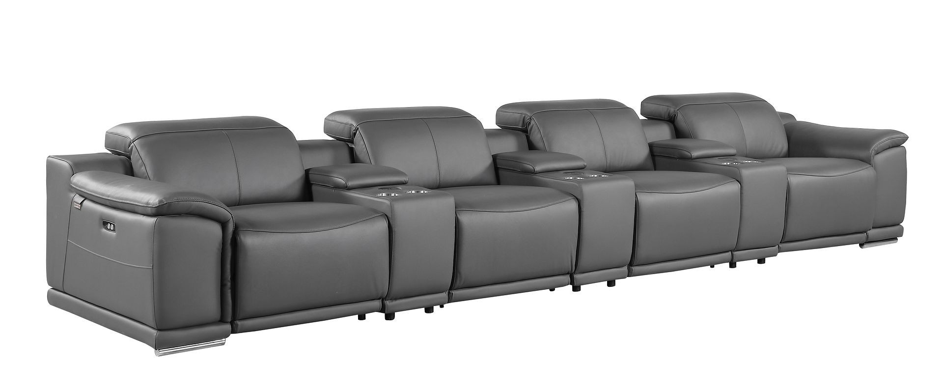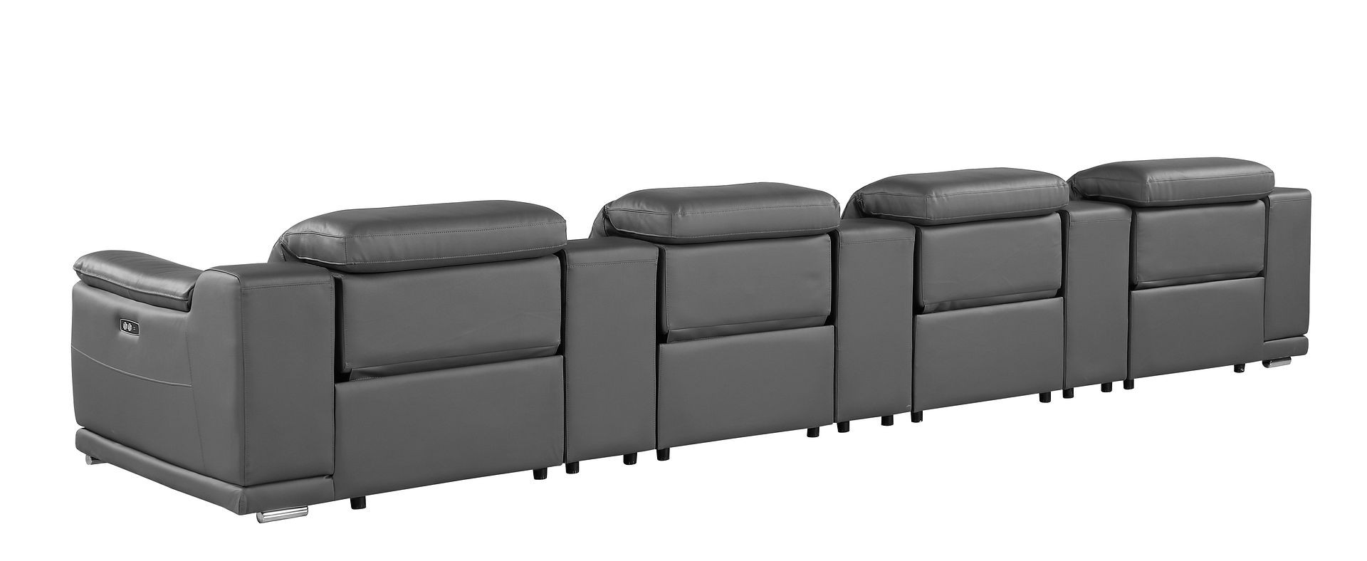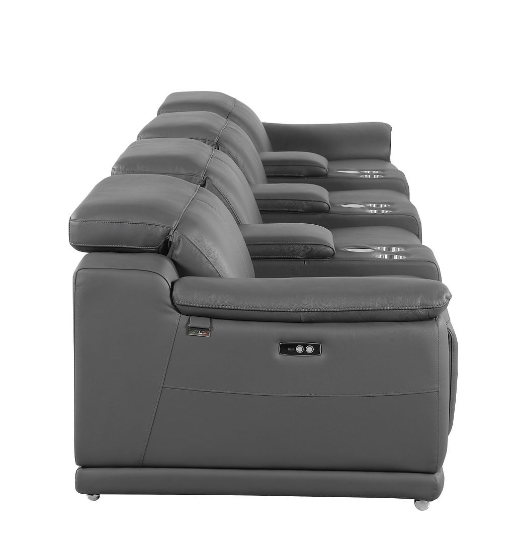 Made of the highest quality, supple leather, this 175-inch dark gray italian leather reclining metal usb sofa will be the star of your space. The high grade premium leather used makes your lounging luxuriously comfortable and adds an elegant appeal to your space. Solid colors give you lots of decorative options and are easy to work into your decor scheme. Pocket spring construction gives this piece strong support and makes it comfortable to sit even for long periods of time. Rolled arms offer a comfy place to rest. Silver stainless steel legs effortlessly elevate the room and add a touch of contemporary design. Built to last, this sofa will be a great centerpiece for your room. 31.00-inch h x 175.00-inch w x 41.00-inch d.