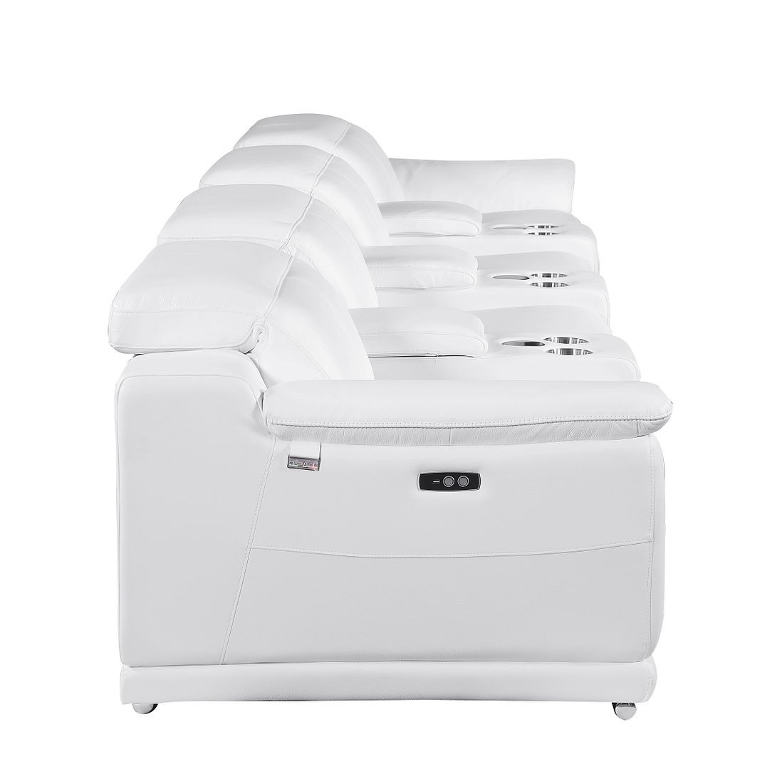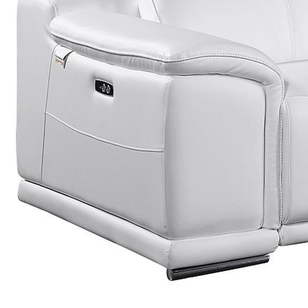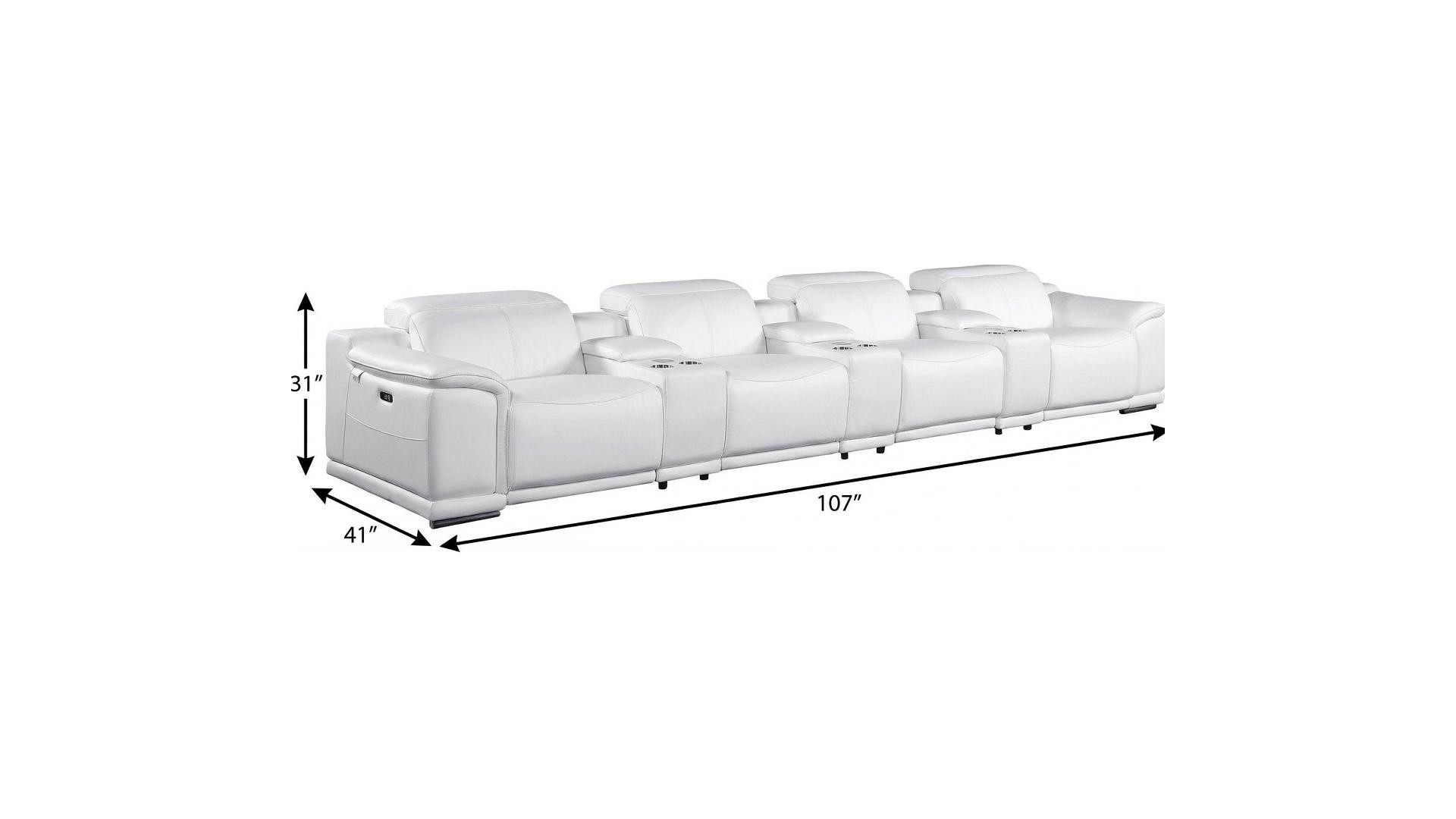An interior designer's dream, this buttery soft high grade leather 175-inch white italian leather reclining metal usb sofa will bring just the right touch to your space. The premium leather used makes your lounging luxuriously comfortable and adds an elegant appeal to your space. Solid colors give you lots of decorative options and are easy to work into your decor scheme. Pocket spring construction gives this piece strong support and makes it comfortable to sit even for long periods of time. Rolled arms offer a comfy place to rest. Silver stainless steel legs effortlessly elevate the room and add a touch of contemporary design. A great showpiece for your room, this sofa is a must have. 31.00-inch h x 107.00-inch w x 41.00-inch d.