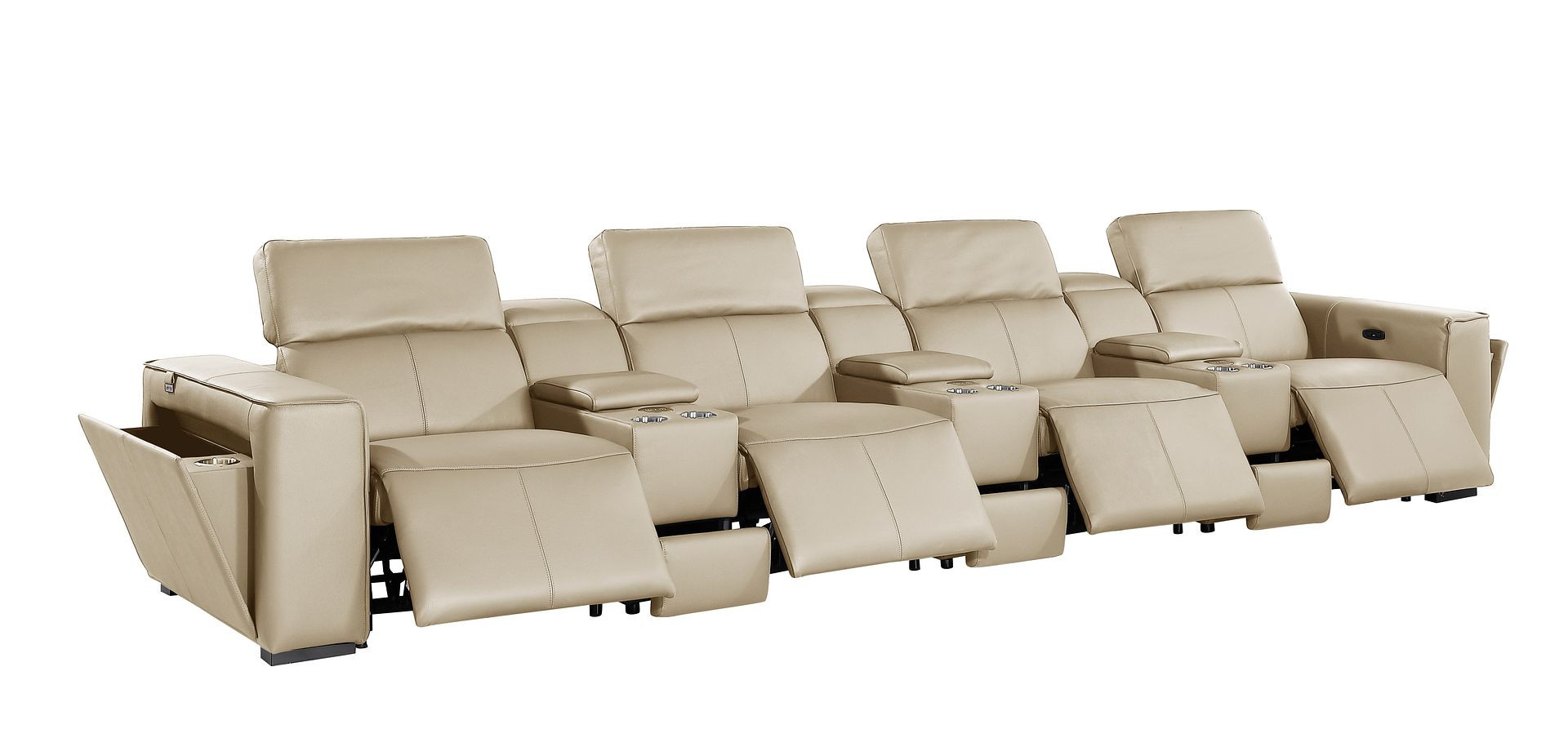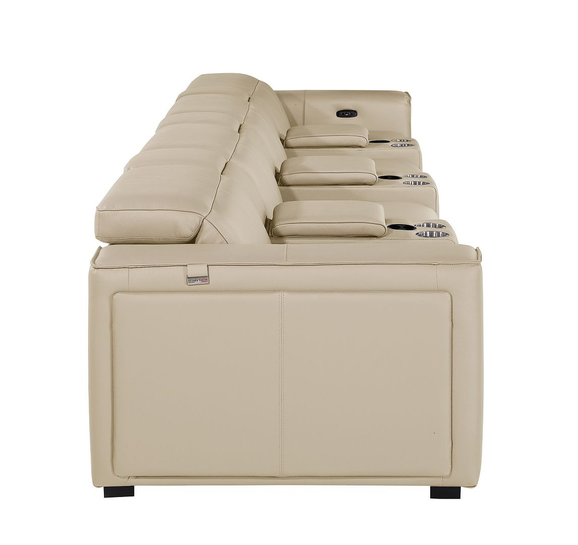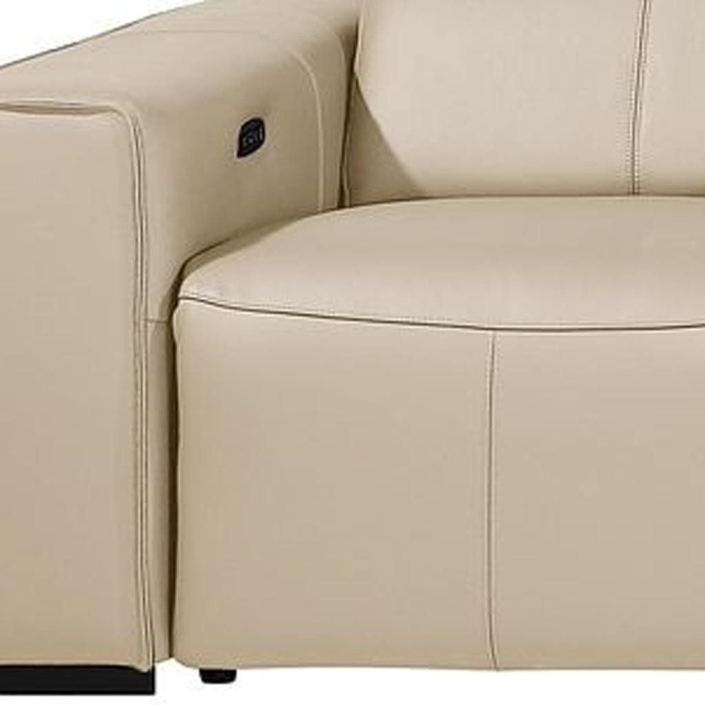 An interior designer's dream, this buttery soft high grade leather 170-inch beige top grain leather reclining metal usb sofa will bring just the right touch to your space. The premium leather used makes your lounging luxuriously comfortable and adds an elegant appeal to your space. Solid colors give you lots of decorative options and are easy to work into your decor scheme. Pocket spring construction gives this piece strong support and makes it comfortable to sit even for long periods of time. Square arms offer a comfy place to rest. Brown stainless steel legs effortlessly elevate the room and add a touch of contemporary design. A great showpiece for your room, this sofa is a must have. 31.00-inch h x 170.00-inch w x 43.00-inch d.