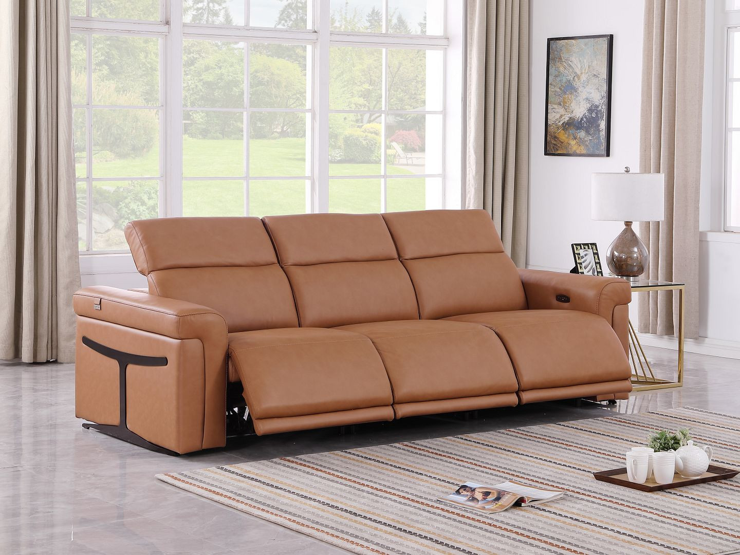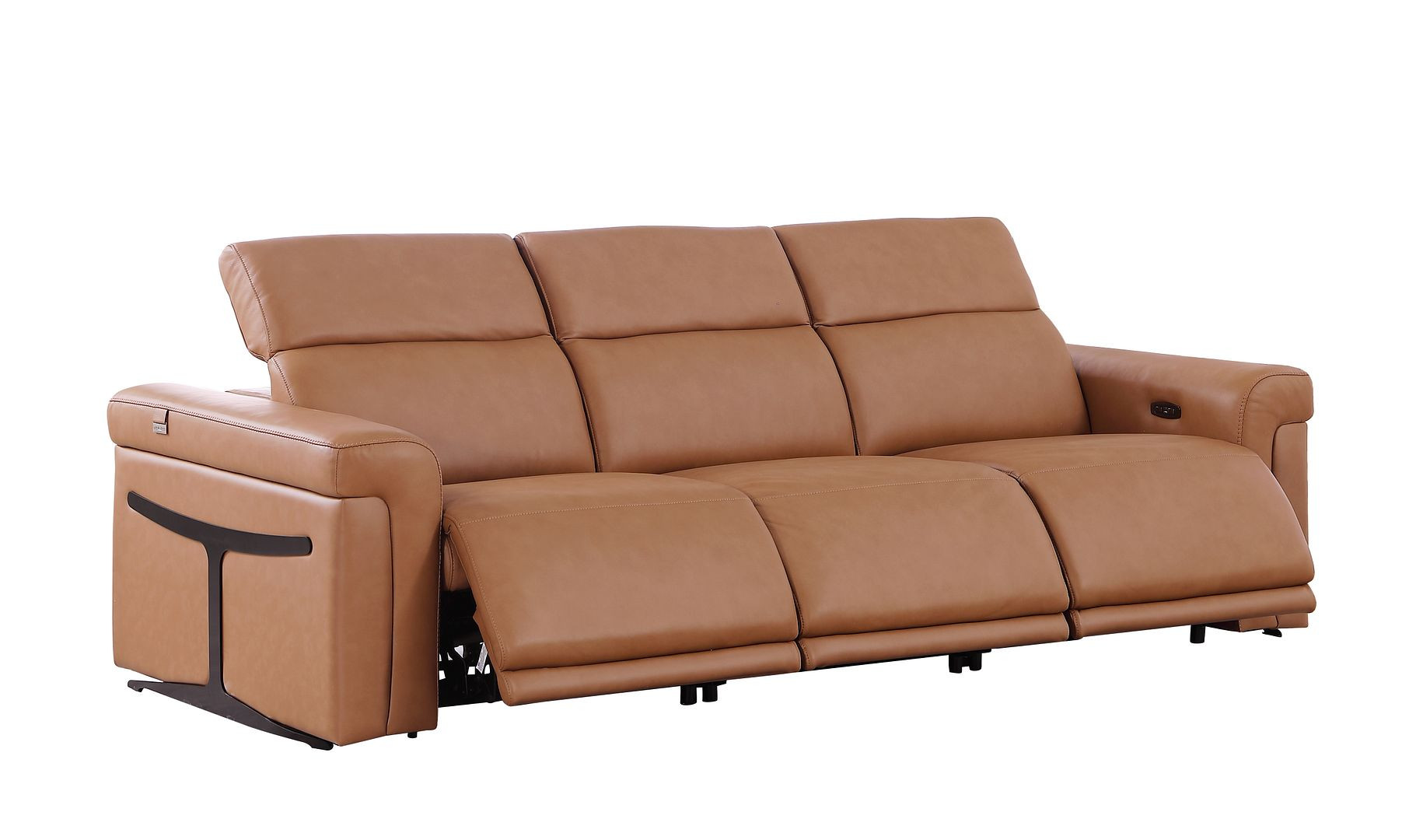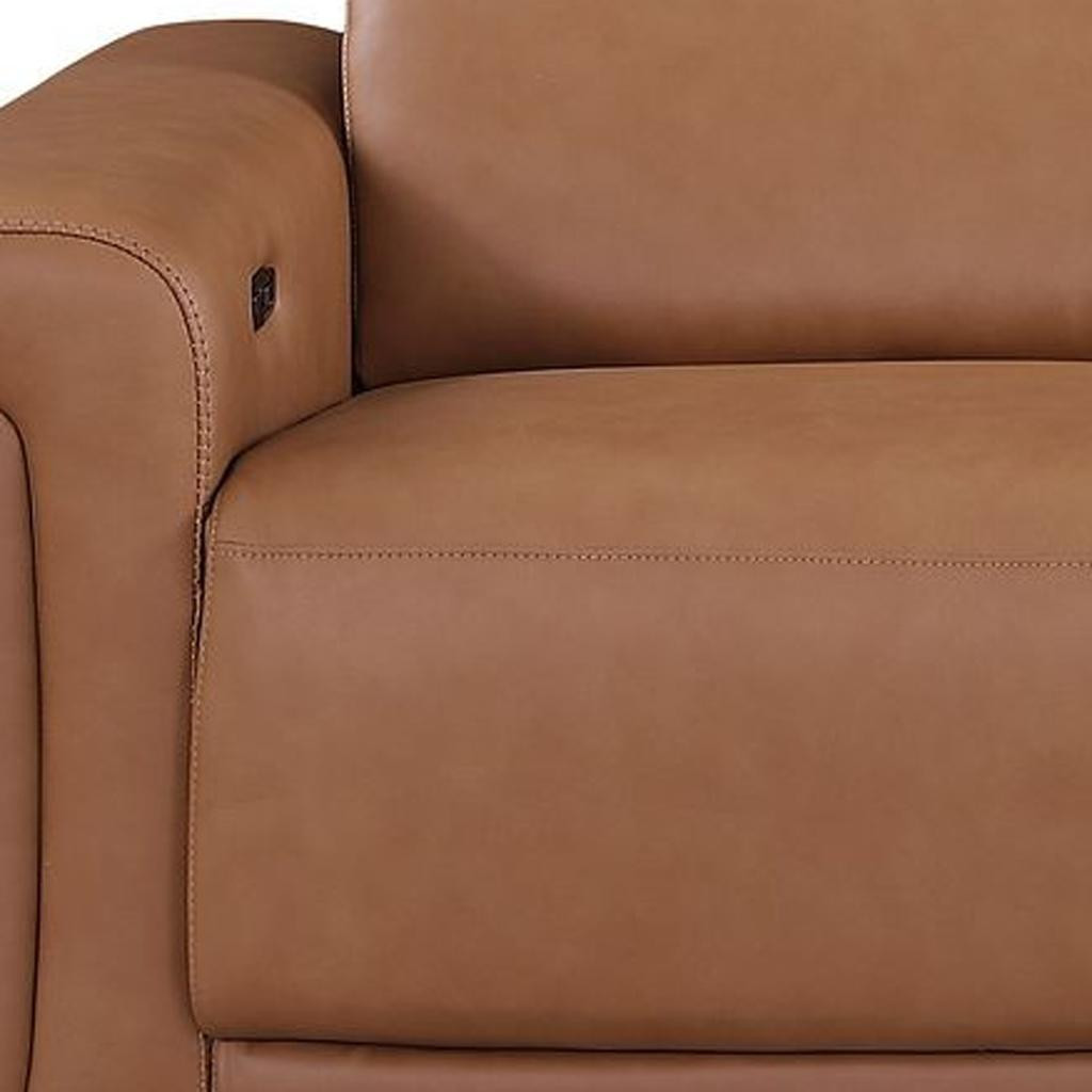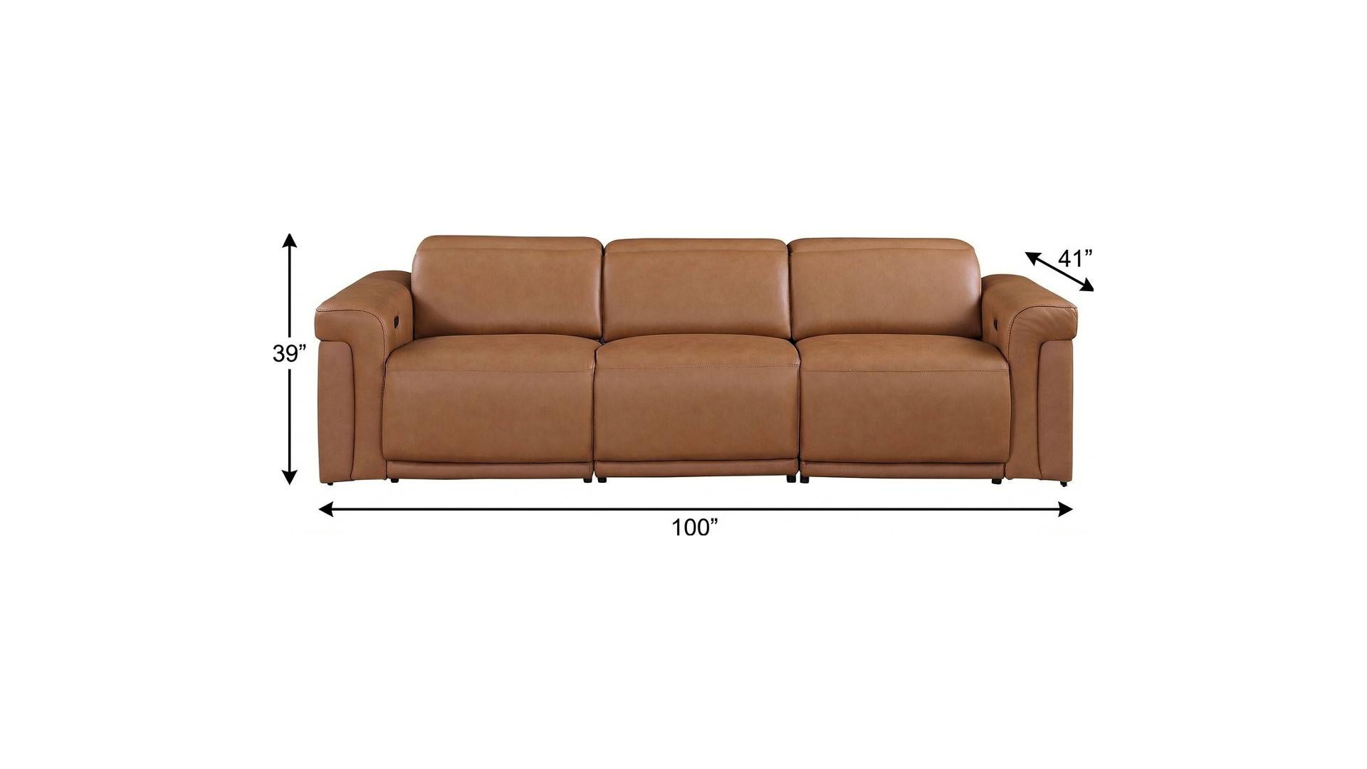 Made of the highest quality, supple leather, this 100-inch chestnut top grain leather reclining metal usb sofa will be the star of your space. The high grade premium leather used makes your lounging luxuriously comfortable and adds an elegant appeal to your space. Solid colors give you lots of decorative options and are easy to work into your decor scheme. Pocket spring construction gives this piece strong support and makes it comfortable to sit even for long periods of time. Rolled arms offer a comfy place to rest. Black stainless steel legs effortlessly elevate the room and add a touch of contemporary design. A great showpiece for your room, this sofa is a must have. 39.00-inch h x 100.00-inch w x 41.00-inch d.