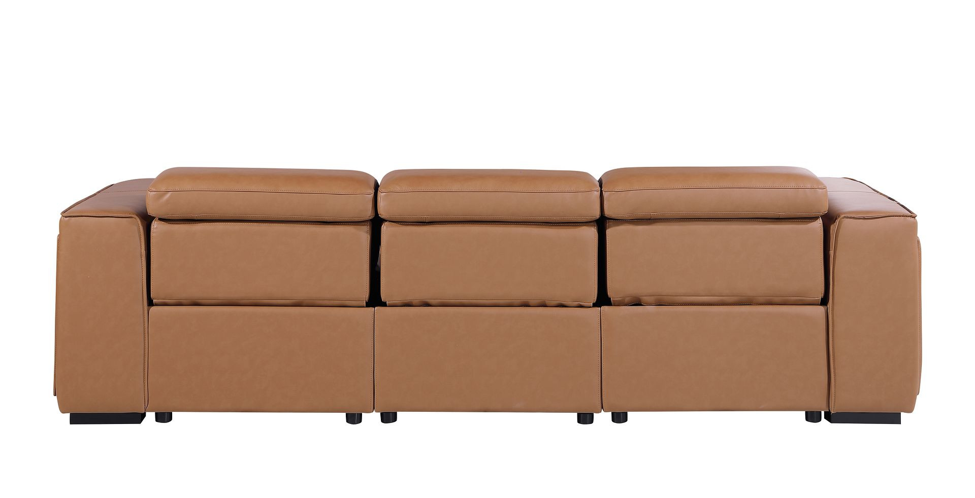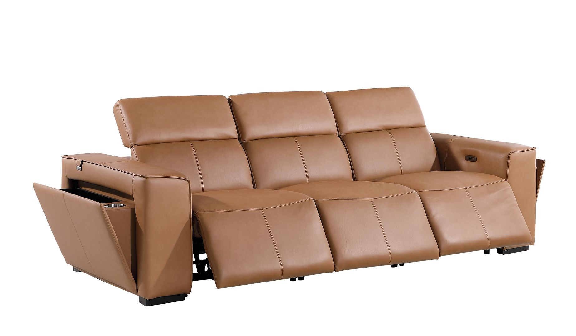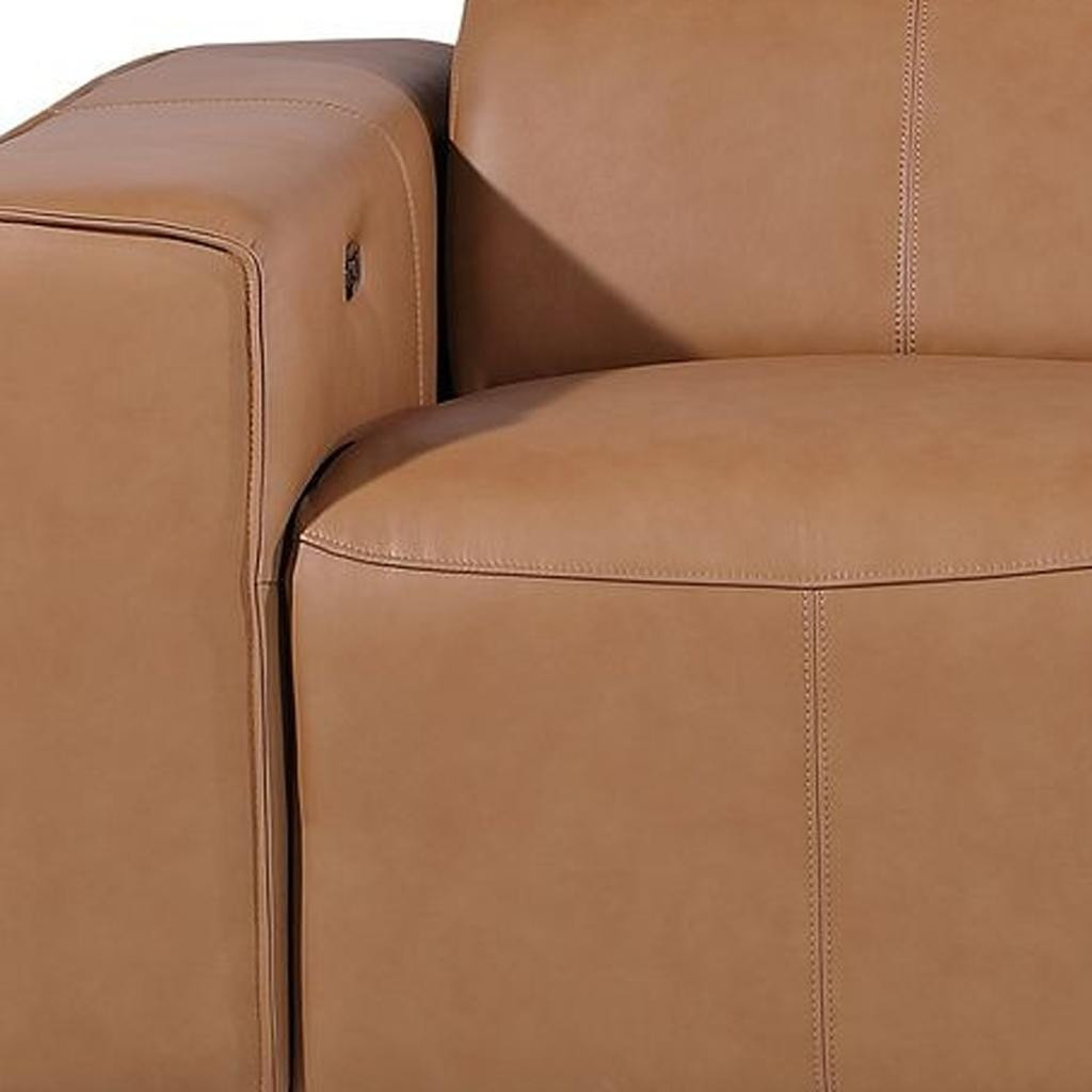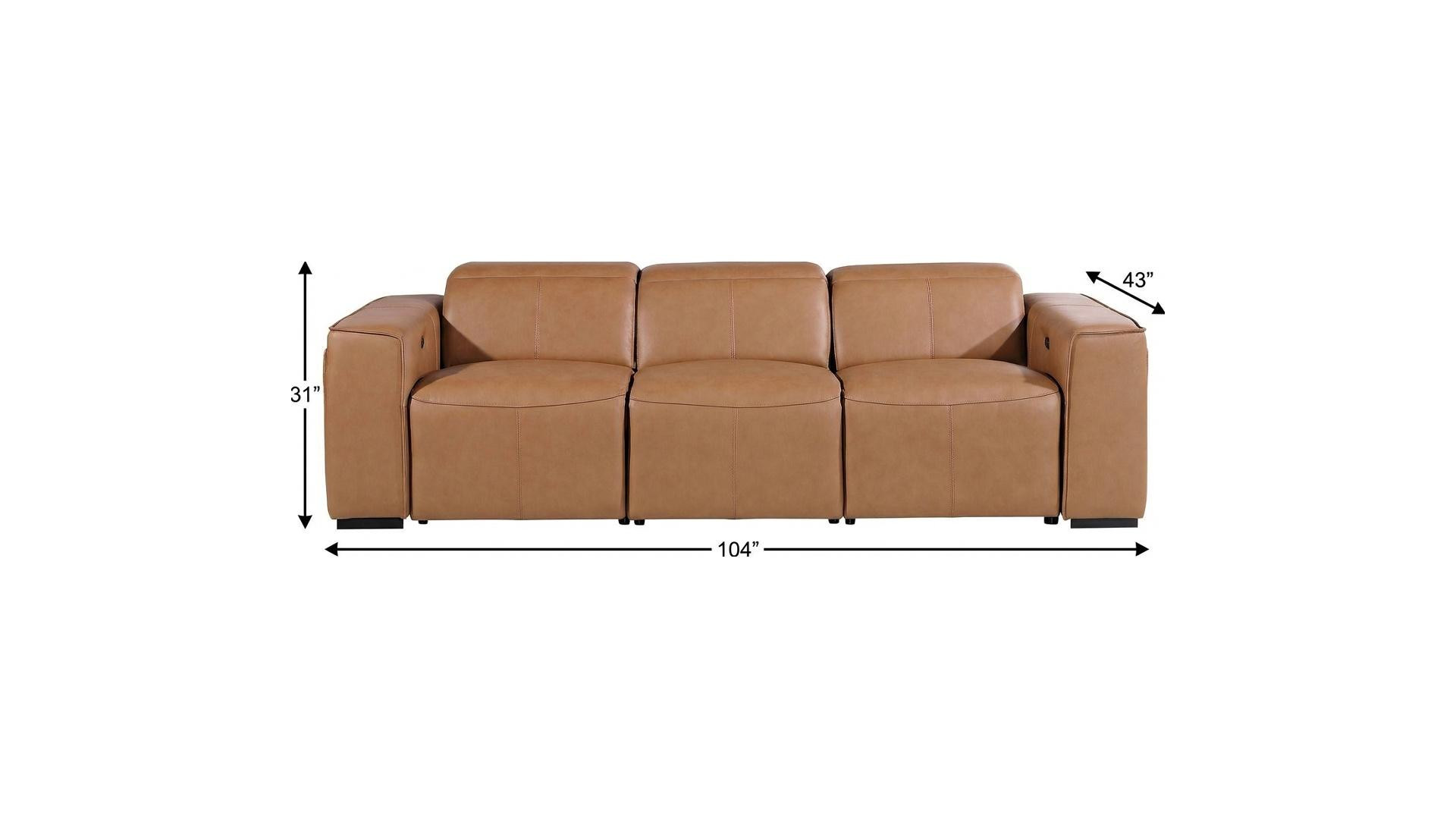 Superior construction from fabulously soft and high grade leather gives this 104-inch chestnut top grain leather reclining metal usb sofa a leg up on the competition. The premium leather used makes your lounging luxuriously comfortable and adds an elegant appeal to your space. Solid colors give you lots of decorative options and are easy to work into your decor scheme. Pocket spring construction gives this piece strong support and makes it comfortable to sit even for long periods of time. Square arms offer a comfy place to rest. Brown stainless steel legs effortlessly elevate the room and add a touch of contemporary design. Built to last, this sofa will be a great centerpiece for your room. 31.00-inch h x 104.00-inch w x 43.00-inch d.