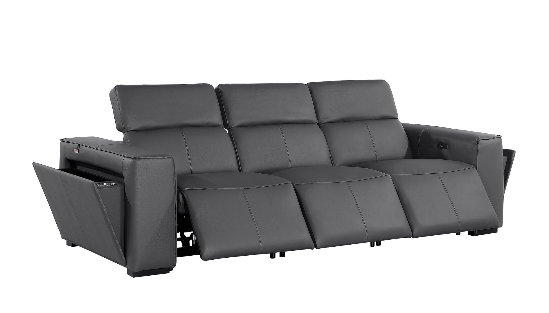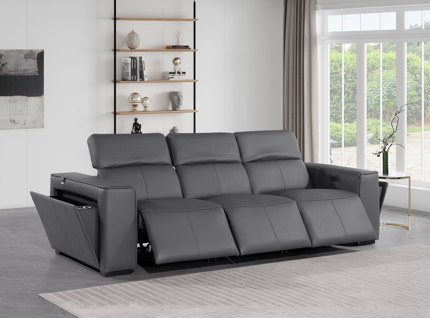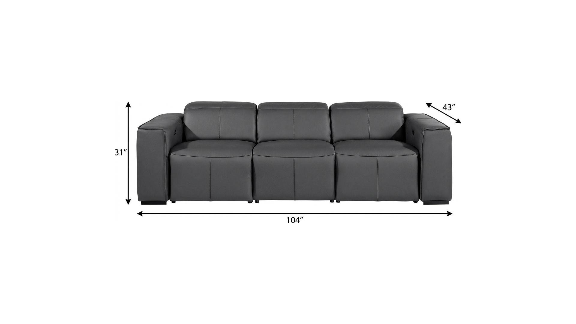 Superior construction from fabulously soft and high grade leather gives this 104-inch dark gray top grain leather reclining metal usb sofa a leg up on the competition. The premium leather used makes your lounging luxuriously comfortable and adds an elegant appeal to your space. Solid colors give you lots of decorative options and are easy to work into your decor scheme. Pocket spring construction gives this piece strong support and makes it comfortable to sit even for long periods of time. Square arms offer a comfy place to rest. Brown stainless steel legs effortlessly elevate the room and add a touch of contemporary design. Built to last, this sofa will be a great centerpiece for your room. 31.00-inch h x 104.00-inch w x 43.00-inch d.