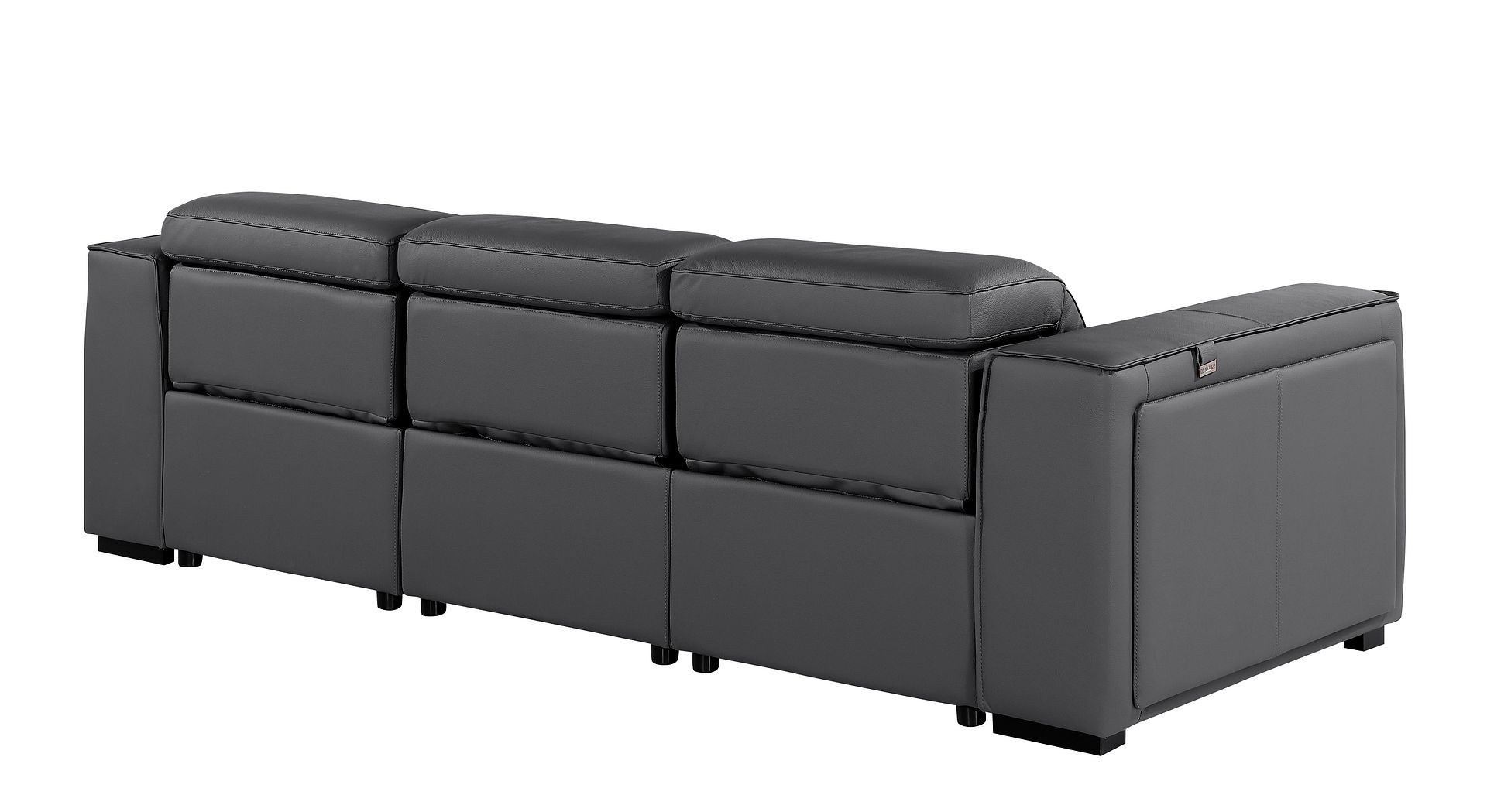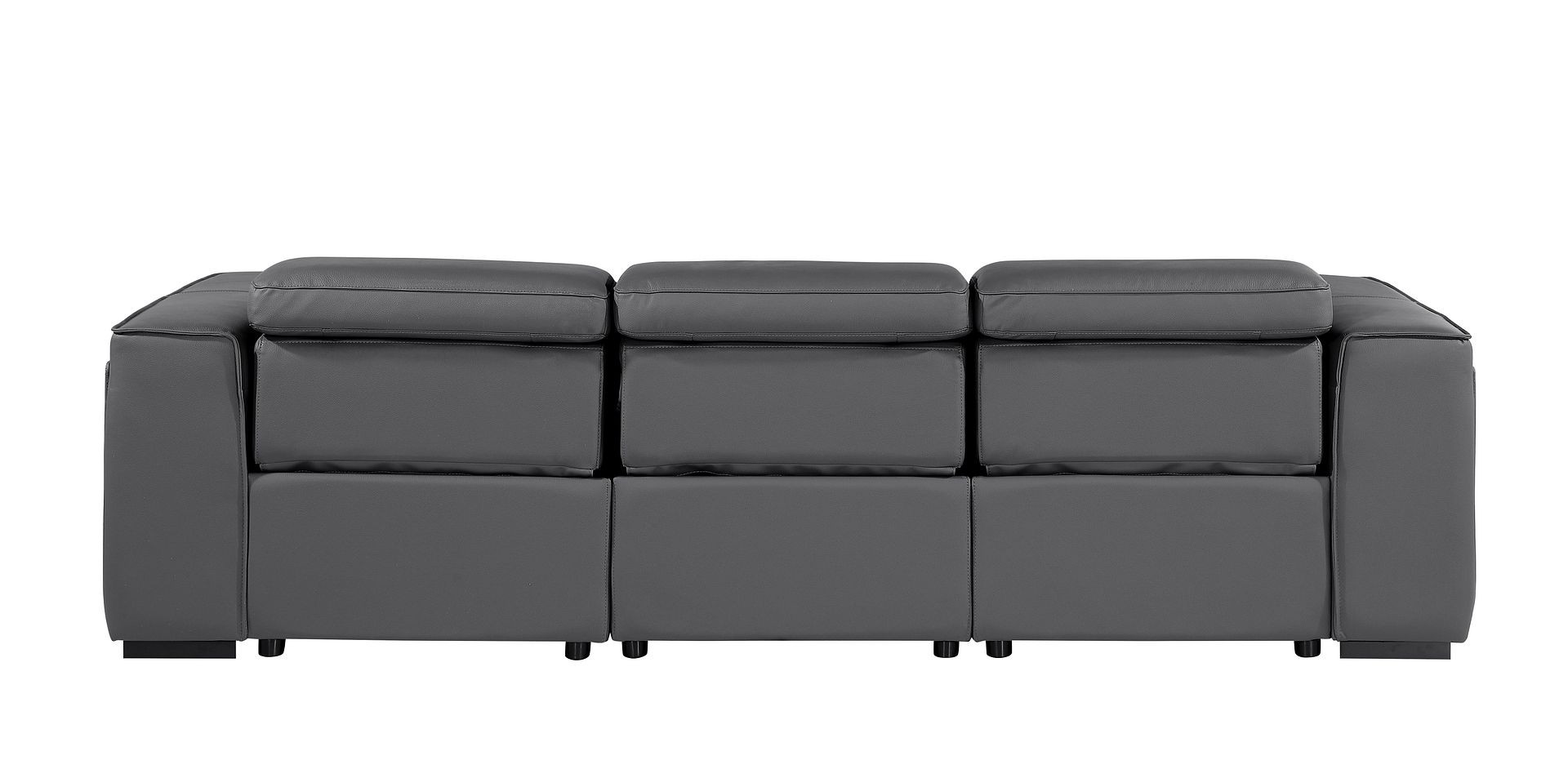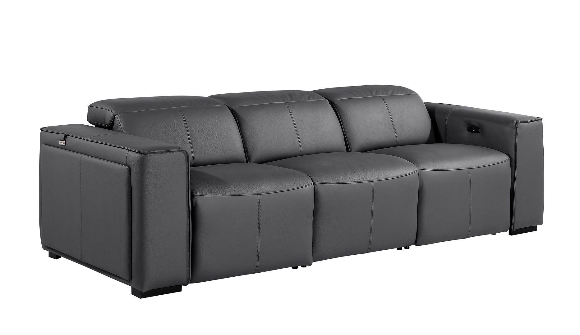Superior construction from fabulously soft and high grade leather gives this 104-inch dark gray top grain leather reclining metal usb sofa a leg up on the competition. The premium leather used makes your lounging luxuriously comfortable and adds an elegant appeal to your space. Solid colors give you lots of decorative options and are easy to work into your decor scheme. Pocket spring construction gives this piece strong support and makes it comfortable to sit even for long periods of time. Square arms offer a comfy place to rest. Brown stainless steel legs effortlessly elevate the room and add a touch of contemporary design. Built to last, this sofa will be a great centerpiece for your room. 31.00-inch h x 104.00-inch w x 43.00-inch d.