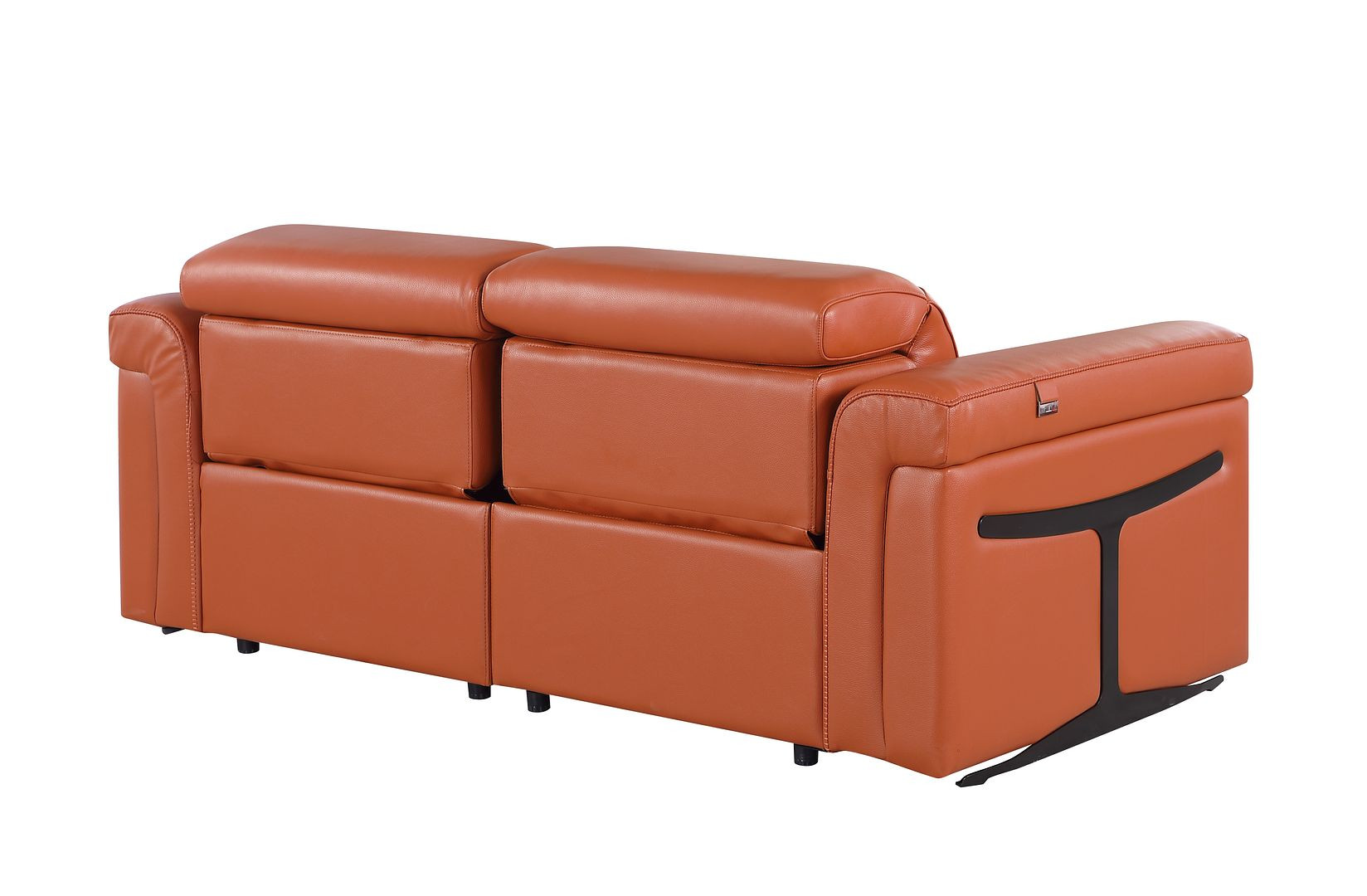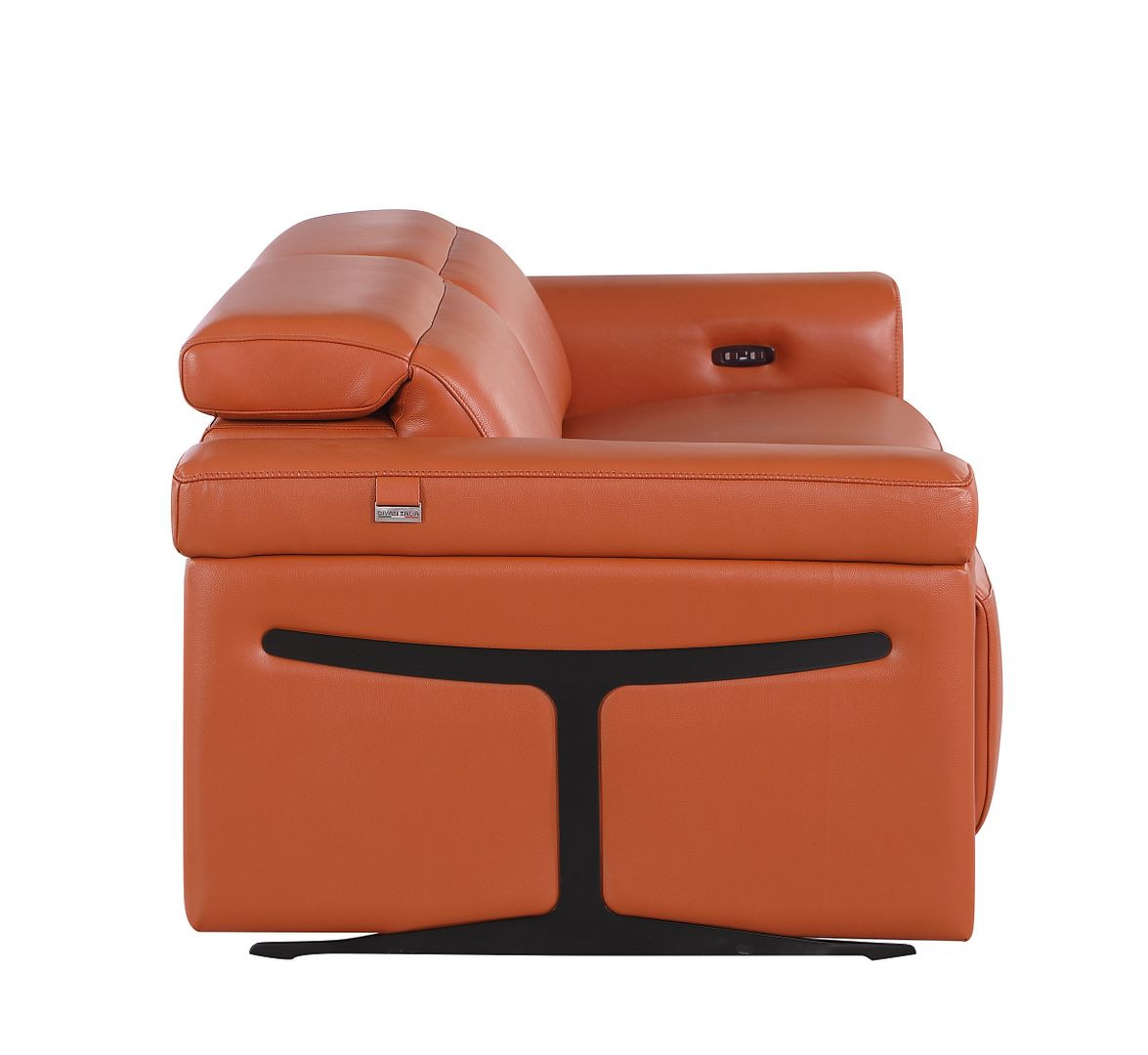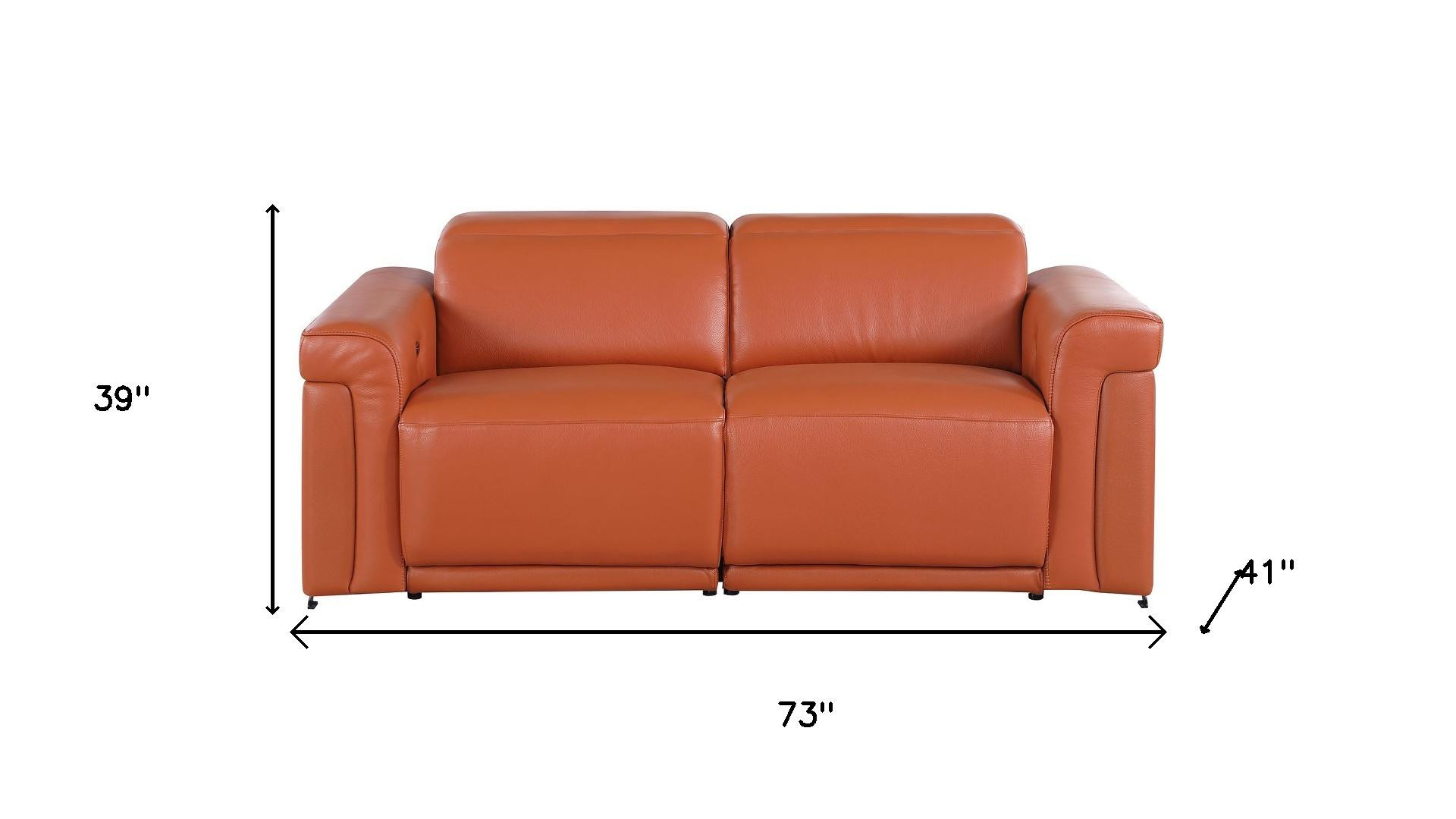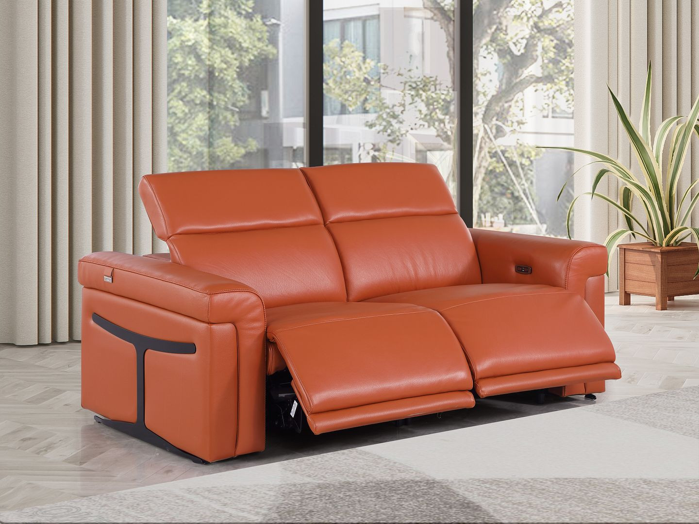An interior designer's dream, this buttery soft high grade leather 73-inch orange and black italian leather power reclining loveseat will bring just the right touch to your space. The high grade premium leather used makes your lounging luxuriously comfortable and adds an elegant appeal to your space. Rolled arms offer a comfy place to rest and give this piece some interest and shape. Black metal legs effortlessly elevate the room and add a touch of contemporary design. A great showpiece for your room, this sofa is a must have. 39.00-inch h x 73.00-inch w x 41.00-inch d.