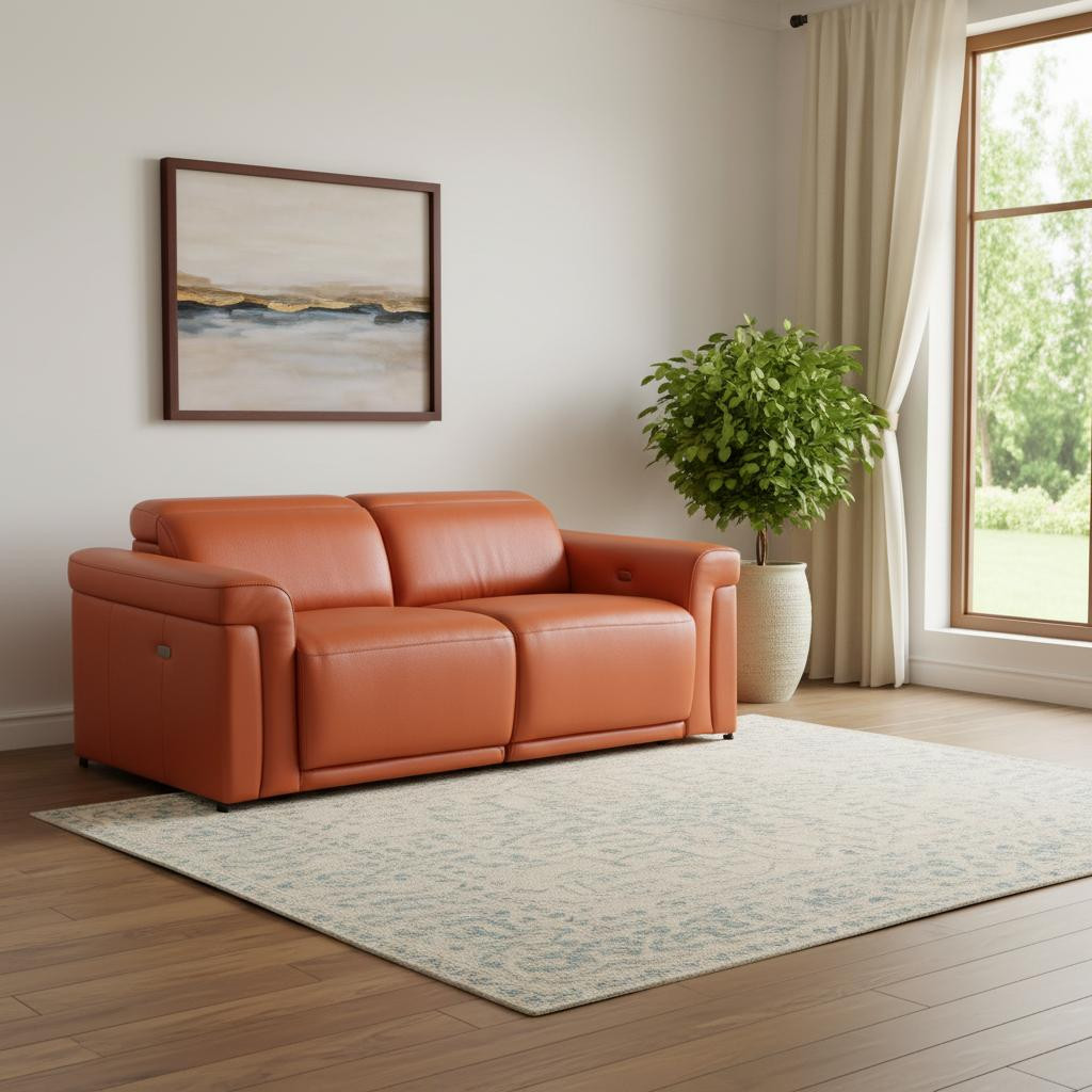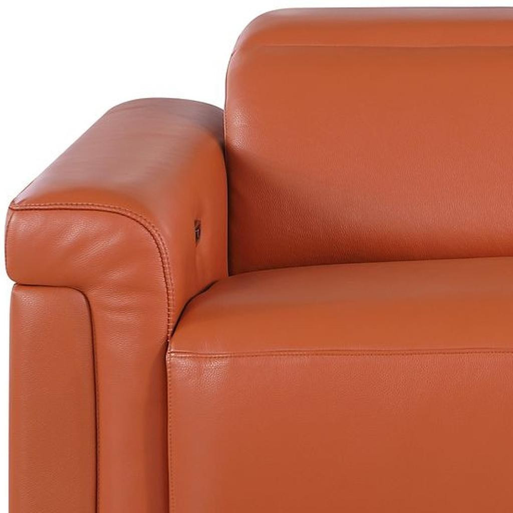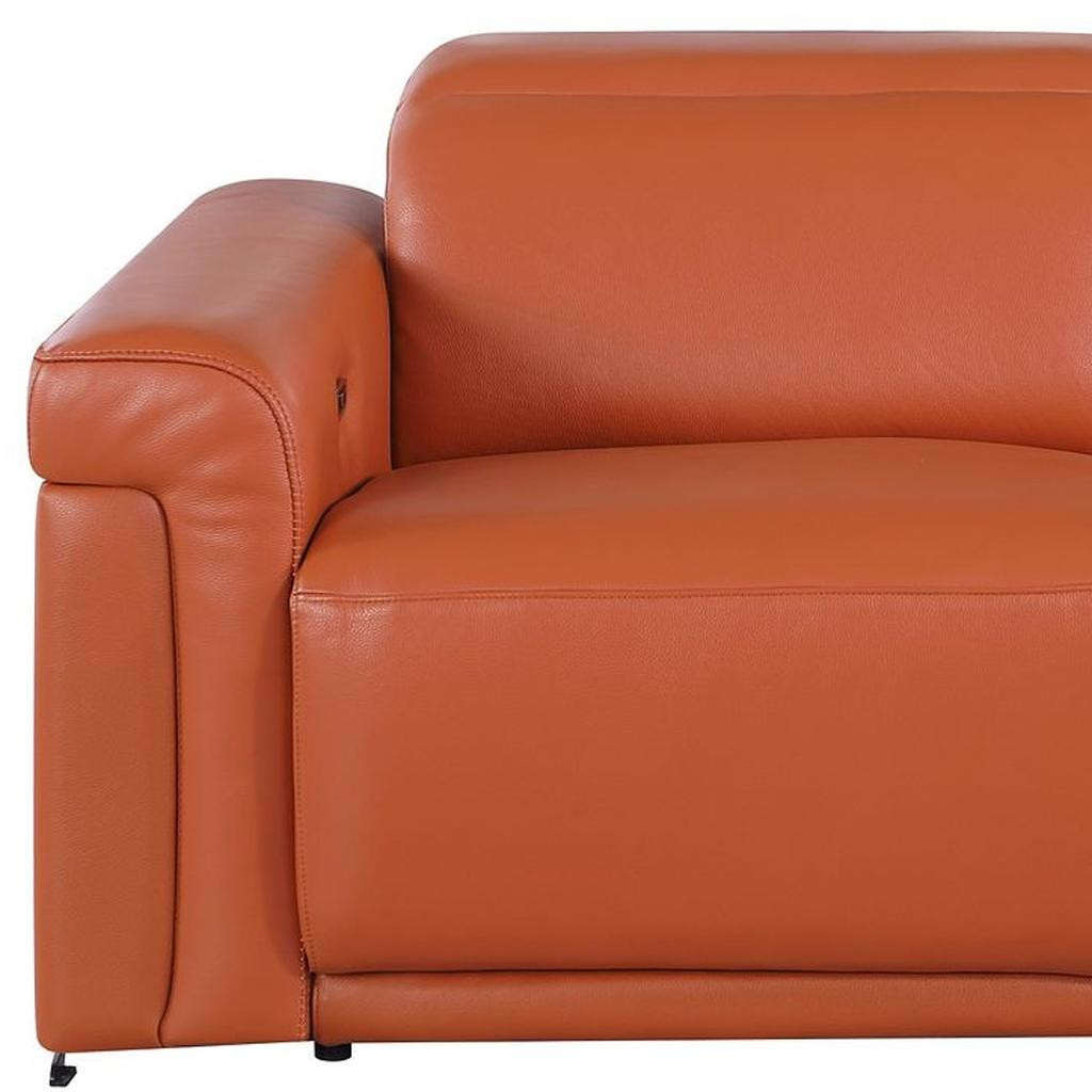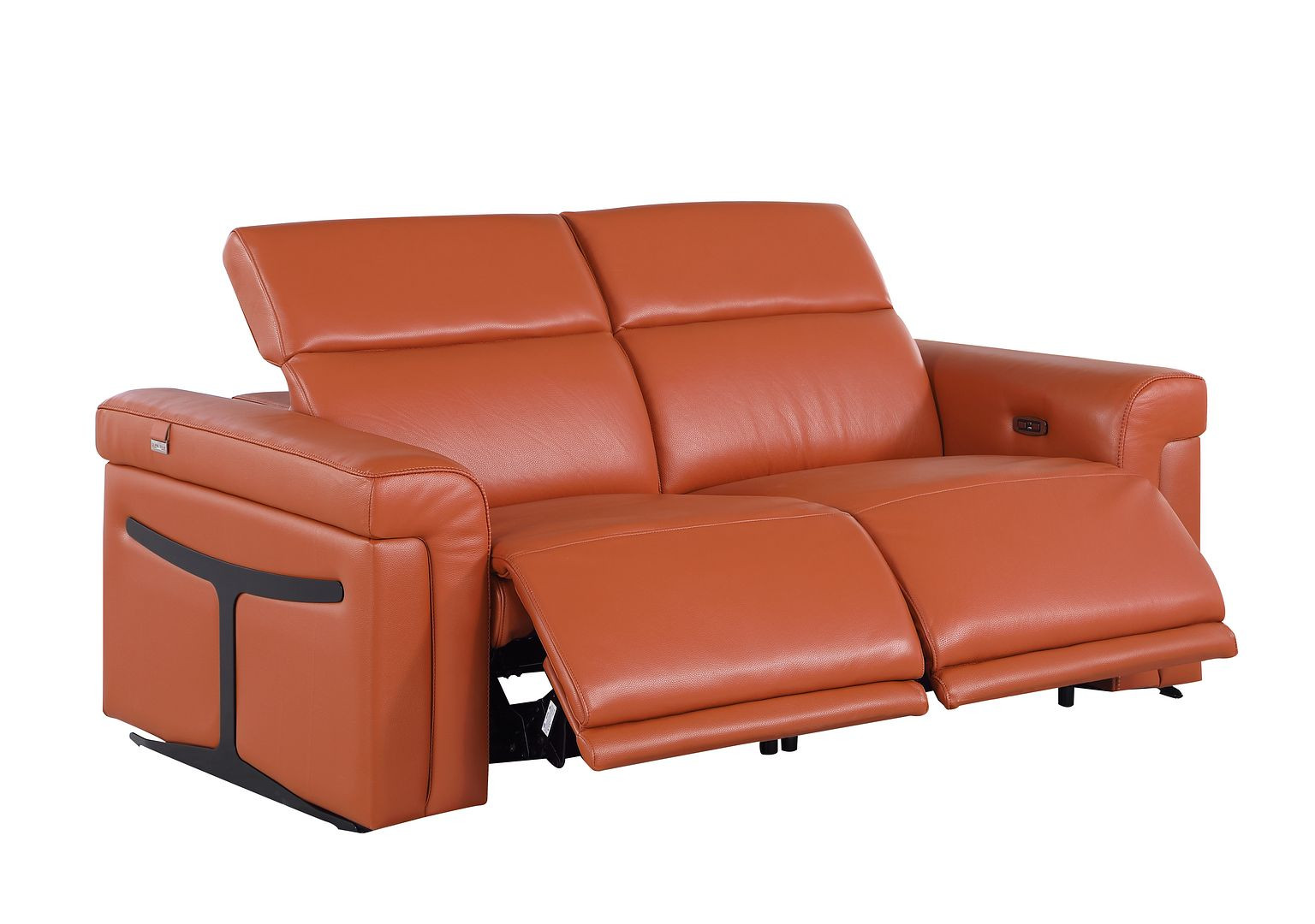 An interior designer's dream, this buttery soft high grade leather 73-inch orange and black italian leather power reclining loveseat will bring just the right touch to your space. The high grade premium leather used makes your lounging luxuriously comfortable and adds an elegant appeal to your space. Rolled arms offer a comfy place to rest and give this piece some interest and shape. Black metal legs effortlessly elevate the room and add a touch of contemporary design. A great showpiece for your room, this sofa is a must have. 39.00-inch h x 73.00-inch w x 41.00-inch d.