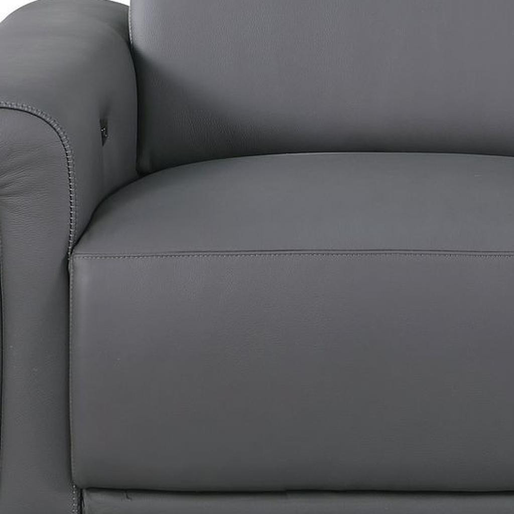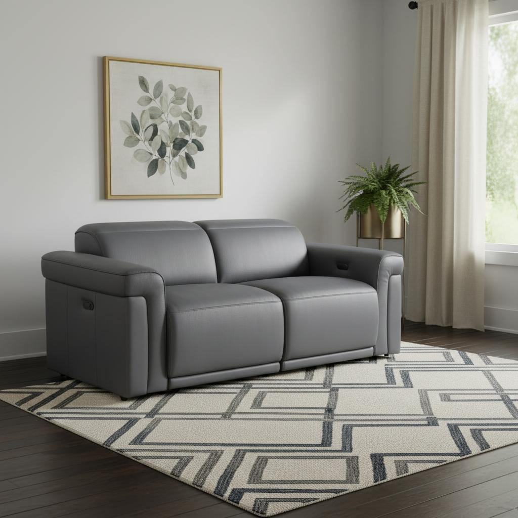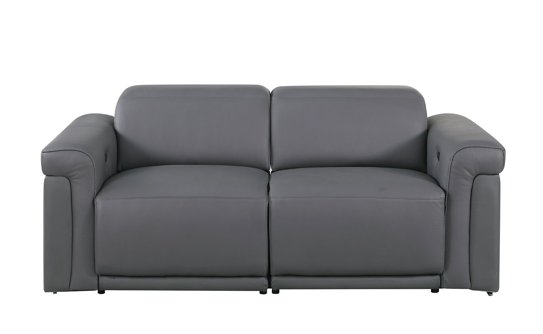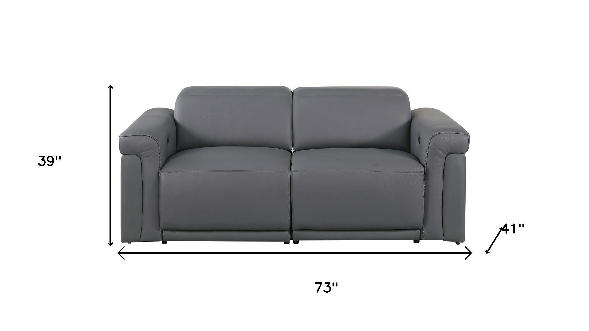An interior designer's dream, this buttery soft high grade leather 73-inch dark gray and black italian leather power reclining loveseat will bring just the right touch to your space. The high grade premium leather used makes your lounging luxuriously comfortable and adds an elegant appeal to your space. Rolled arms offer a comfy place to rest and give this piece some interest and shape. Black metal legs effortlessly elevate the room and add a touch of contemporary design. A great showpiece for your room, this sofa is a must have. 39.00-inch h x 73.00-inch w x 41.00-inch d.