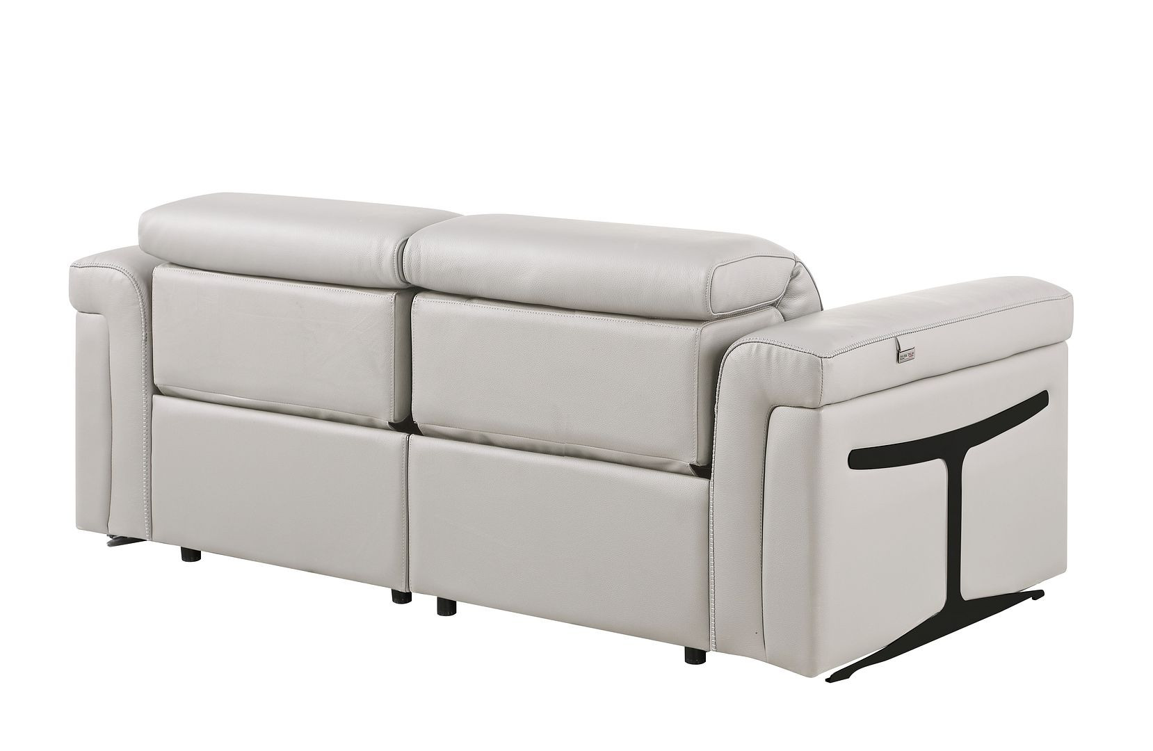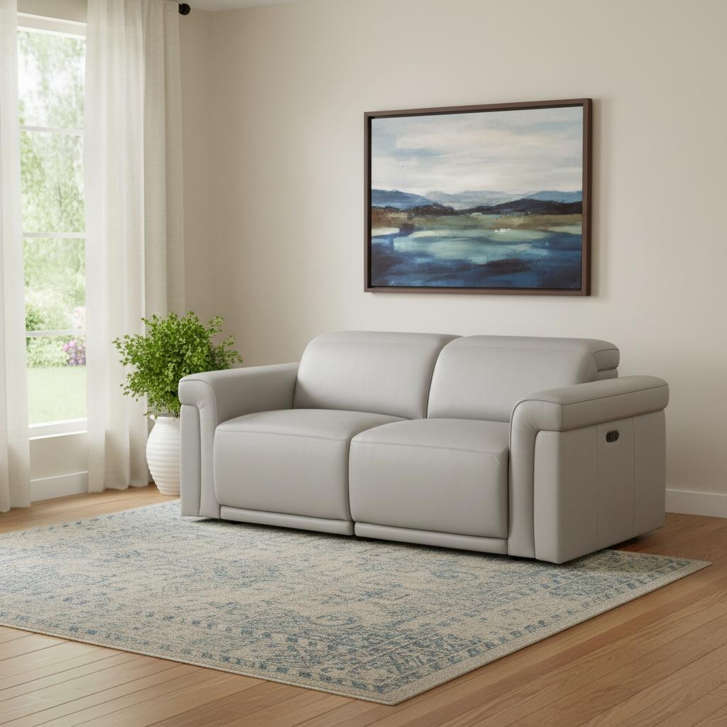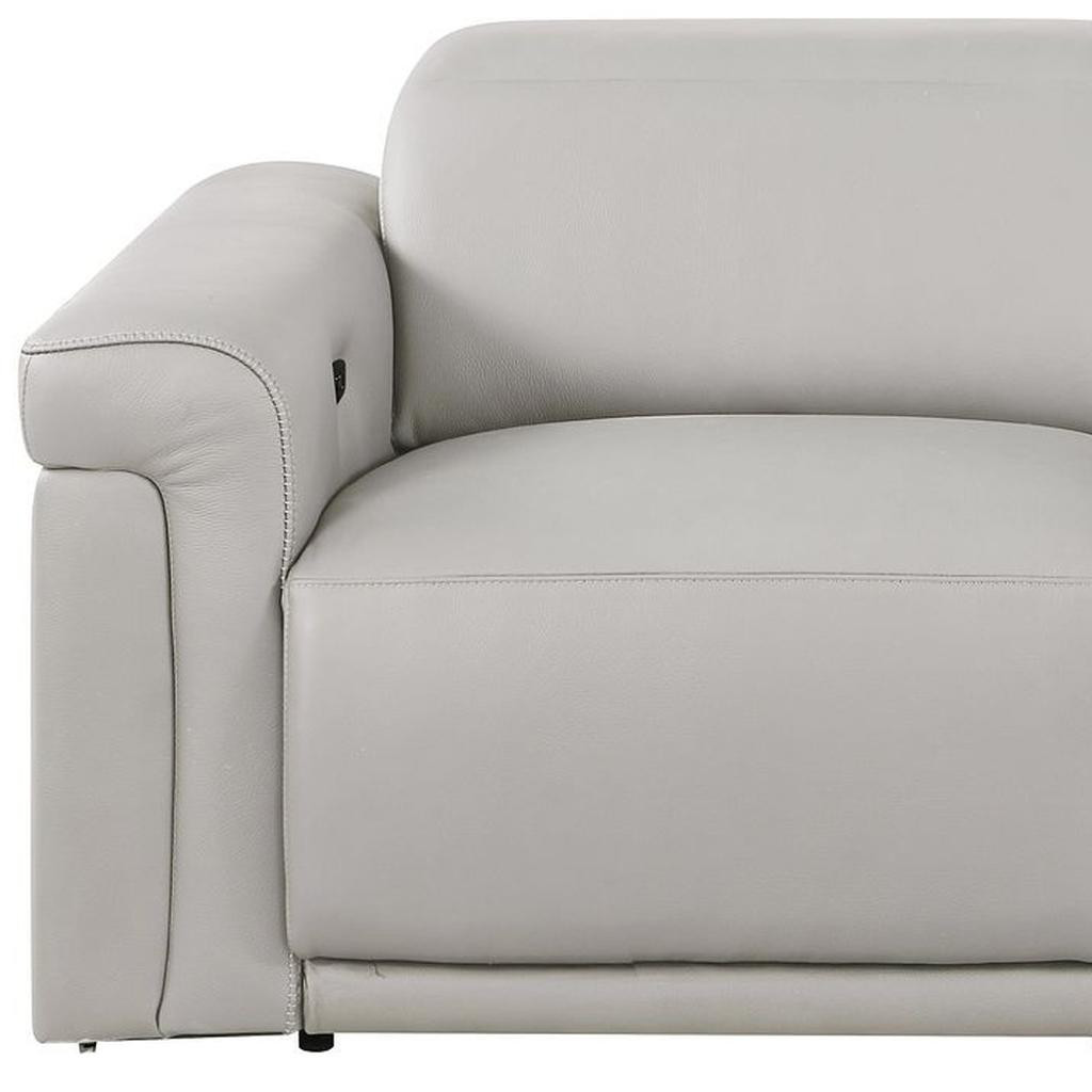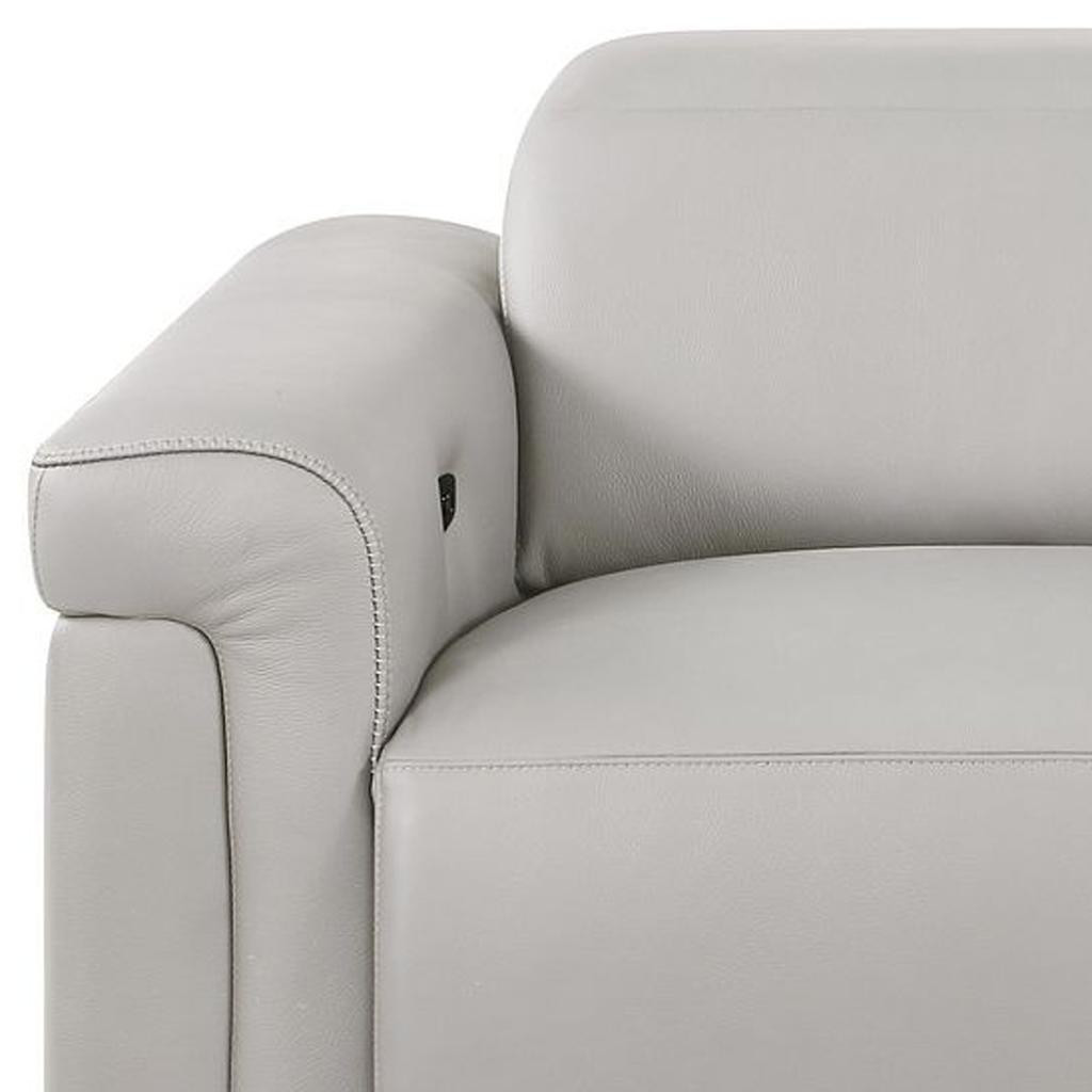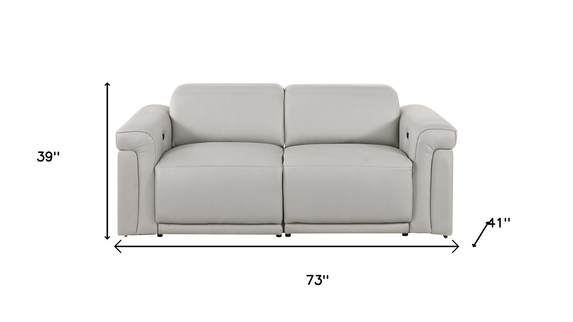 Made of top quality, supple leather, this 73-inch light gray and black italian leather power reclining loveseat will be the star of your space. The high grade premium leather used makes your lounging luxuriously comfortable and adds an elegant appeal to your space. Rolled arms offer a comfy place to rest and give this piece some interest and shape. Black metal legs effortlessly elevate the room and add a touch of contemporary design. A great showpiece for your room, this sofa is a must have. 39.00-inch h x 73.00-inch w x 41.00-inch d.