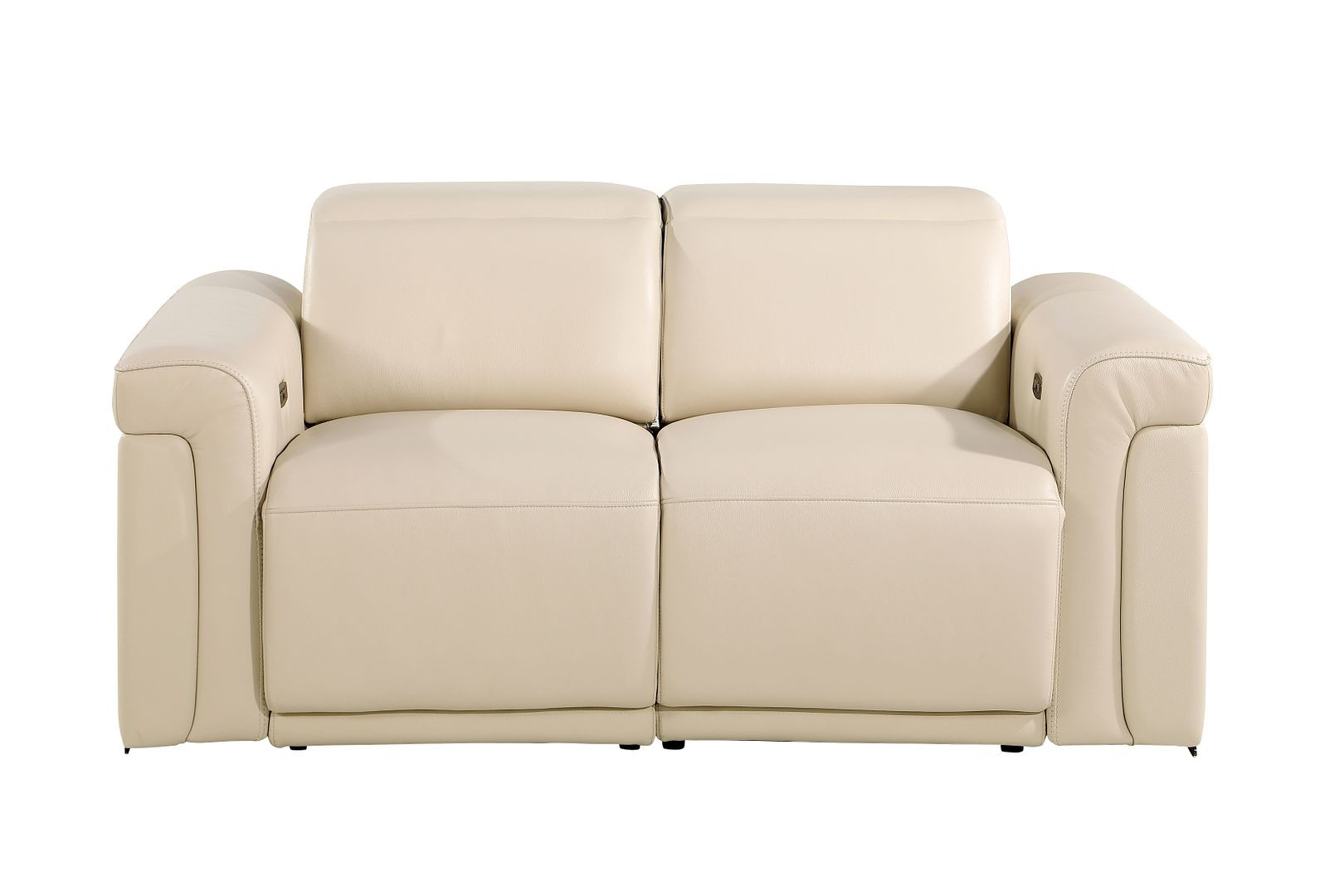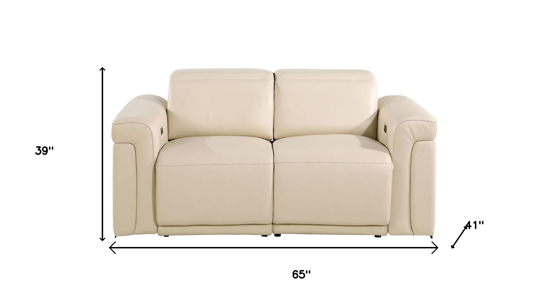 Made of top quality, supple leather, this 65-inch cream and black italian leather power reclining loveseat will be the star of your space. The high grade premium leather used makes your lounging luxuriously comfortable and adds an elegant appeal to your space. Rolled arms offer a comfy place to rest and give this piece some interest and shape. Black metal legs effortlessly elevate the room and add a touch of contemporary design. A great showpiece for your room, this sofa is a must have. 39.00-inch h x 65.00-inch w x 41.00-inch d.