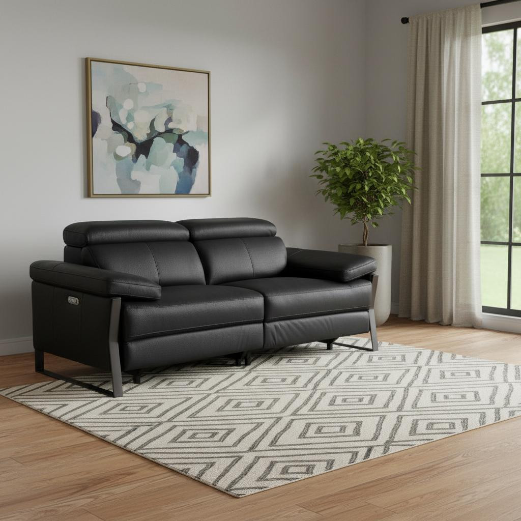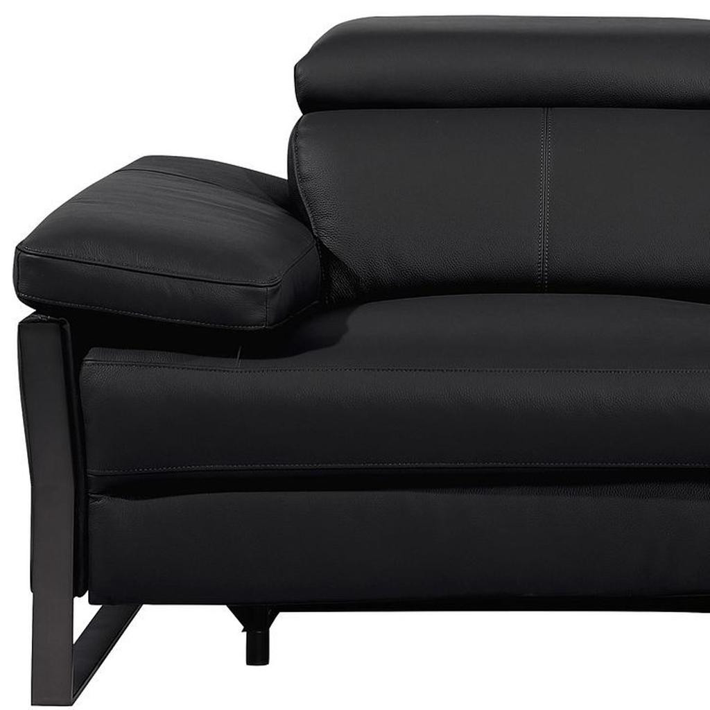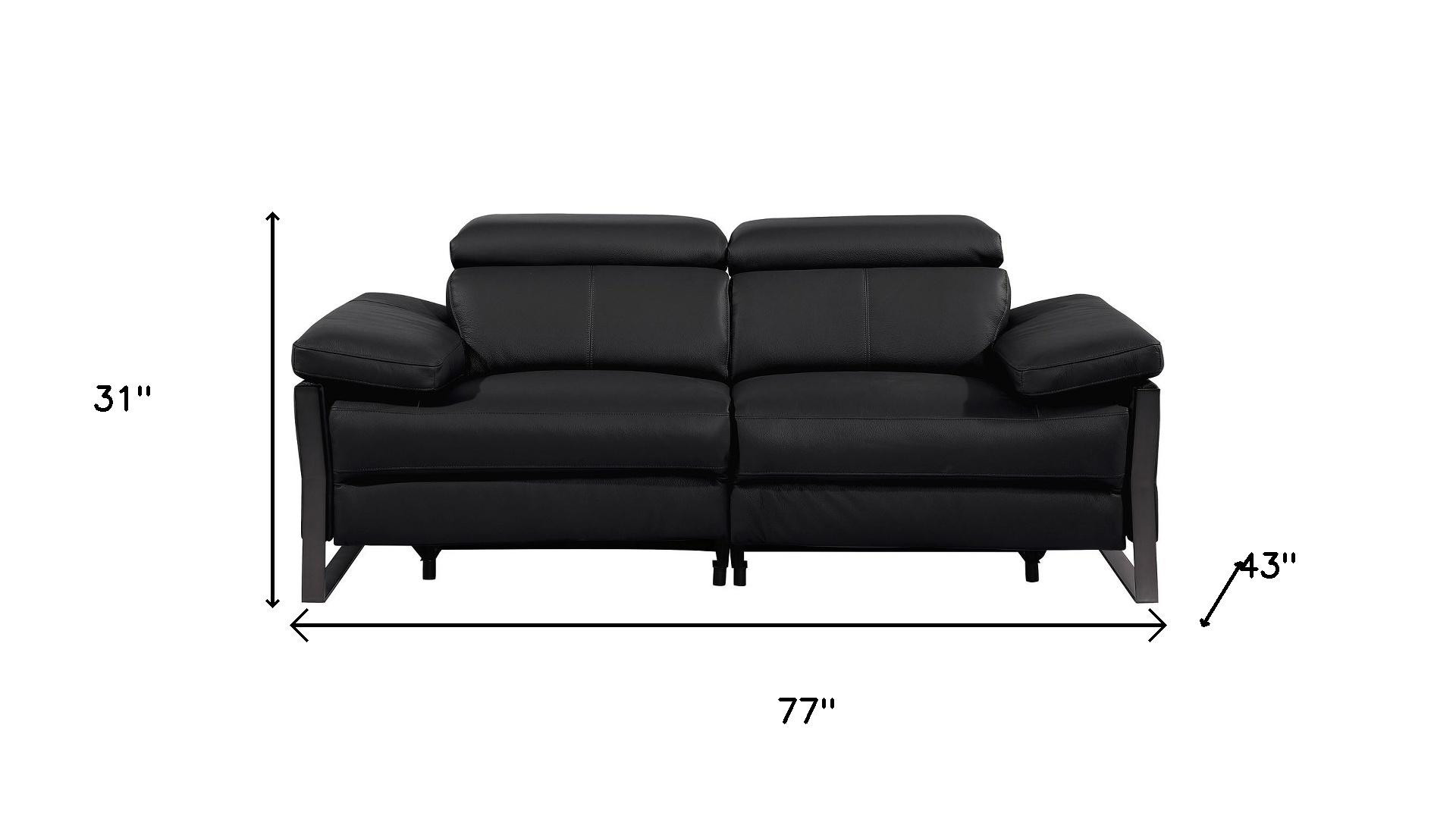 Made of top quality, supple leather, this 77-inch black italian leather power reclining loveseat will be the star of your space. The high grade premium leather used makes your lounging luxuriously comfortable and adds an elegant appeal to your space. Rolled arms offer a comfy place to rest and give this piece some interest and shape. Black metal legs effortlessly elevate the room and add a touch of contemporary design. A great showpiece for your room, this sofa is a must have. 31.00-inch h x 77.00-inch w x 43.00-inch d.