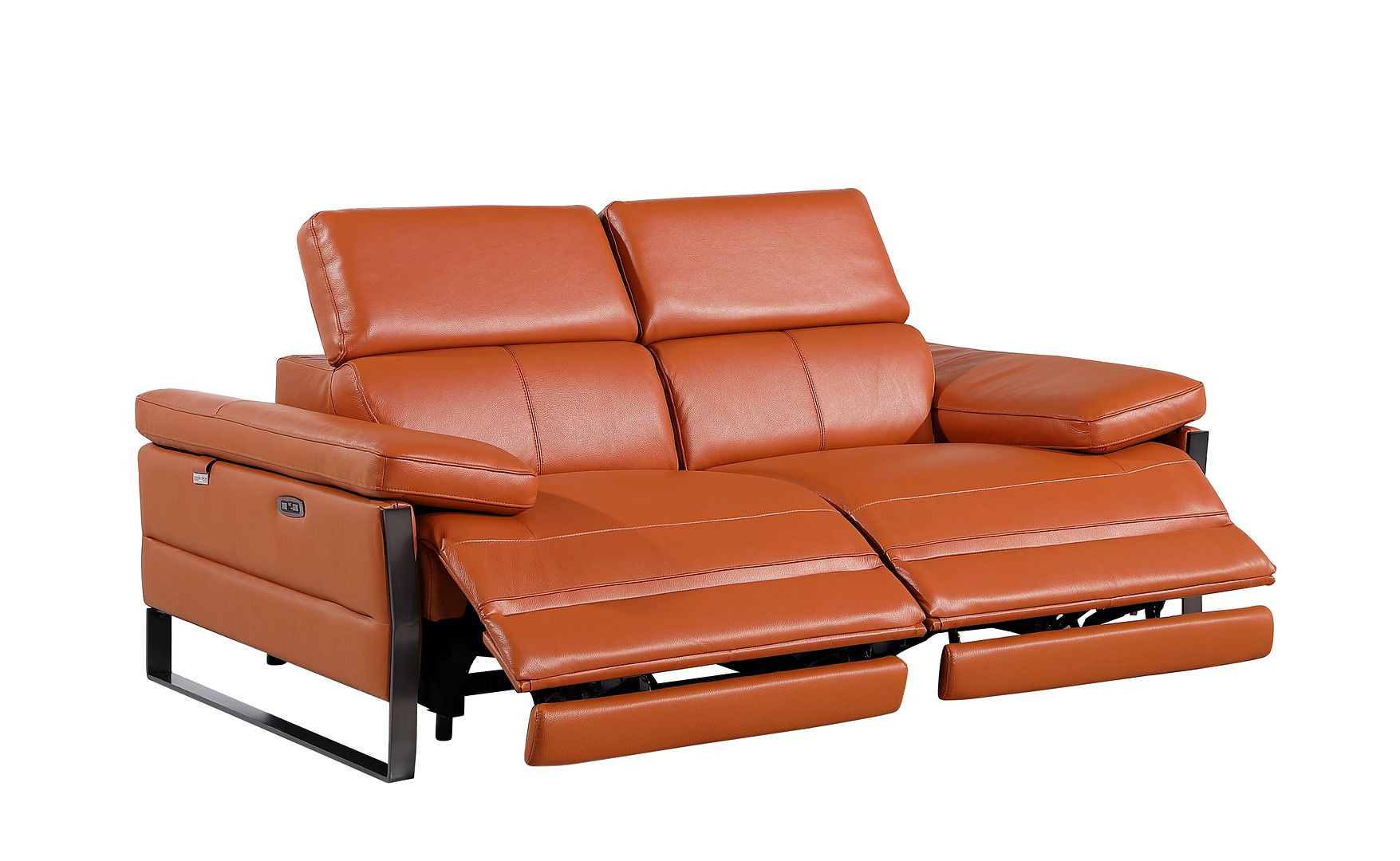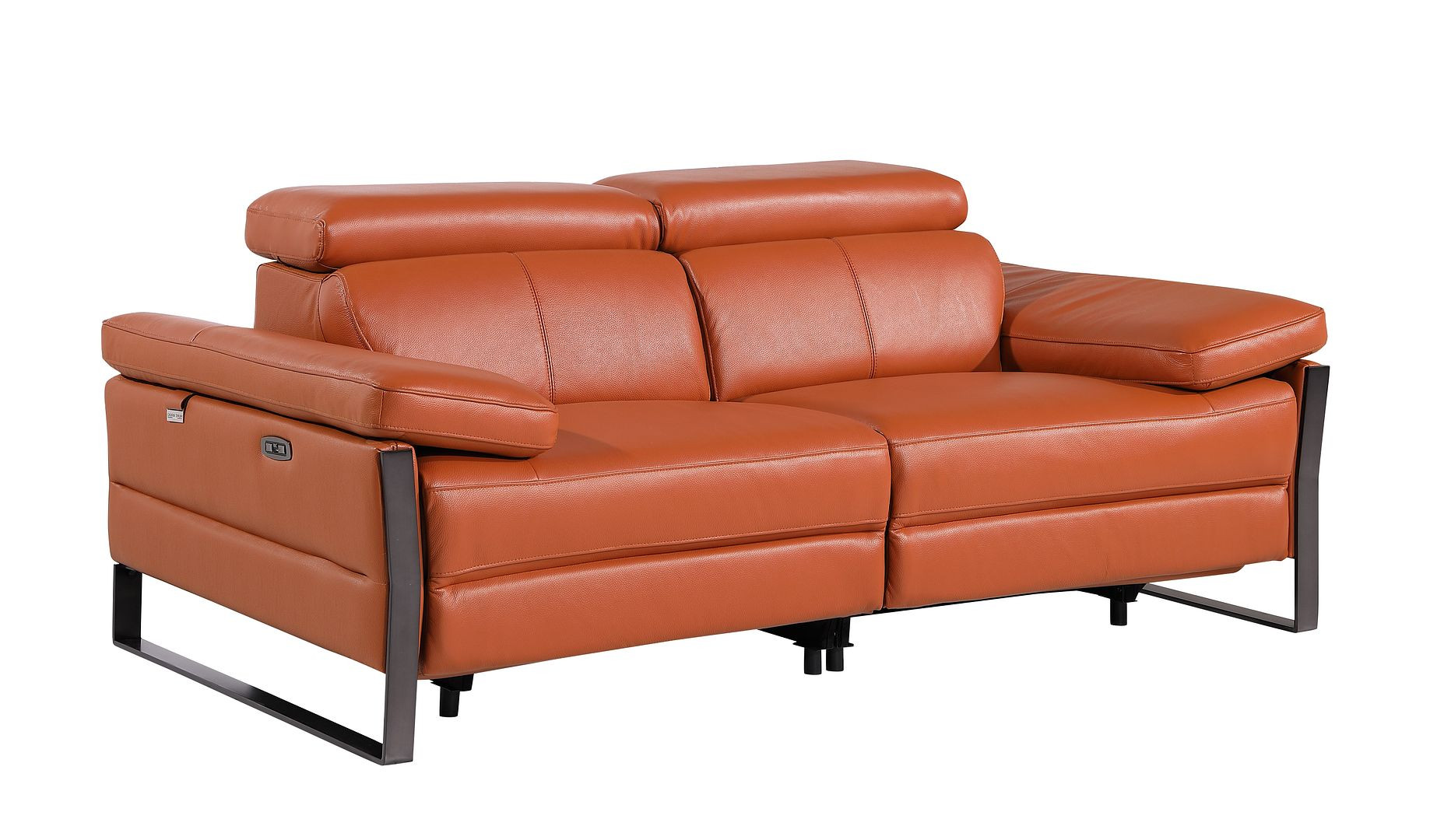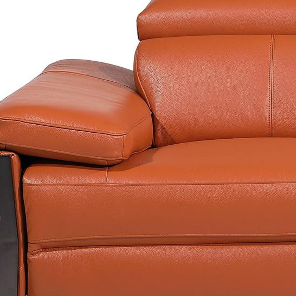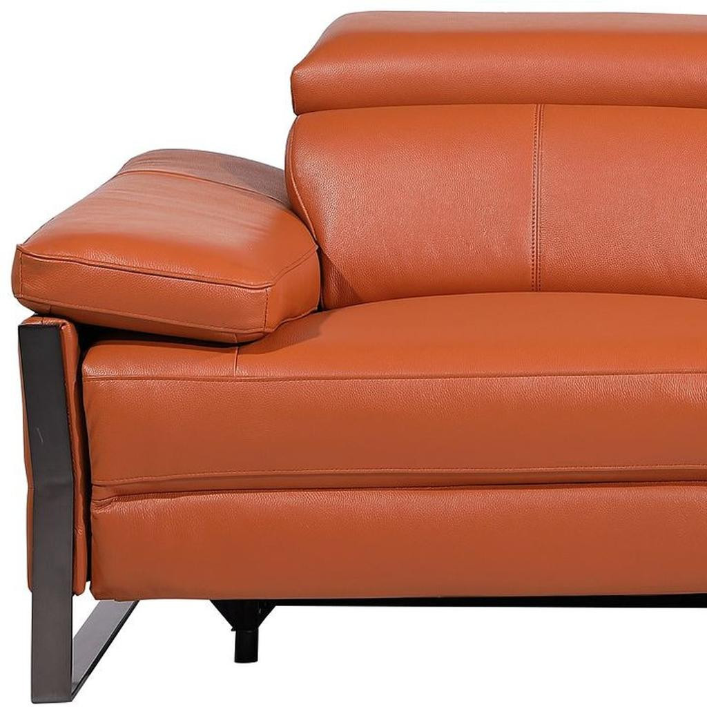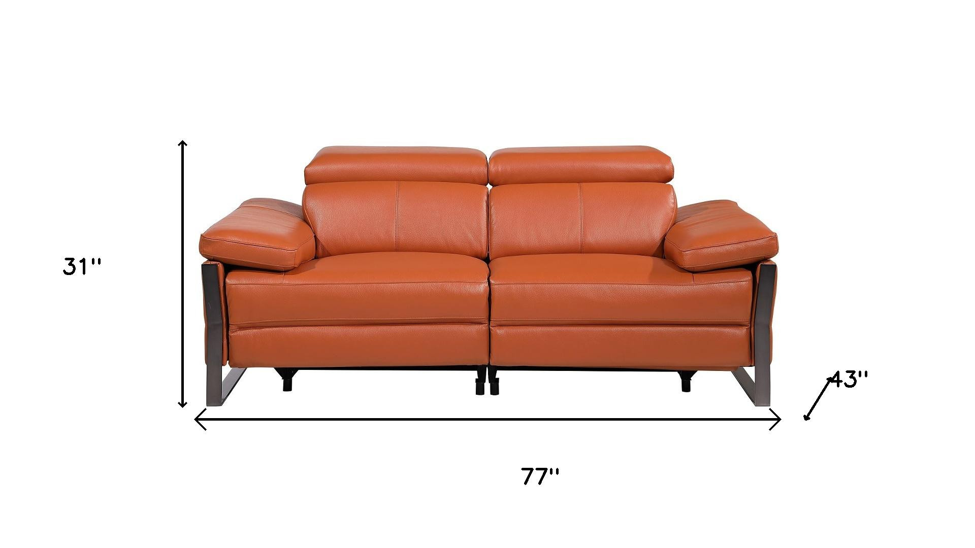 Made of top quality, supple leather, this 77-inch orange and black italian leather power reclining loveseat will be the star of your space. The high grade premium leather used makes your lounging luxuriously comfortable and adds an elegant appeal to your space. Rolled arms offer a comfy place to rest and give this piece some interest and shape. Black metal legs effortlessly elevate the room and add a touch of contemporary design. A great showpiece for your room, this sofa is a must have. 31.00-inch h x 77.00-inch w x 43.00-inch d.