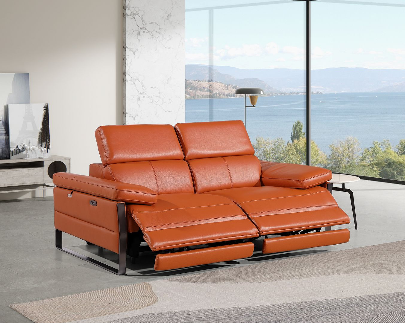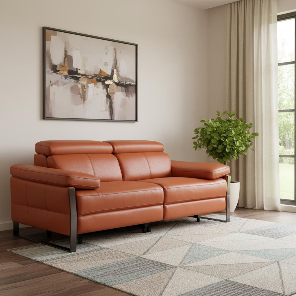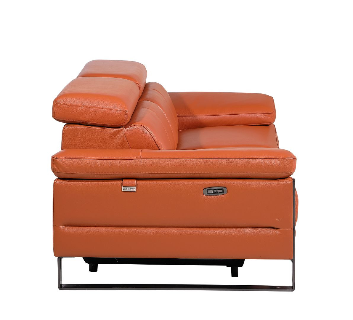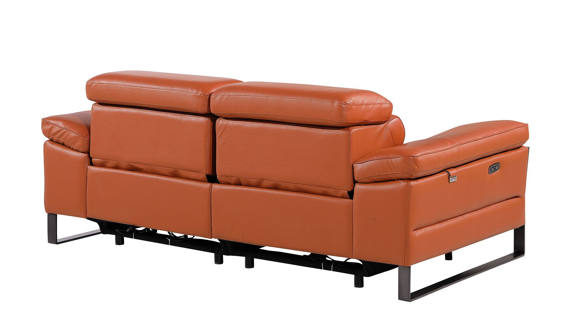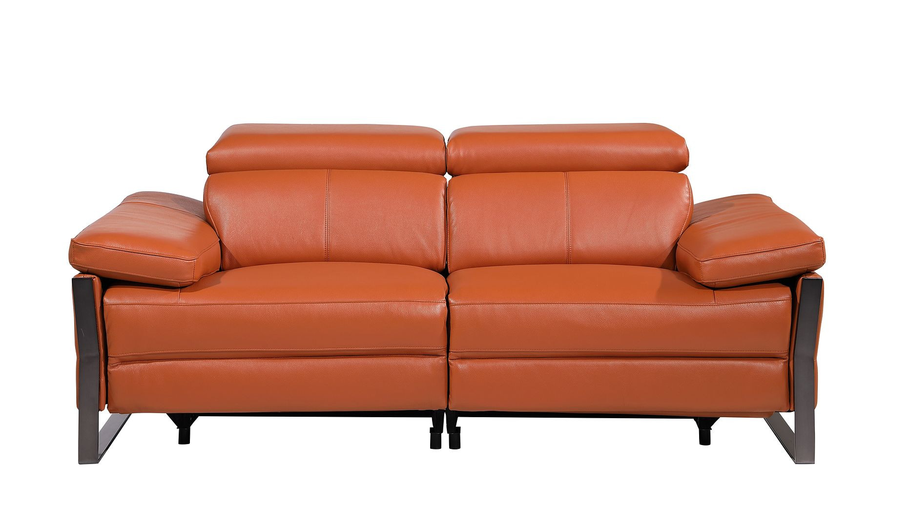 Made of top quality, supple leather, this 77-inch orange and black italian leather power reclining loveseat will be the star of your space. The high grade premium leather used makes your lounging luxuriously comfortable and adds an elegant appeal to your space. Rolled arms offer a comfy place to rest and give this piece some interest and shape. Black metal legs effortlessly elevate the room and add a touch of contemporary design. A great showpiece for your room, this sofa is a must have. 31.00-inch h x 77.00-inch w x 43.00-inch d.