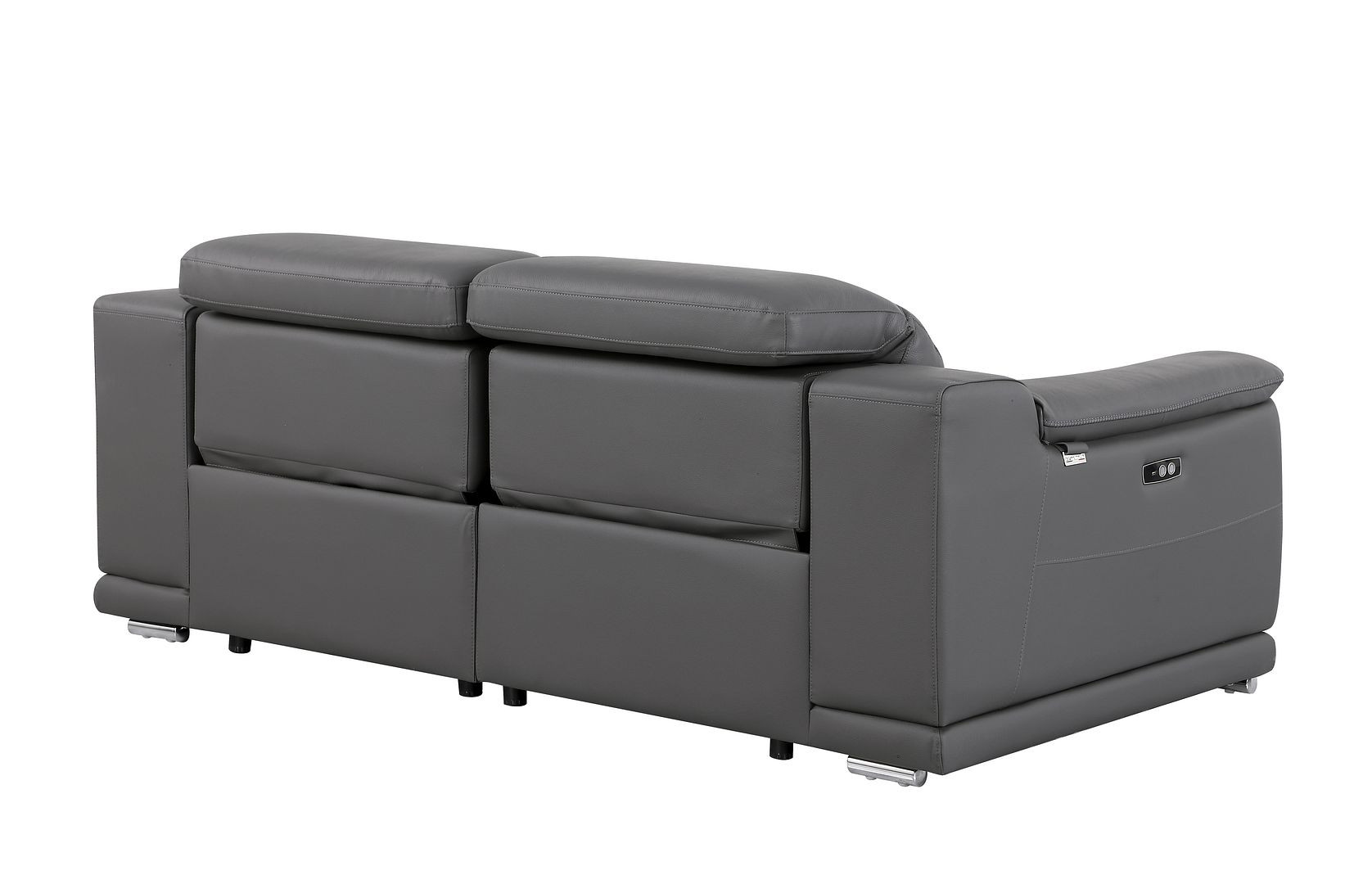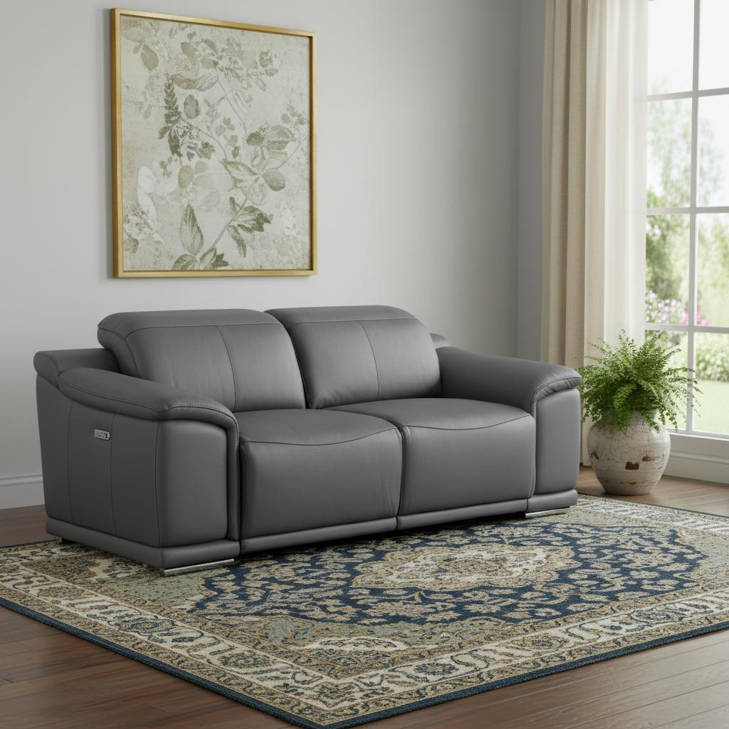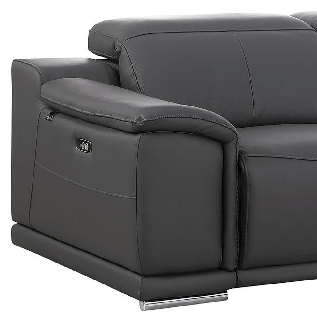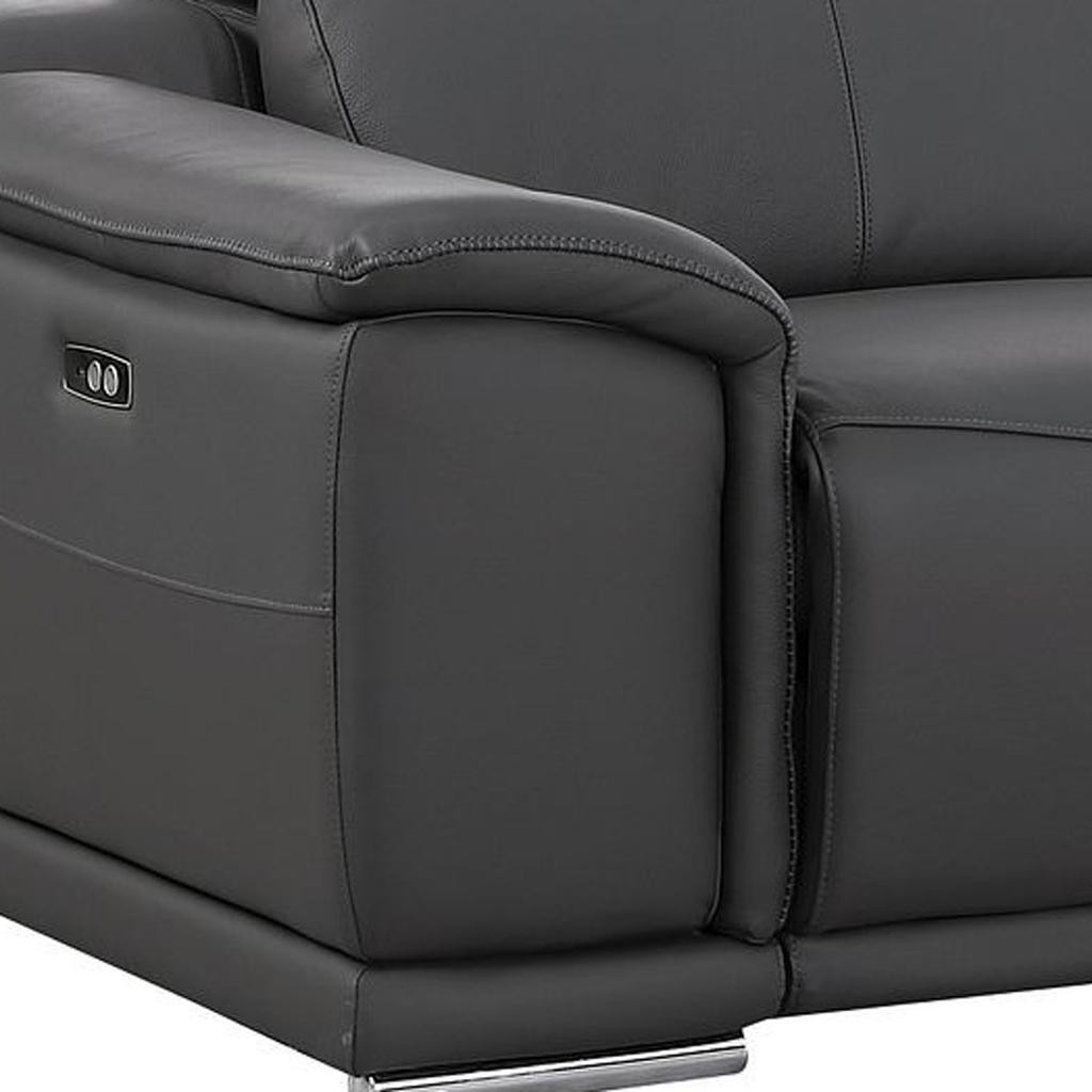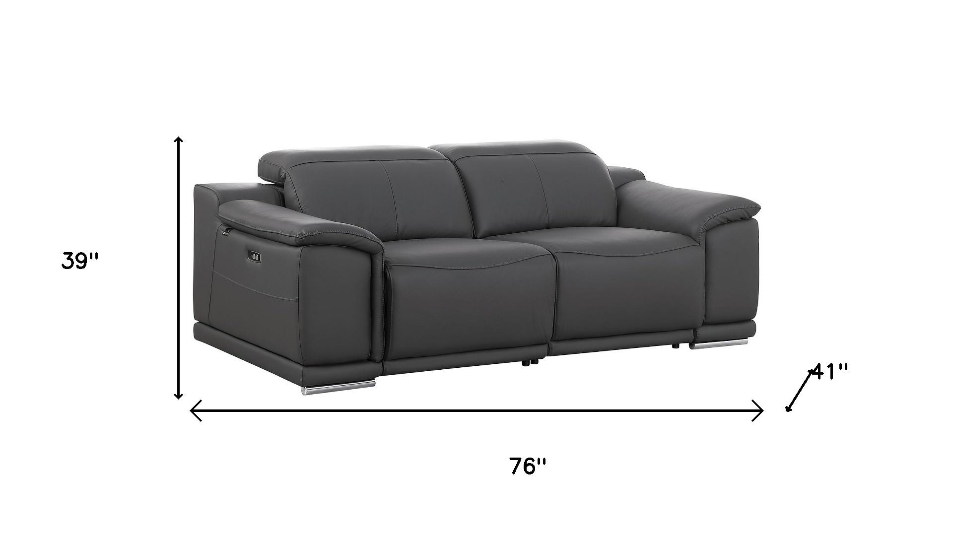 Superior construction from fabulously soft and high grade leather gives this 76-inch dark gray and silver italian leather power reclining loveseat a leg up on the competition. The high grade premium leather used makes your lounging luxuriously comfortable and adds an elegant appeal to your space. Rolled arms offer a comfy place to rest and give this piece some interest and shape. Silver metal legs effortlessly elevate the room and add a touch of contemporary design. A great showpiece for your room, this sofa is a must have. 39.00-inch h x 76.00-inch w x 41.00-inch d.