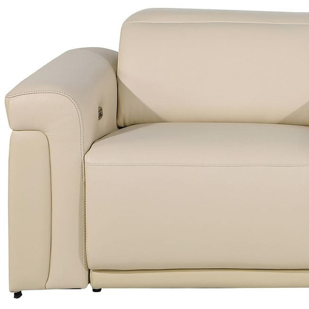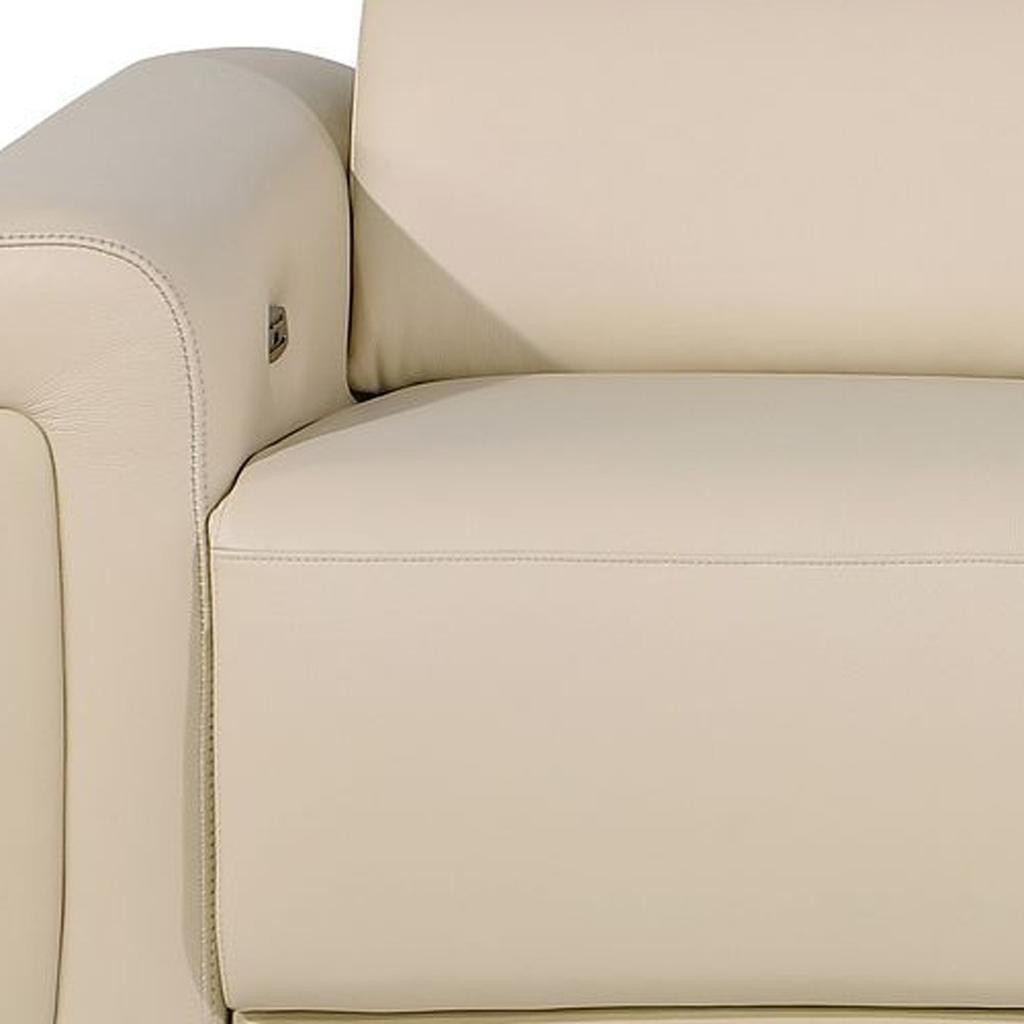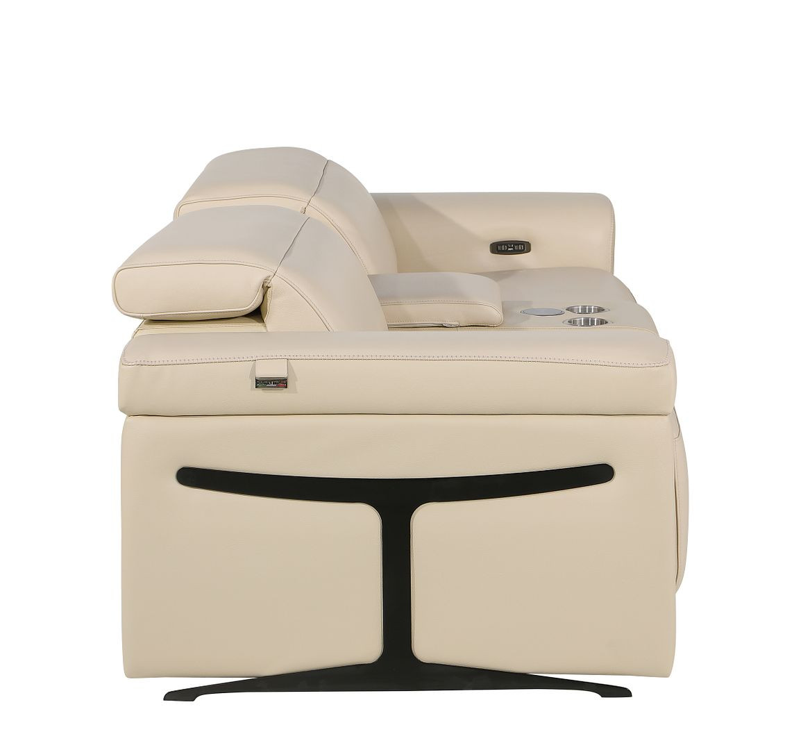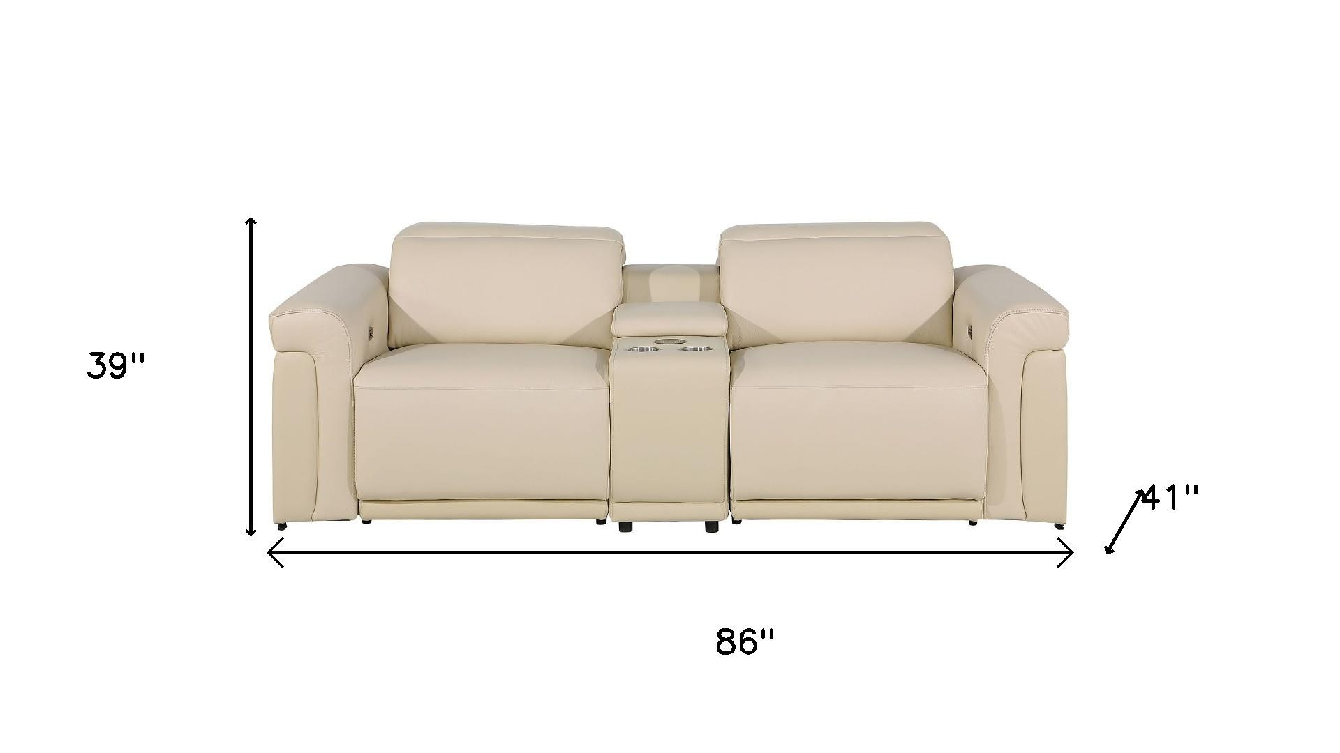Superior construction from fabulously soft and high grade leather gives this 86-inch cream and black italian leather power reclining loveseat with storage a leg up on the competition. The high grade premium leather used makes your lounging luxuriously comfortable and adds an elegant appeal to your space. Rolled arms offer a comfy place to rest and give this piece some interest and shape. Black metal legs effortlessly elevate the room and add a touch of contemporary design. A great showpiece for your room, this sofa is a must have. 39.00-inch h x 86.00-inch w x 41.00-inch d.