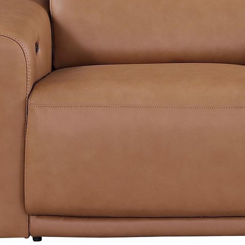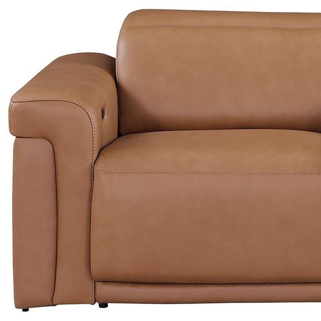 Made of top quality, supple leather, this 86-inch chestnut and black italian leather power reclining loveseat with storage will be the star of your space. The high grade premium leather used makes your lounging luxuriously comfortable and adds an elegant appeal to your space. Rolled arms offer a comfy place to rest and give this piece some interest and shape. Black metal legs effortlessly elevate the room and add a touch of contemporary design. A great showpiece for your room, this sofa is a must have. 39.00-inch h x 86.00-inch w x 41.00-inch d.
