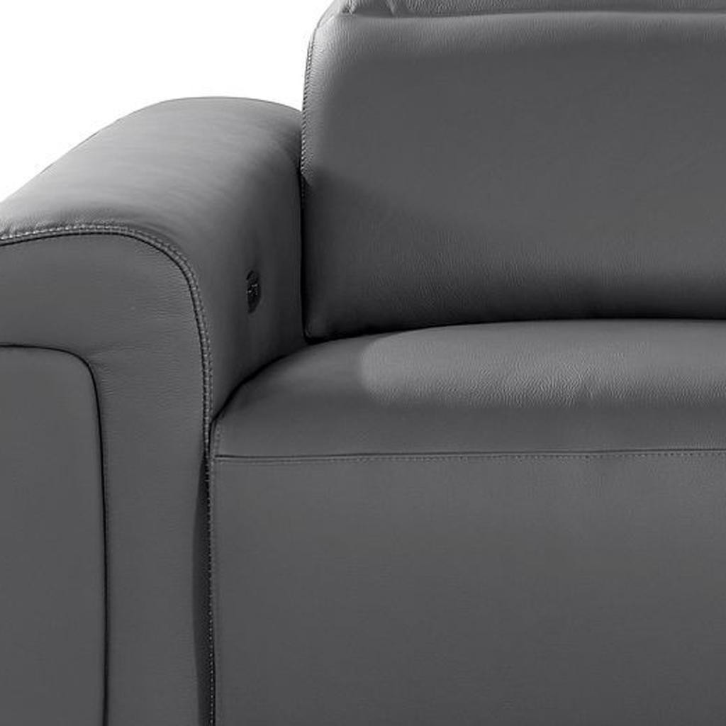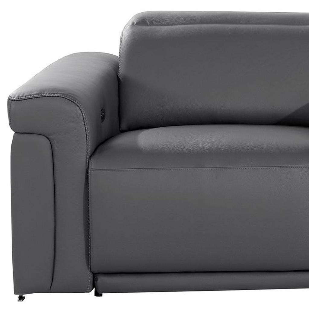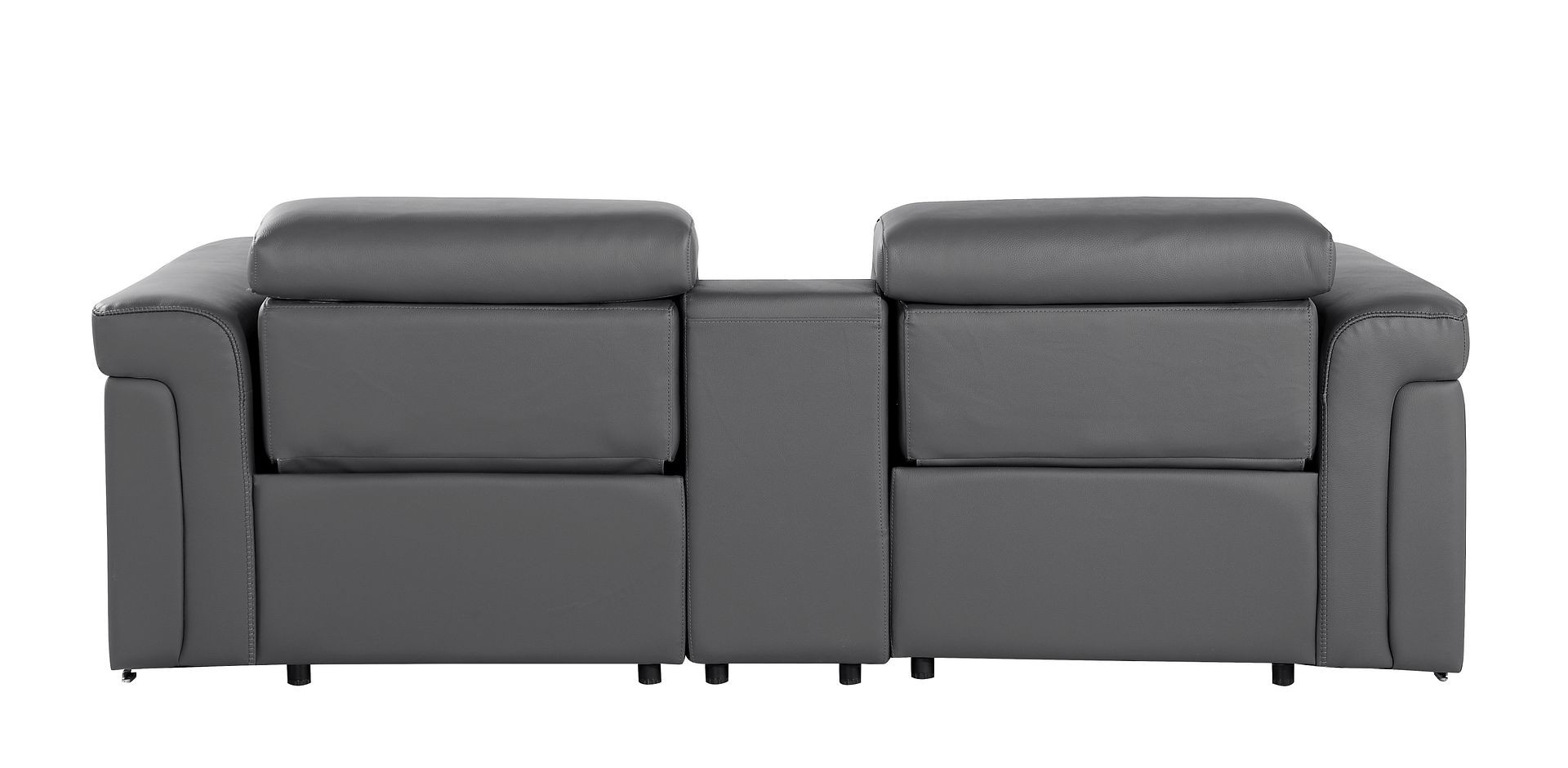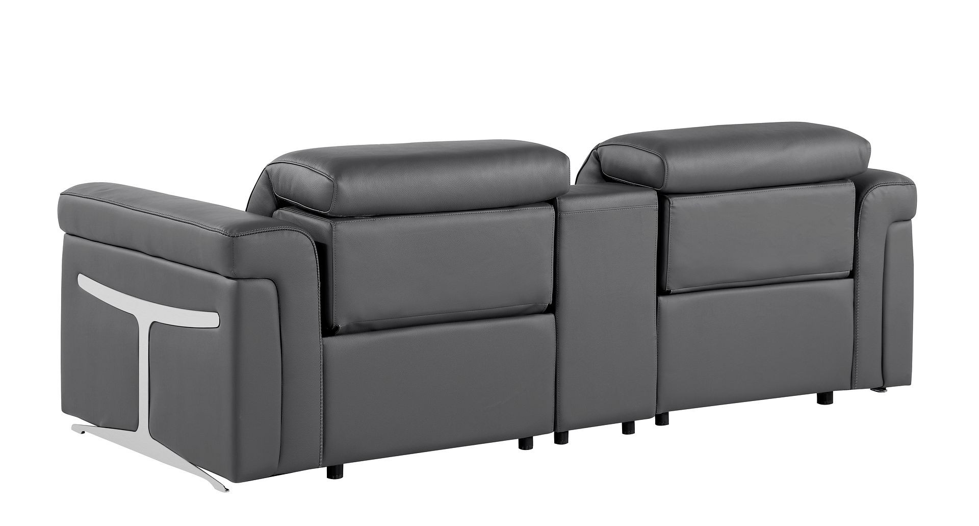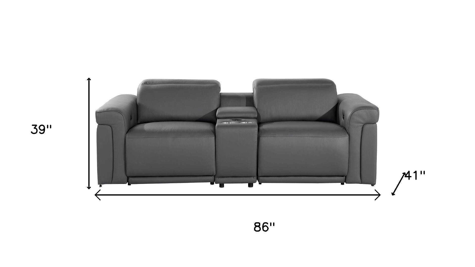 Superior construction from fabulously soft and high grade leather gives this 86-inch dark gray and black italian leather power reclining loveseat with storage a leg up on the competition. The high grade premium leather used makes your lounging luxuriously comfortable and adds an elegant appeal to your space. Rolled arms offer a comfy place to rest and give this piece some interest and shape. Black metal legs effortlessly elevate the room and add a touch of contemporary design. A great showpiece for your room, this sofa is a must have. 39.00-inch h x 86.00-inch w x 41.00-inch d.