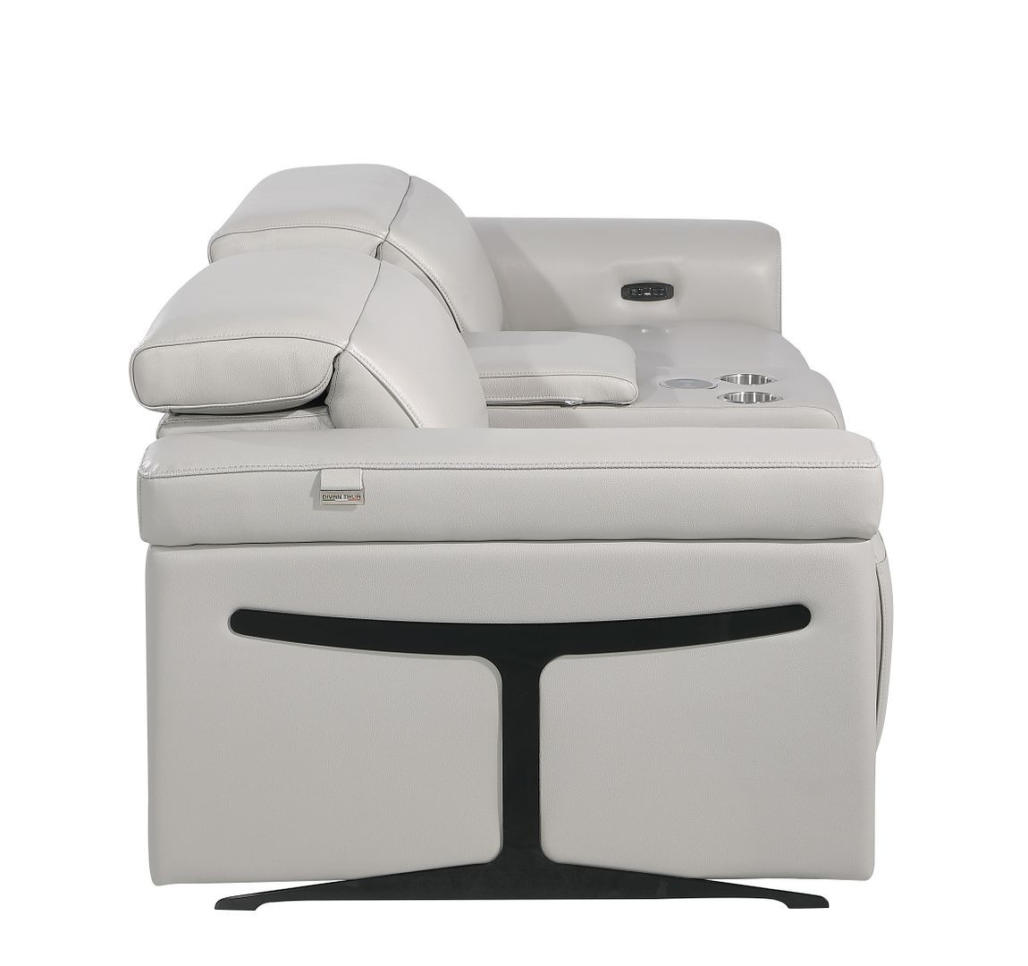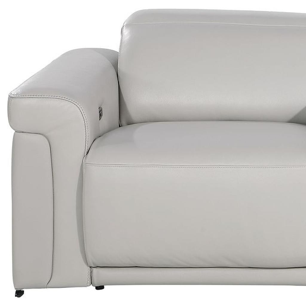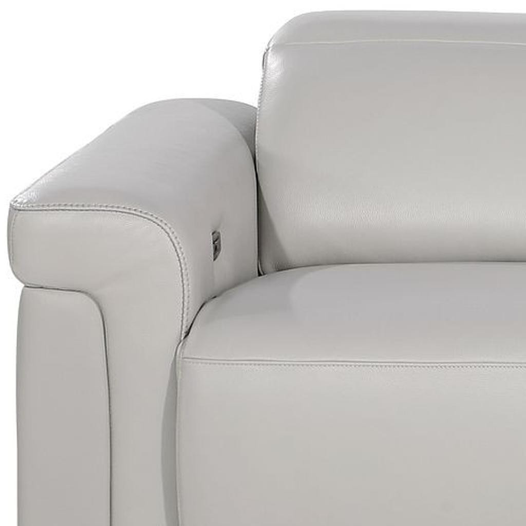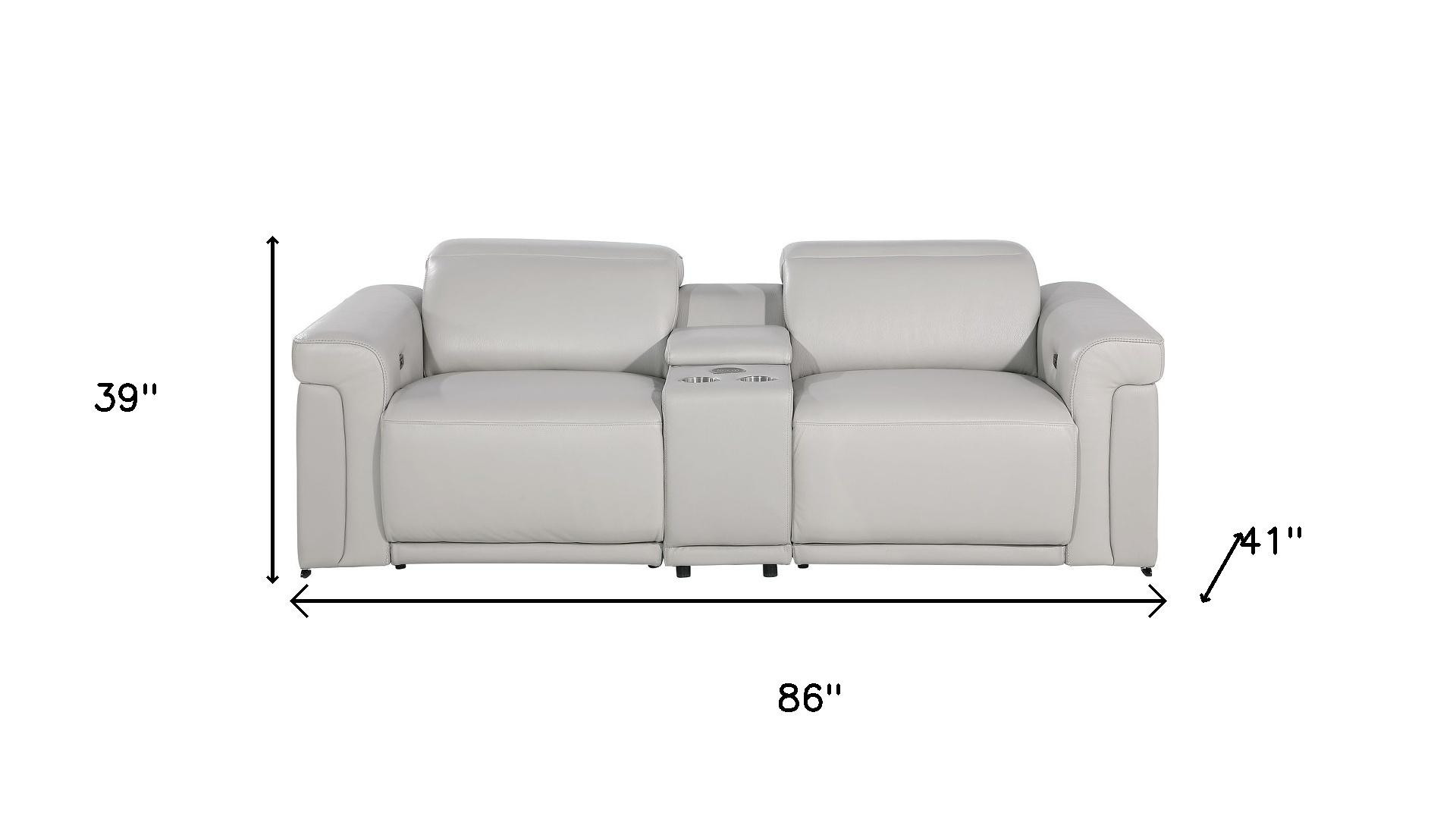 An interior designer's dream, this buttery soft high grade leather 86-inch light gray and black italian leather power reclining loveseat with storage will bring just the right touch to your space. The high grade premium leather used makes your lounging luxuriously comfortable and adds an elegant appeal to your space. Rolled arms offer a comfy place to rest and give this piece some interest and shape. Black metal legs effortlessly elevate the room and add a touch of contemporary design. A great showpiece for your room, this sofa is a must have. 39.00-inch h x 86.00-inch w x 41.00-inch d.