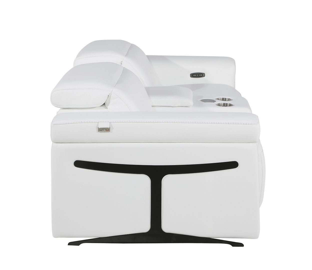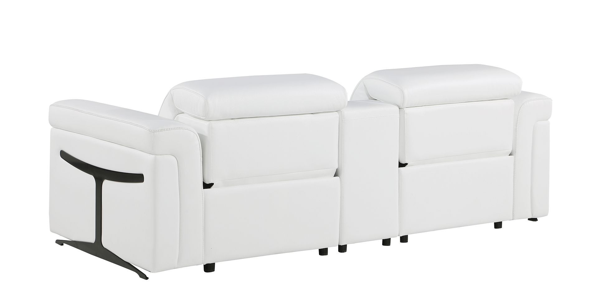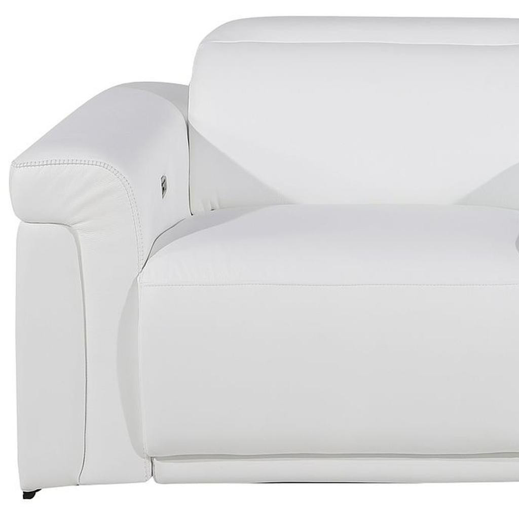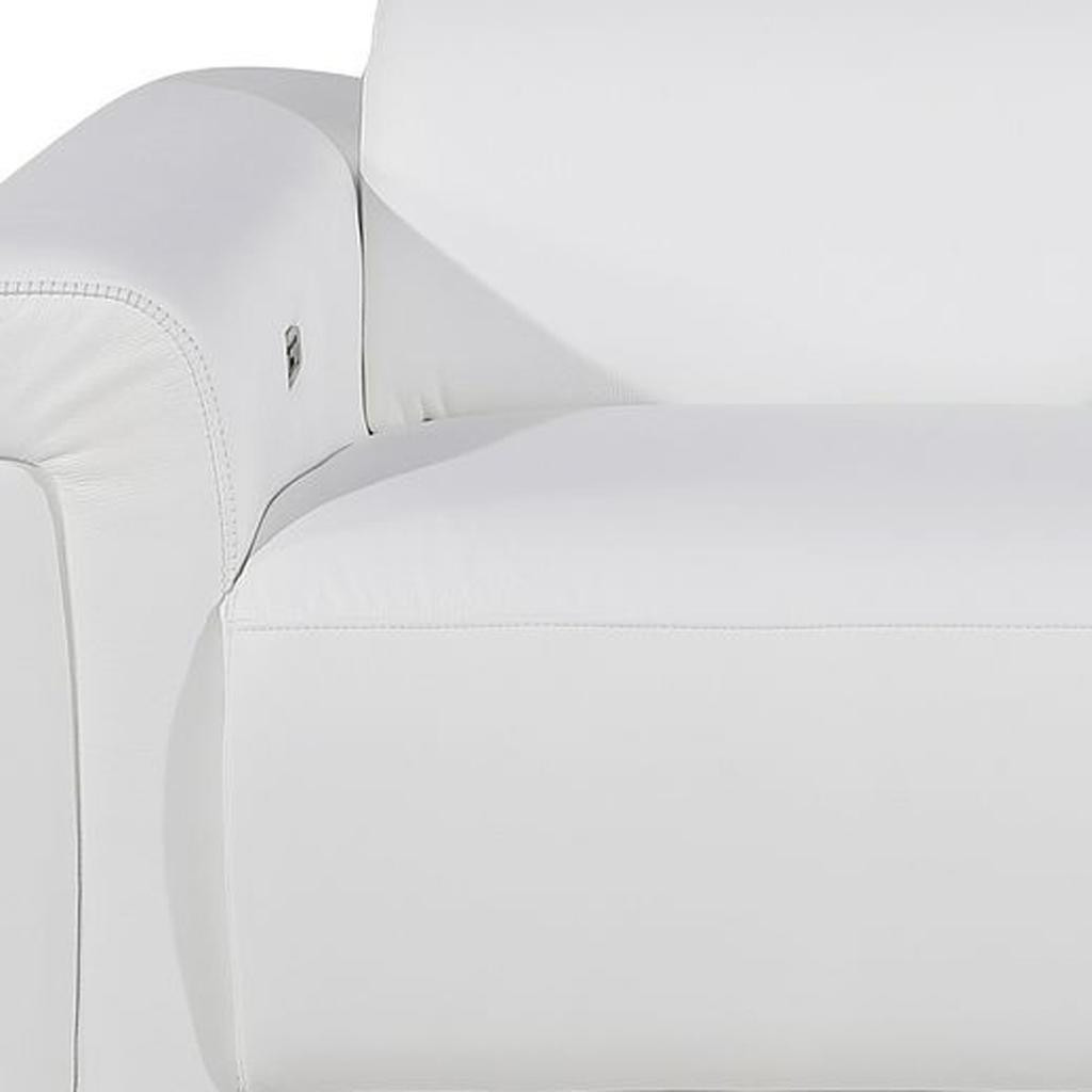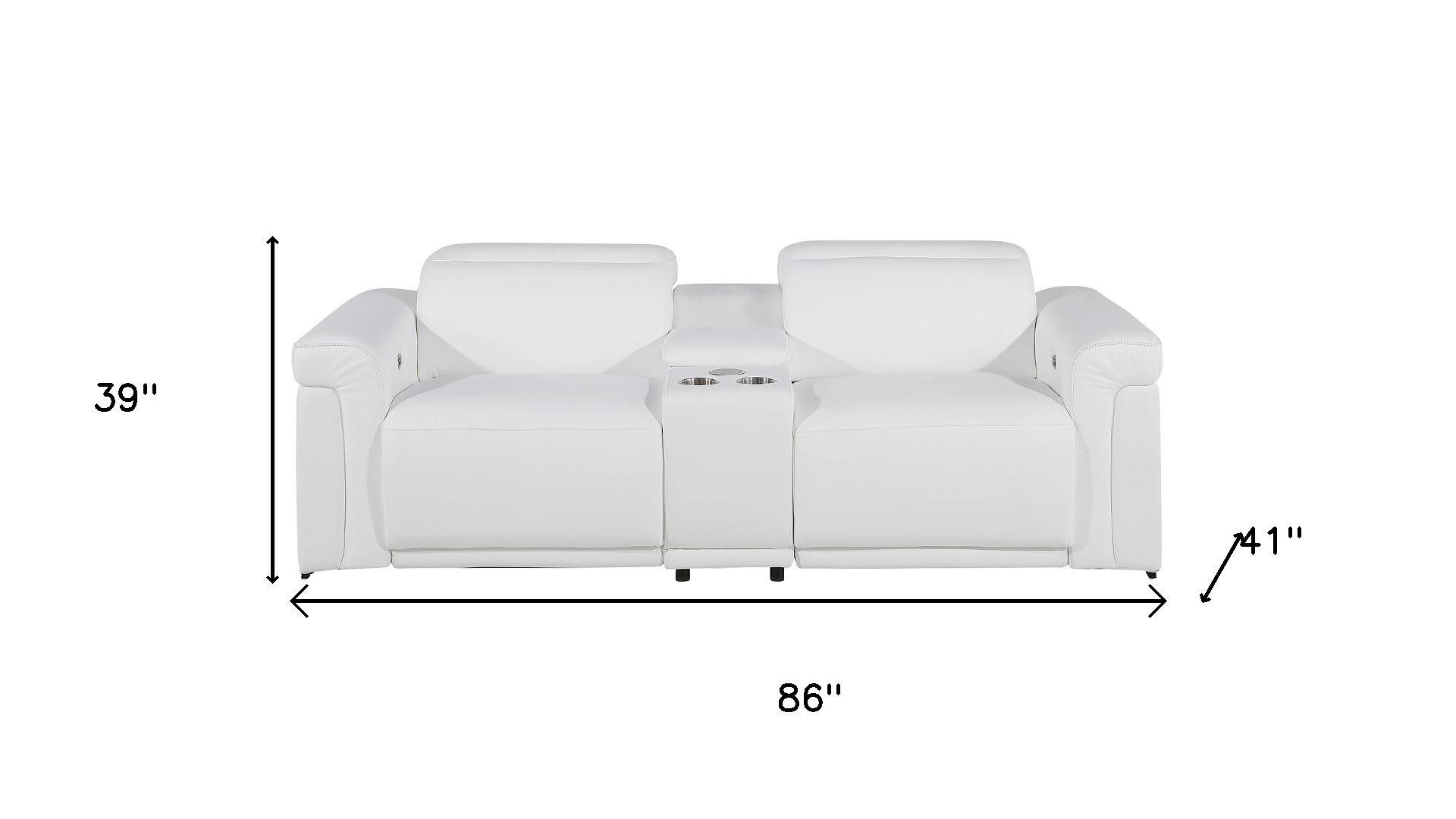 An interior designer's dream, this buttery soft high grade leather 86-inch white and black italian leather power reclining loveseat with storage will bring just the right touch to your space. The high grade premium leather used makes your lounging luxuriously comfortable and adds an elegant appeal to your space. Rolled arms offer a comfy place to rest and give this piece some interest and shape. Black metal legs effortlessly elevate the room and add a touch of contemporary design. A great showpiece for your room, this sofa is a must have. 39.00-inch h x 86.00-inch w x 41.00-inch d.